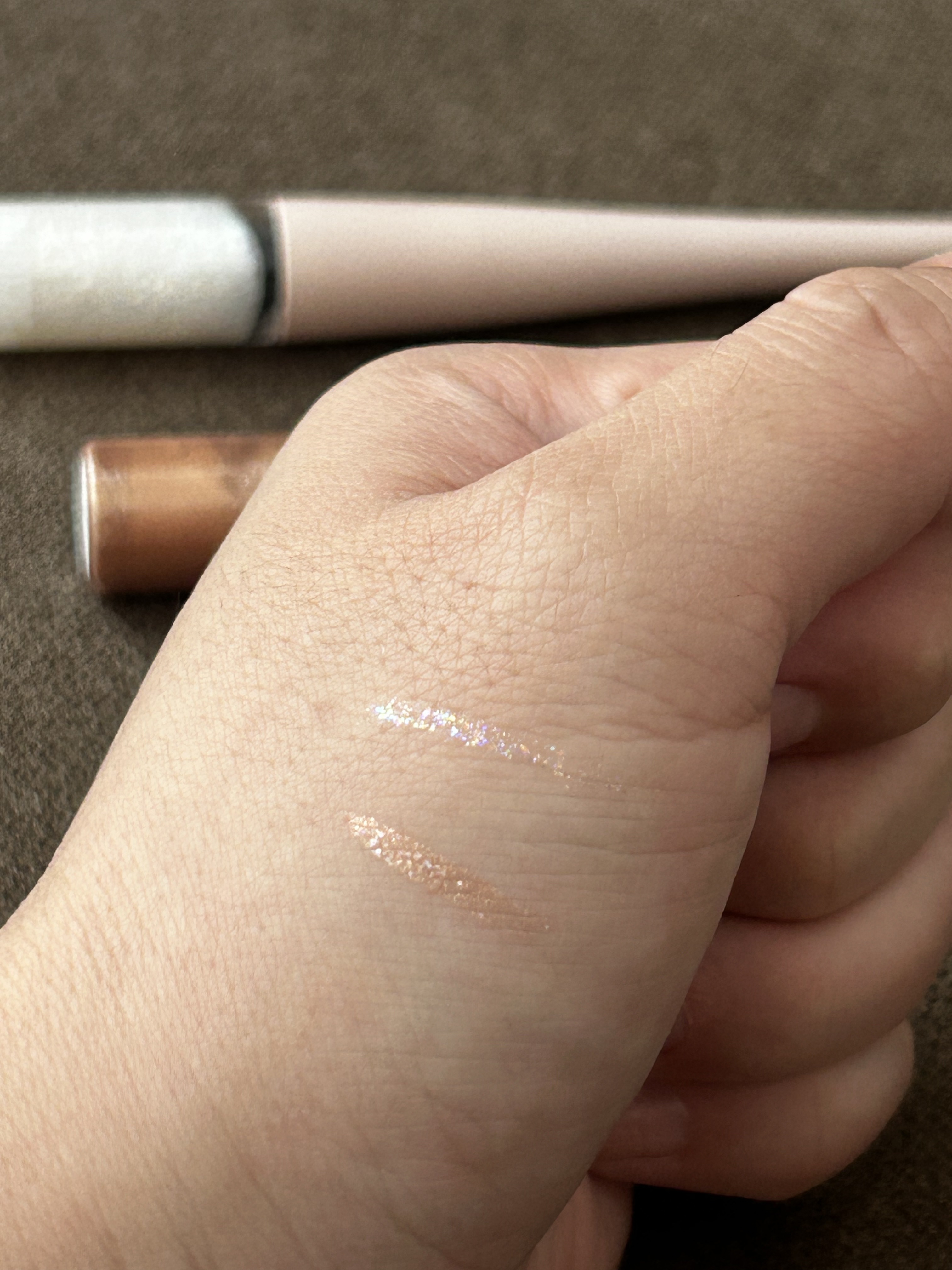筆が細いので細かく調節がしやすく肌にピタッと速乾で密着してくれてアイラインとして使っても散らない👌🏻 ローズピンクが1番落ち着いて見えて大粒のラメが入ってるけど色もピンクなのでぎらつかない💗 スノークリアは多彩ラメ・パールでベースが透明なので反射するときの光り方が多彩なのでキラッと透明感がある🤍 シャンパンベージュが1番肌なじみがよさそうな色しててベージュの中にシルバーのラメなので意外とキラキラ感がある❕ グリッターでも、ベースカラーがしっかりあるタイプローズピンク・シャンパンベージュはぼかしてアイシャドウにも使えそう🙆🏻♀️ スノークリアはちょんッとつけて多彩ラメをチラッと見せるのもいいかも✨ お湯オフが可能なので落とすのが楽🫶🏻 色によって雰囲気も変わるのでメイクで色を合わせてもいいかも😘