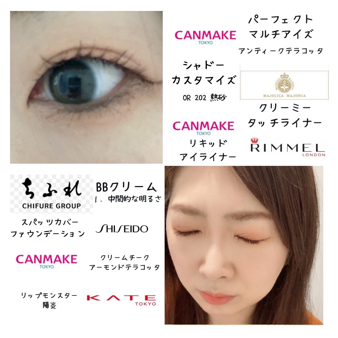 オレンジ系ブラウンはイエベ秋鉄板カラーだと思ってます😊 053キャラメルオレンジをアイホールに。控えめな発色だからナチュラルメイクにちょうど良さそう。 パーフェクトマルチアイズは右上のカラーを下まぶた目尻1/3に入れたあとゴージャス姉妹でブレンディング。 アイラインはジェルアイライナーで跳ね上げラインを描いた後パーフェクトマルチアイズの右下の1番濃い色でなぞってみました。