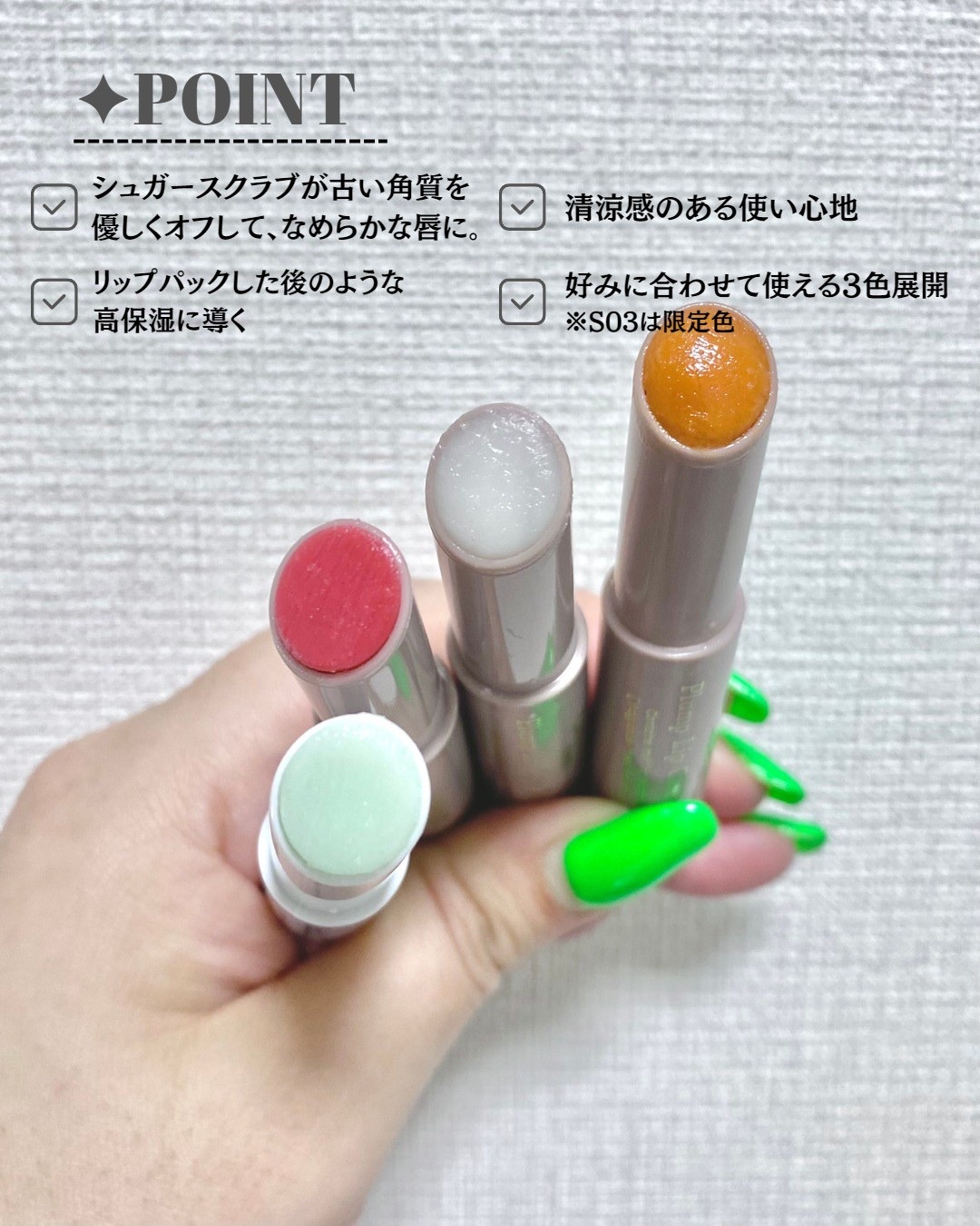 粒が大きすぎなくて塗りやすい プランプ効果も少しあるから、より縦じわにいい 03みかんイエローの方は色がほんのり付く サッと塗るのにちょうどいいコスメ 縦じわが気になる人にオススメ