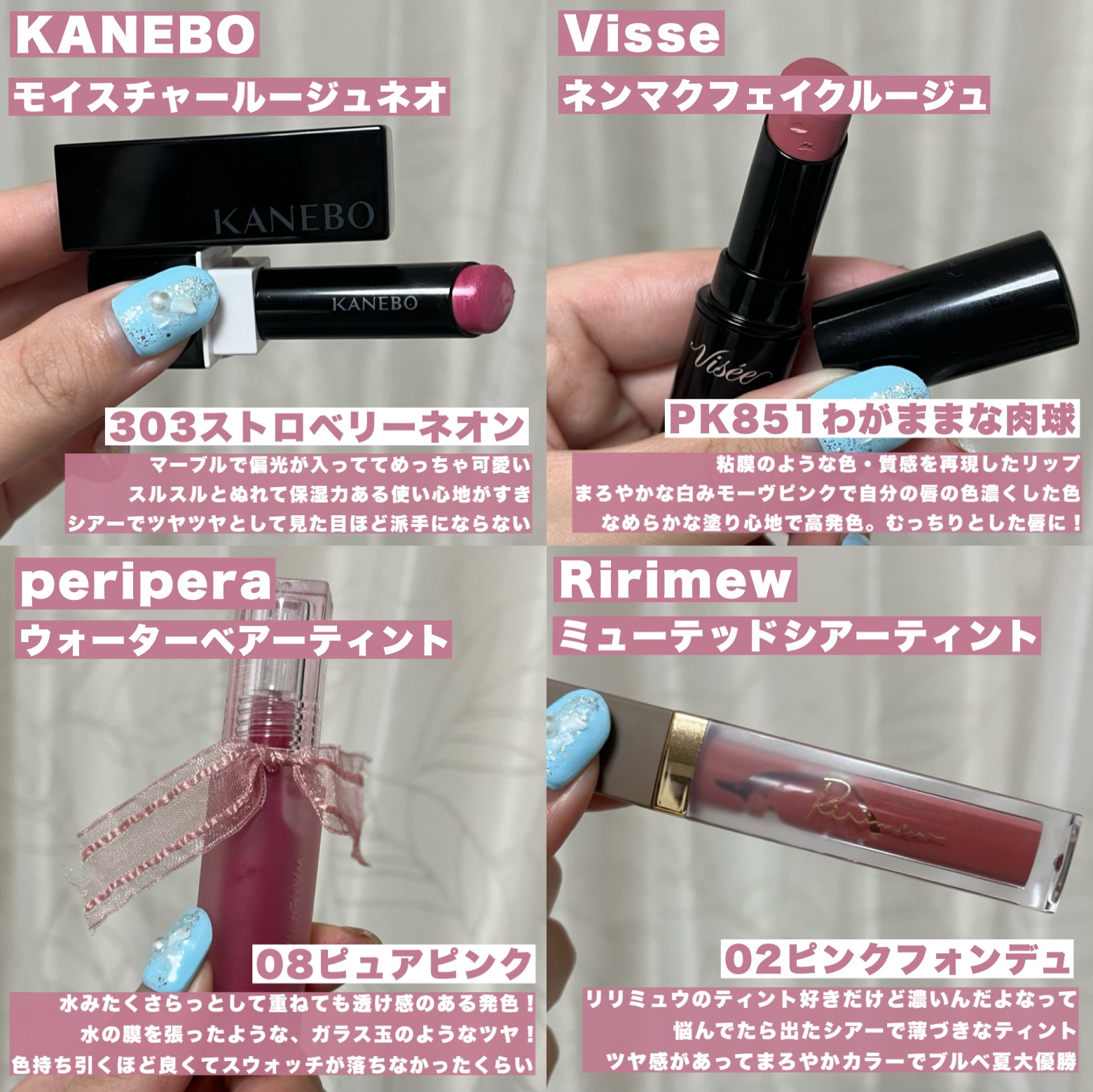 塗布後、2層に分離するコーセー独自のラスティング処方を採用 しているから60秒待つだけでツヤの膜を作ってくれて落ちにくく! 肉球はまろやかな白みモーヴピンク。 チェリーは青みそこまで強くない、チェリーレッド! なめらかな塗り心地でするすると塗れます。 塗り心地は軽いのに、高発色。 落ちにくく、むっちりとした唇に! ブルベさんにおすすめカラー! ブルベ夏のわたしには肉球びびるほど自分の唇の色をそのまま濃くしたみたいな色で可愛くてお気に入り。 チェリーは透け感がない分薄めの化粧の時には濃いめに感じました。 ちょい濃いめの時にばっちり◎ ティントじゃない2層分離タイプだから塗ってすぐはオフしやすいのに色持ちも結構良い! 品切れが続出しているのにも納得の良さだった……!
