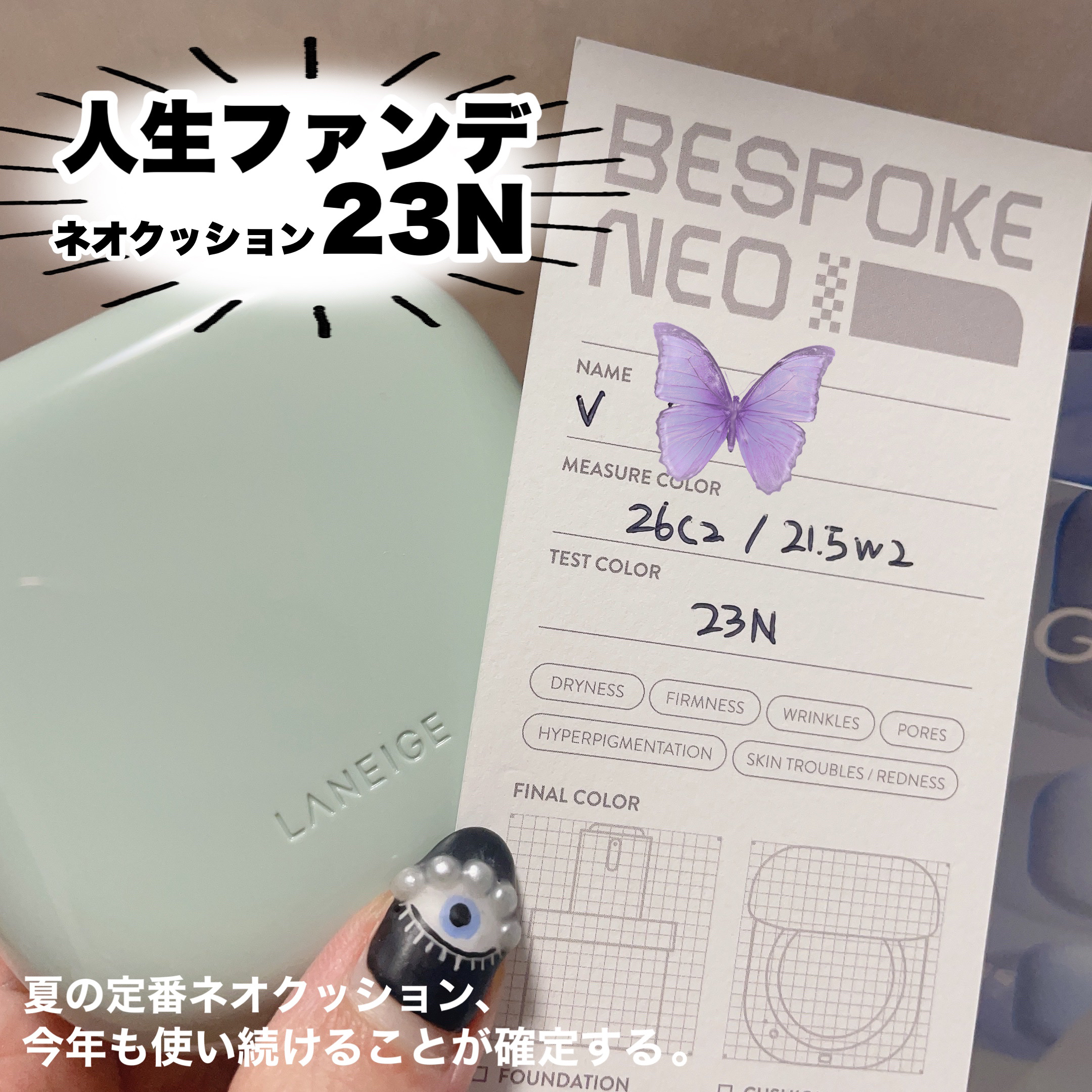 \夏の涼しげ肌🎐/夏の美人肌は厚塗りファンデNG🙅🏻♀️! 涼しげな透け肌をつくるならLANEIGEのネオクッションミュイ♡ 毛穴など隠したいものは消して、素肌感は残す仕上がり◎ お肌にぴたっと密着するから夏でも崩れにくい! @nuna_...