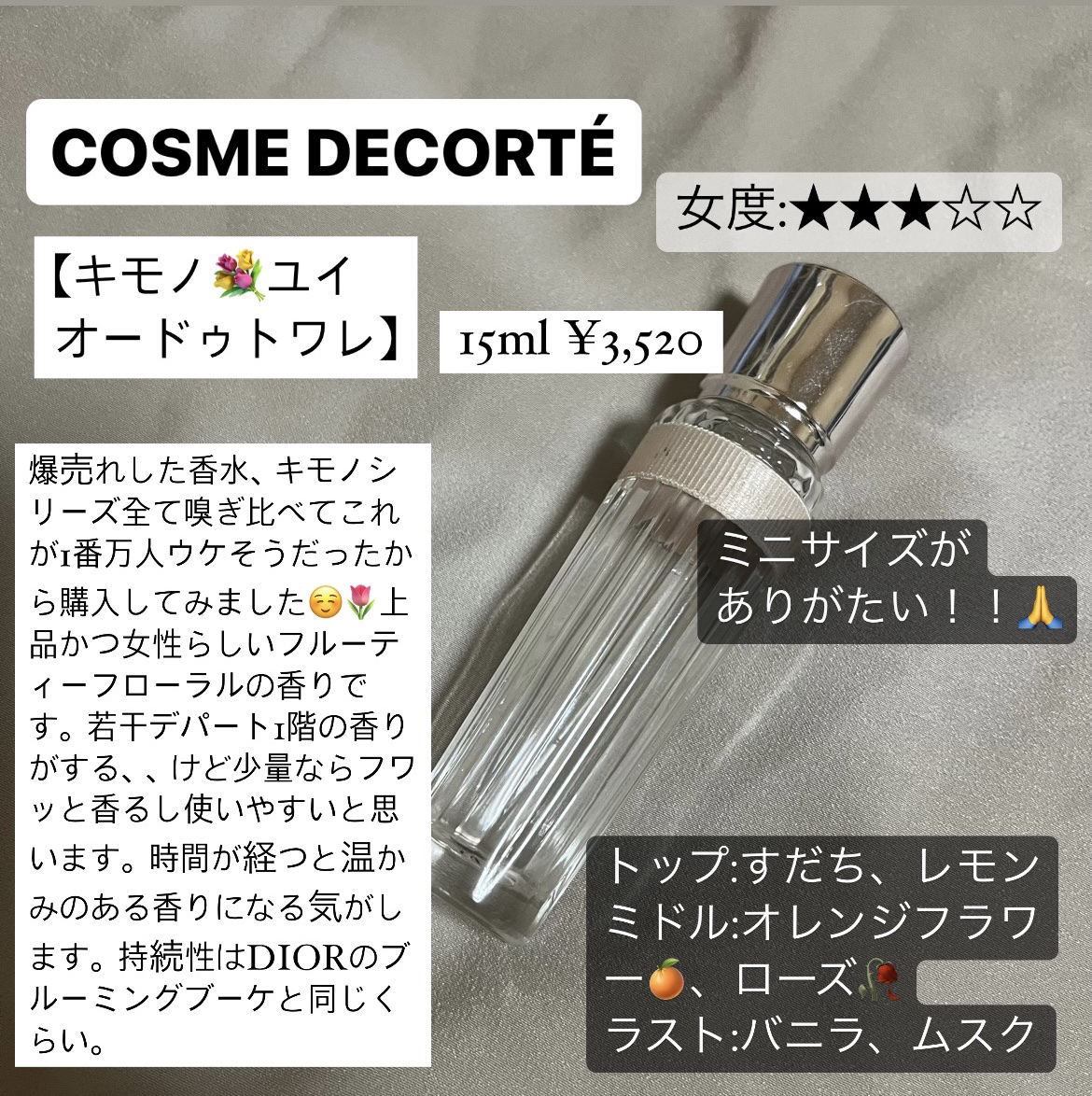 甘くて柔らかなフローラルの香りが大好きでつけてると幸せな気持ちになれる🫧 やさしい幸福感のある香りです♪ これをつけてるといい香りだね!って言われることが多くて嬉しい☺️ このシリーズが大好きなので、つぎは『キモノ リン』を使いたいなと思ってます♡