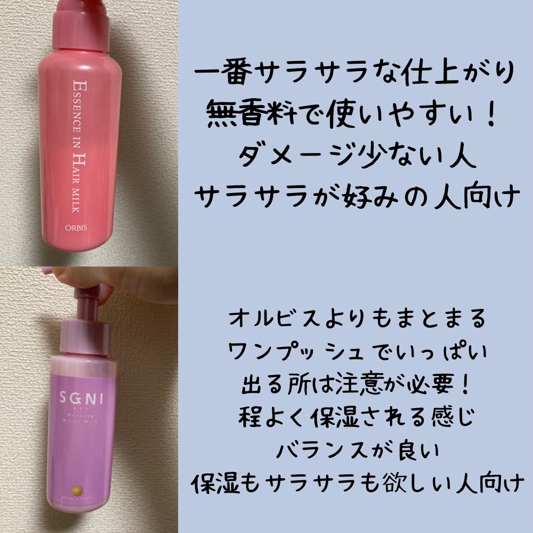 髪の毛が柔らかくなるし、しっとりまとまるのにベタつかない、重くない、アホ毛マシになる! ダメージ少ない、サラサラ仕上がりが好みなら オルビスエッセンスインヘアミルク オルビスよりしっとり感ありますが重くないので バランスが良いです♪ 香りがキツすぎるし香りが結構残ります! 割としっとり仕上がりますがハイダメージ毛なら物足りないかも。コスパもそんなに良くない。