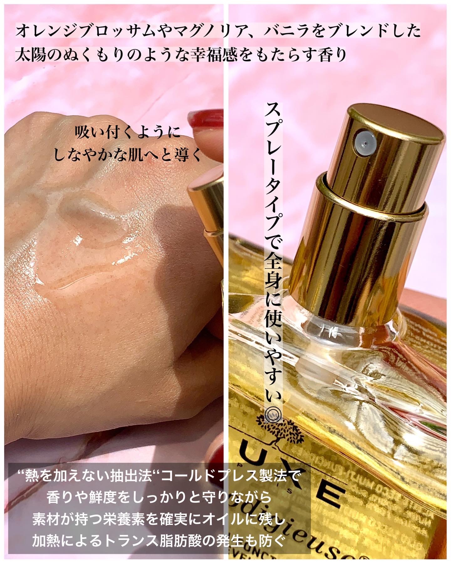 - ツバキオイルやアルガンオイルをはじめとした7種の植物オイル*2を贅沢にブレンドした、顔、体、髪とマルチに使える美容オイル。べたつきのないサラッとしたテクスチャーで、うるおいのあるハリツヤ肌や、健康的で美しいツヤ髪へと導きます。さらに、オレンジブロッサムやベルガモット、バニラをブレンドした、温もりのある甘い香りが、お手入れの時に、幸福感に満ちたひと時へと誘います。 *2 ツバキ種子油、アルガニアスピノサ核油、ユチャ種子油、ルリジサ種子油(以上エモリエント成分)、アーモンド油、ヘーゼルナッツ種子油、マカデミア種子油(以上整肌成分)