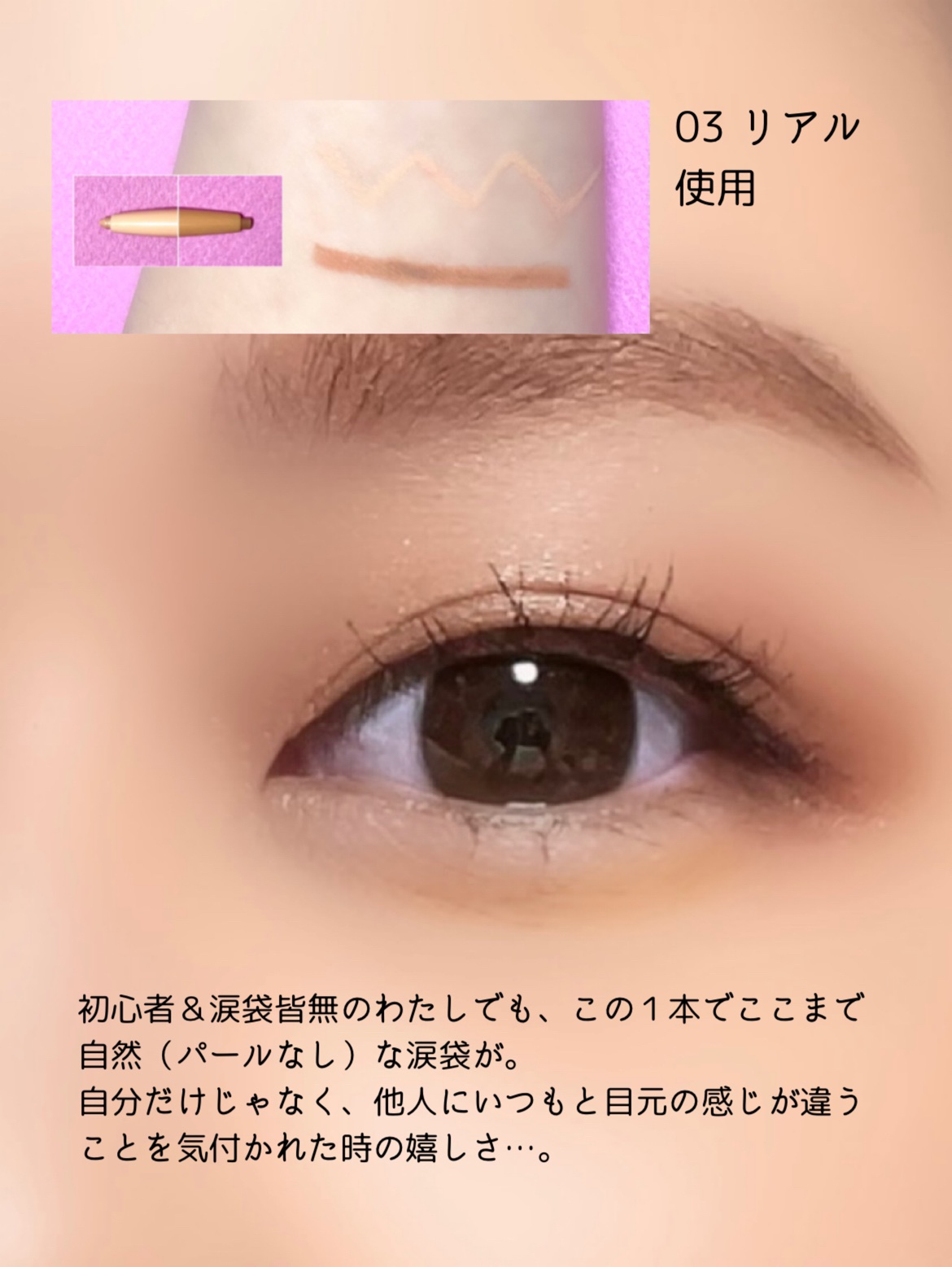 - 1.2色で簡単 涙袋完成 陰影ライナーで涙袋の影をサッと描いて 反対側のカラーシャドウで涙袋全体を埋めるだけで、 生まれつきの涙袋*のように ぷっくり自然な仕上がりに! 2. 粉飛びせずなめらかフィット 1回でスムーズに描ける柔らかい密着テクスチャー ムラなくヨレにくい、簡単にブレンディングできる クリームフォーミュラ 3. 描きやすい細芯タイプ 狭くて細い部位にも繊細なタッチでメイクが完成! 涙袋メイクに特化した #超繊細サイズ *メイクアップ効果による
