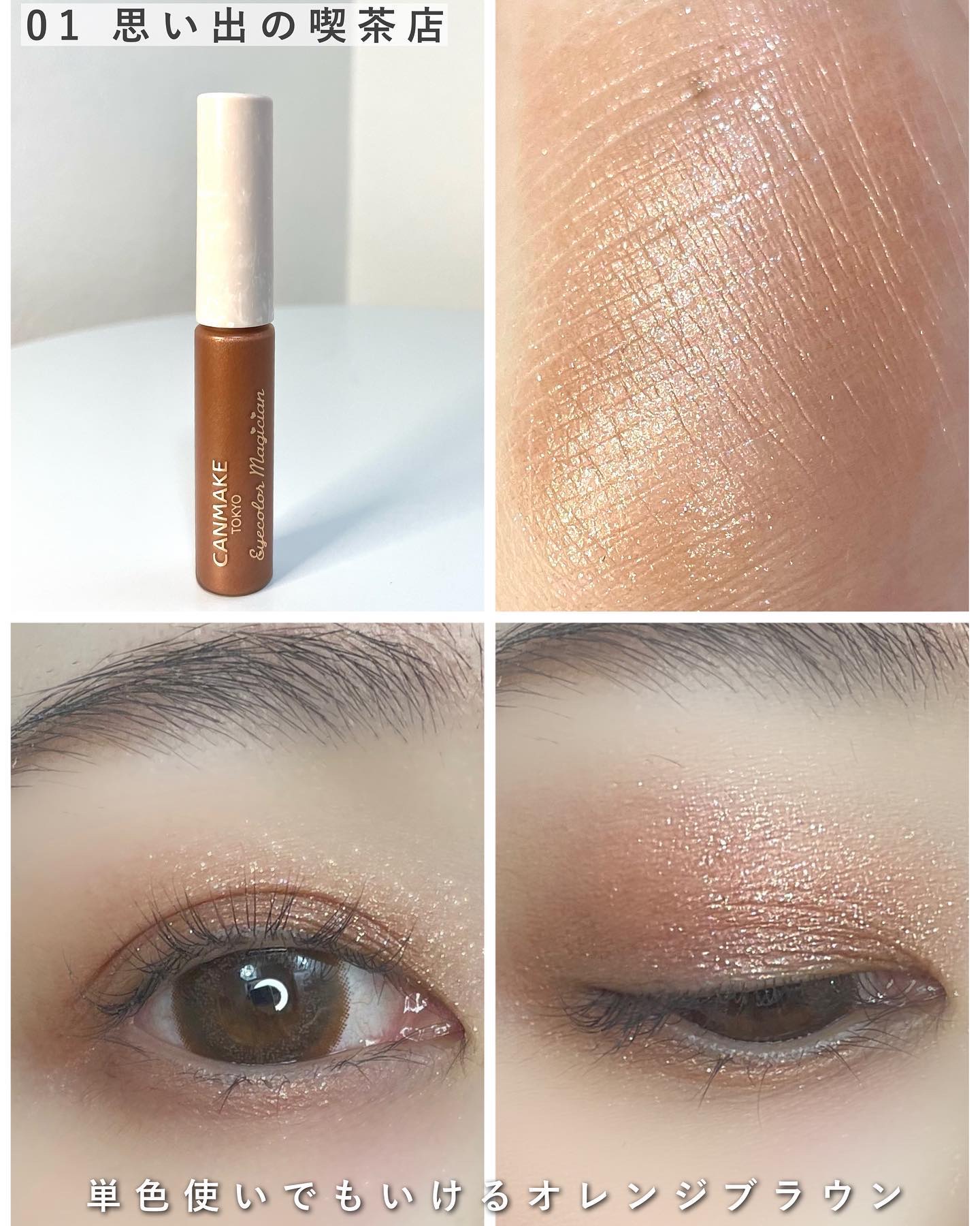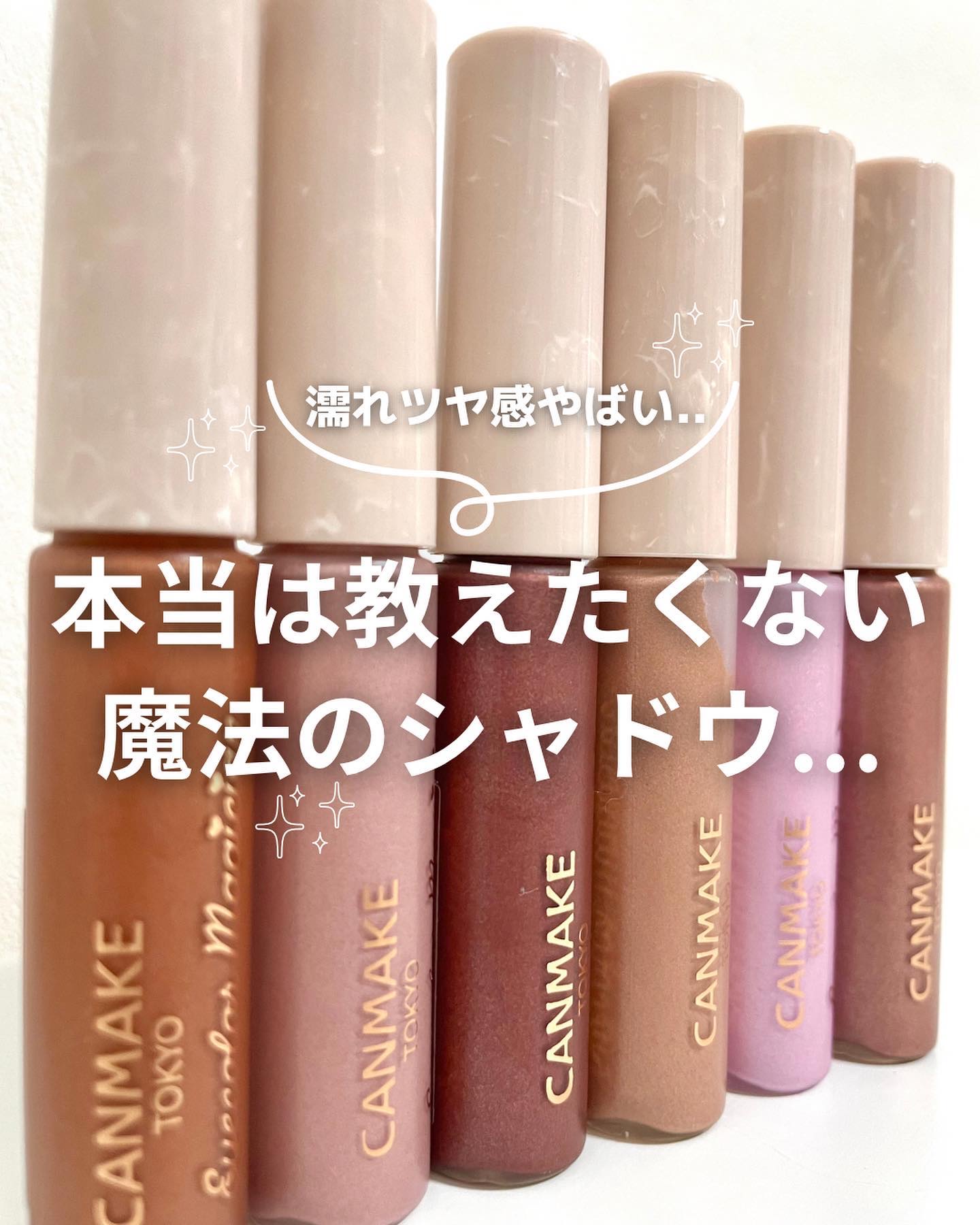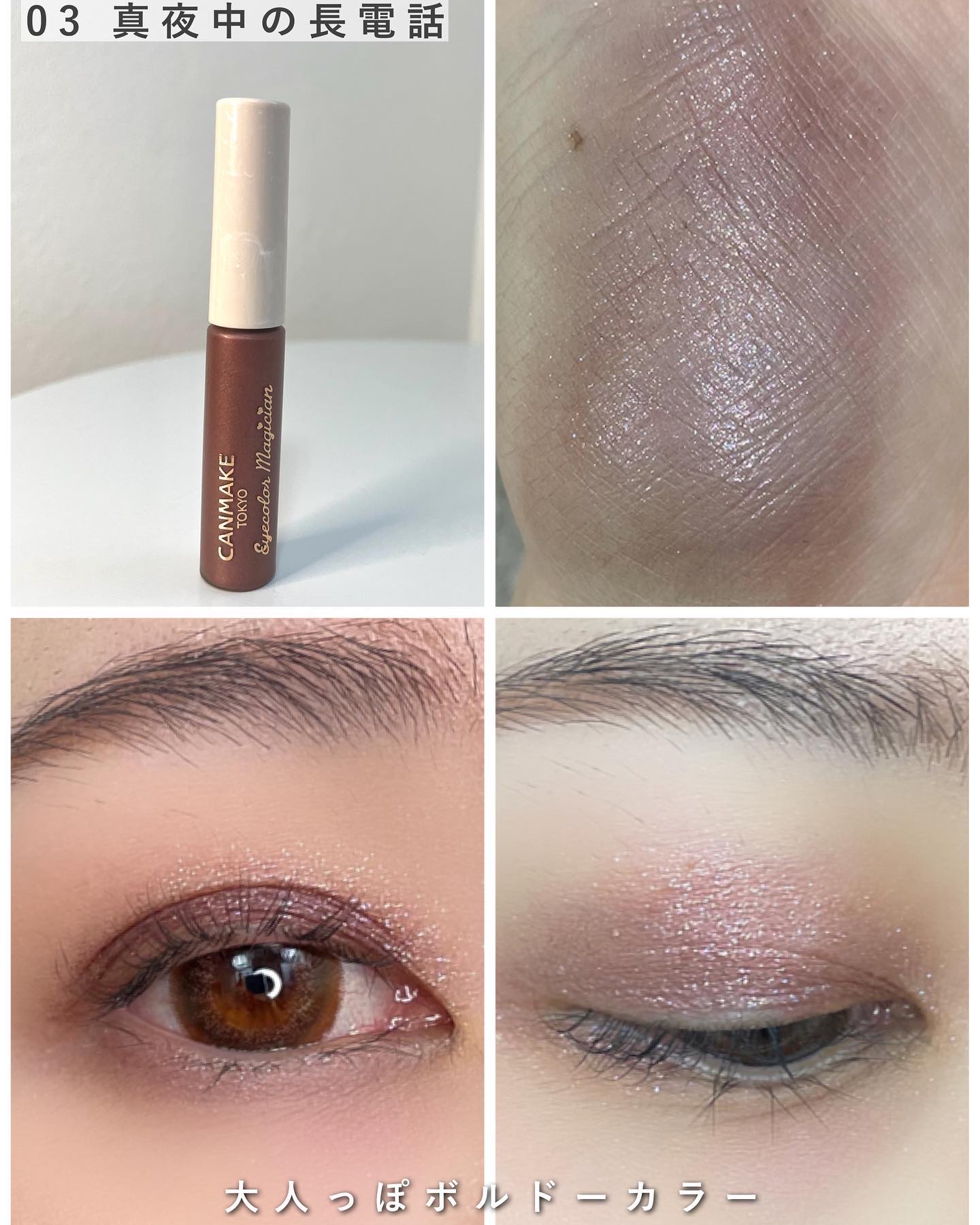 キャンメイクアイカラーマジシャン リキッドアイシャドウです。 乾燥が早く、グラデーションにする際は手早くのばす必要がありますが、乾くとピッタリと密着してラメも飛びにくく使いやすいアイシャドウ。これ一本でもいい感じになるのでお気に入りです。 マ...