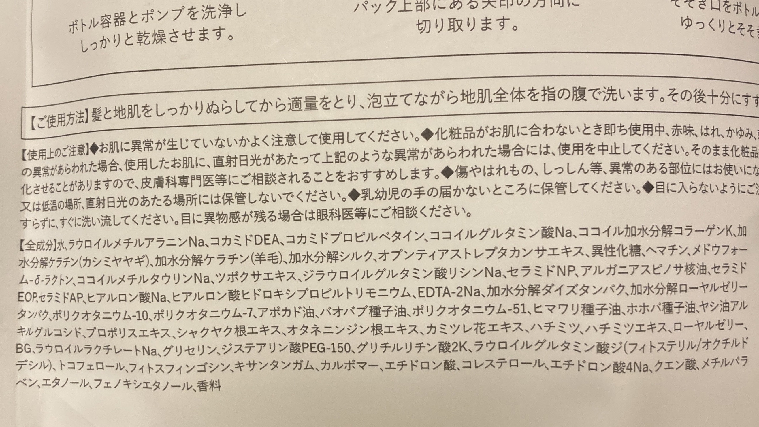 - <シャンプー 450ml> 水、ラウロイルメチルアラニンNa、コカミドDEA、コカミドプロピルベタイン、ココイルグルタミン酸Na、ココイル加水分解コラーゲンK、加水分解ケラチン(カシミヤヤギ)、加水分解ケラチン(羊毛)、加水分解シルク、オプンティアストレプタカンサエキス、異性化糖、ヘマチン、メドウフォーム-δ-ラクトン、ココイルメチルタウリンNa、ツボクサエキス、ジラウロイルグルタミン酸リシンNa、セラミドNP、アルガニアスピノサ核油、セラミドEOP、セラミドAP、ヒアルロン酸Na、ヒアルロン酸ヒドロキシプロピルトリモニウム、EDTA-2Na、加水分解ダイズタンパク、加水分解ローヤルゼリータンパク、ポリクオタニウム-10、ポリクオタニウム-7、アボカド油、バオバブ種子油、ポリクオタニウム-51、ヒマワリ種子油、ホホバ種子油、ヤシ油アルキルグルコシド、プロポリスエキス、シャクヤク根エキス、オタネニンジン根エキス、カミツレ花エキス、ハチミツ、ハチミツエキス、ローヤルゼリー、BG、ラウロイルラクチレートNa、グリセリン、ジステアリン酸PEG-150、グリチルリチン酸2K、ラウロイルグルタミン酸ジ(フィトステリル/オクチルドデシル)、トコフェロール、フィトスフィンゴシン、キサンタンガム、カルボマー、エチドロン酸、コレステロール、エチドロン酸4Na、クエン酸、メチルパラベン、エタノール、フェノキシエタノール、香料 <トリートメント 450ml> 水、ステアリルアルコール、グリセリン、ハチミツ、ベヘントリモニウムクロリド、ジメチコン、加水分解ケラチン(カシミヤヤギ)、加水分解シルク、加水分解コラーゲン、水溶性コラーゲン、サクシノイルアテロコラーゲン、加水分解ケラチン(羊毛)、加水分解ケラチン、アルガニアスピノサ核油、ツバキ種子油、ホホバ種子油、セラミドNP、アボカド油、バオバブ種子油、ヒマワリ種子油、メドウフォーム-δ-ラクトン、プルケネチアボルビリス種子油、ポリクオタニウム-51、ポリクオタニウム-64、加水分解ローヤルゼリータンパク、ヒアルロン酸Na、ヒアルロン酸ヒドロキシプロピルトリモニウム、ジラウロイルグルタミン酸リシンNa、メドウフォーム油、セラミドAP、セラミドEOP、ポリクオタニウム-10、ヨモギ葉エキス、モモ葉エキス、アマモエキス、レモン果実エキス、グレープフルーツ果実エキス、ミツイシコンプエキス、ゴボウ根エキス、コーヒー種子エキス、アプンティアストレプタカンサエキス、豆乳発酵液、グレープフルーツ果皮油、ゴマ油、シア脂、加水分解ダイズタンパク、BG、黒砂糖、ステアリン酸PEG-55、シクロベンタシロキサン、アルギニン、グルタミン酸、ステアルトリモニウムクロリド、グリチルリチン酸2K、グルコシルルチン、ラウロイウグルタミン酸ジ(フィトステリル/オクチルドデシル)、ラウロイルラクチレートNa、ベンチレングリコール、ヘマチン、ユビキノン、水添レシチン、トコフェロール、フィトスフィンゴシン、コレステロール、キサンタンガム、カルポマー、腐植土抽出物、イソプロパノール、ヒドロキシエチルセルロース、ジココジモニウムクロリド、フェノキシエタノール、アモジメチコン、アミノプロピルジメチコン、エタノール、香料 <シャンプー詰替用 350ml> 水、ラウロイルメチルアラニンNa、コカミドDEA、コカミドプロピルベタイン、ココイルグルタミン酸Na、加水分解ケラチン(カシミヤヤギ)、加水分解ケラチン(羊毛)、加水分解シルク、ココイル加水分解コラーゲンK、オプンティアストレプタカンサエキス、異性化糖、ヘマチン、メドウフォーム-δ-ラクトン、ココイルメチルタウリンNa、ツボクサエキス、ジラウロイルグルタミン酸リシンNa、セラミドNP、アルガニアスピノサ核油、セラミドEOP、セラミドAP、ヒアルロン酸Na、ヒアルロン酸ヒドロキシプロピルトリモニウム、EDTA-2Na、加水分解ダイズタンパク、加水分解ローヤルゼリータンパク、ポリクオタニウム-10、ポリクオタニウム-7、アボカド油、バオバブ種子油、ポリクオタニウム-51、ヒマワリ種子油、ホホバ種子油、ヤシ油アルキルグルコシド、プロポリスエキス、シャクヤク根エキス、オタネニンジン根エキス、カミツレ花エキス、ハチミツ、ハチミツエキス、ローヤルゼリー、BG、ラウロイウラクチレートNa、グリセリン、ジステアリン酸PEG-150、グリチルリチン酸2K、ラウロイルグルタミン酸ジ(フィトステリル/オクチルドデシル)、トコフェロール、フィトスフィンゴシン、キサンタンガム、カルポマー、エチドロン酸、コレステロール、エチドロン酸4Na、クエン酸、メチルパラベン、エタノール、フェノキシエタノール、香料 <トリートメント詰替用 350ml> 水、ステアリルアルコール、グリセリン、ハチミツ、ベヘントリモニウムクロリド、ジメチコン、加水分解シルク、加水分解ケラチン(カシミヤヤギ)、加水分解ケラチン(羊毛)、加水分解ケラチン、加水分解コラーゲン、水溶性コラーゲン、サクシノイルアテロコラーゲン、アルガニアスピノ