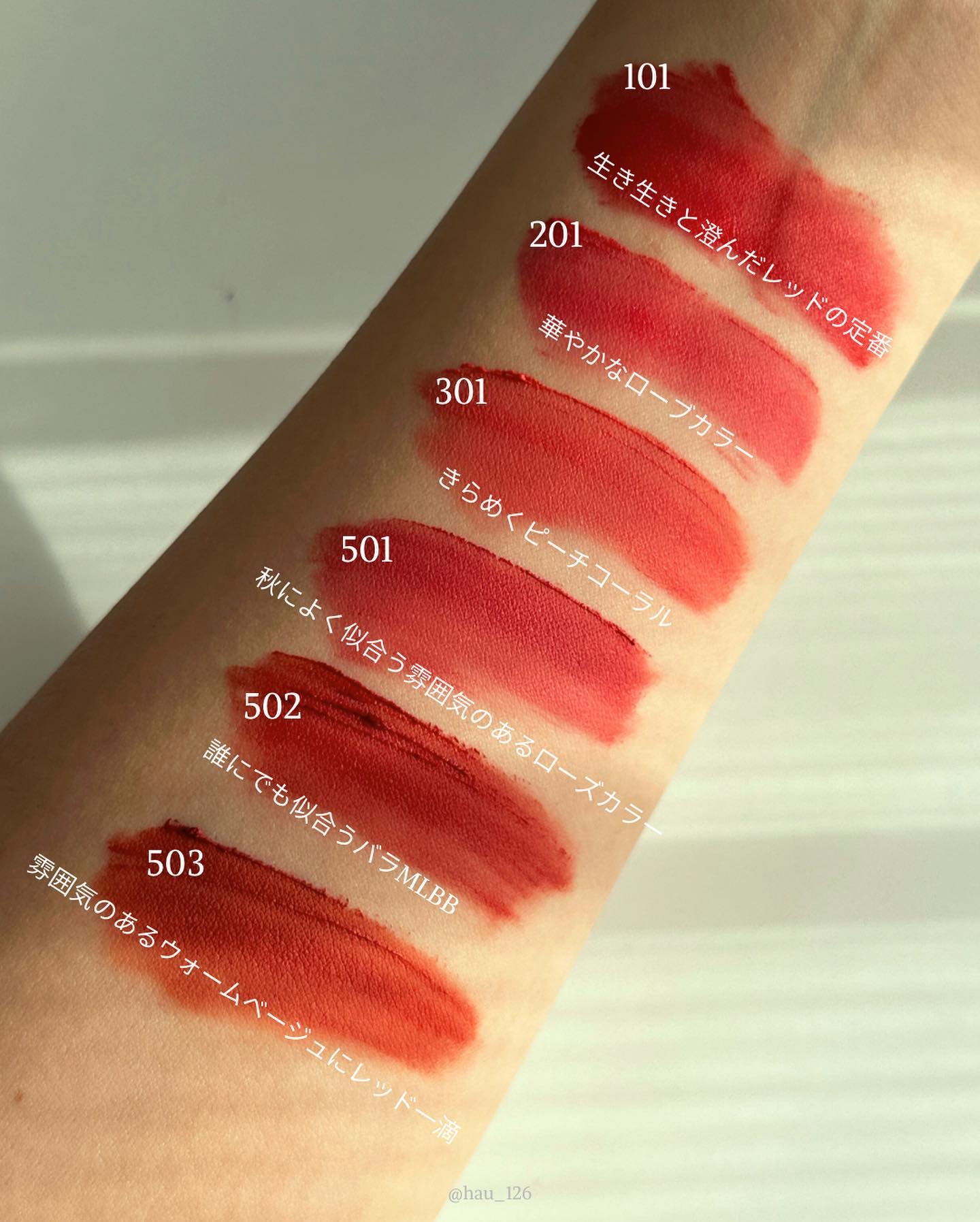 まずパケから高級感あって可愛いんですよね。 さすがespoir、好きです👏🏻🥺(笑) ただ、見本にある写真は結構ブラウンみが強い発色だけど 実際使ってみるとワインレッドのような感じで 若干イメージと違う感じになりました🤔 着色も割と落ちやすいかな…って印象。 最近お気に入りのウェメとか 人生ティントのアンリシアの着色がかなり優秀すぎる ってところもあるけど、それに比べると 着色は弱め。ご飯食べたら塗り直しはマストでした💄 でも、これ使ってると可愛い〜🤍って 言ってもらえることが多いから可愛いことは間違い無いし、 乾燥も全くしなかったのでリップバーム要らずでした🙆🏻♀️ˎˊ-