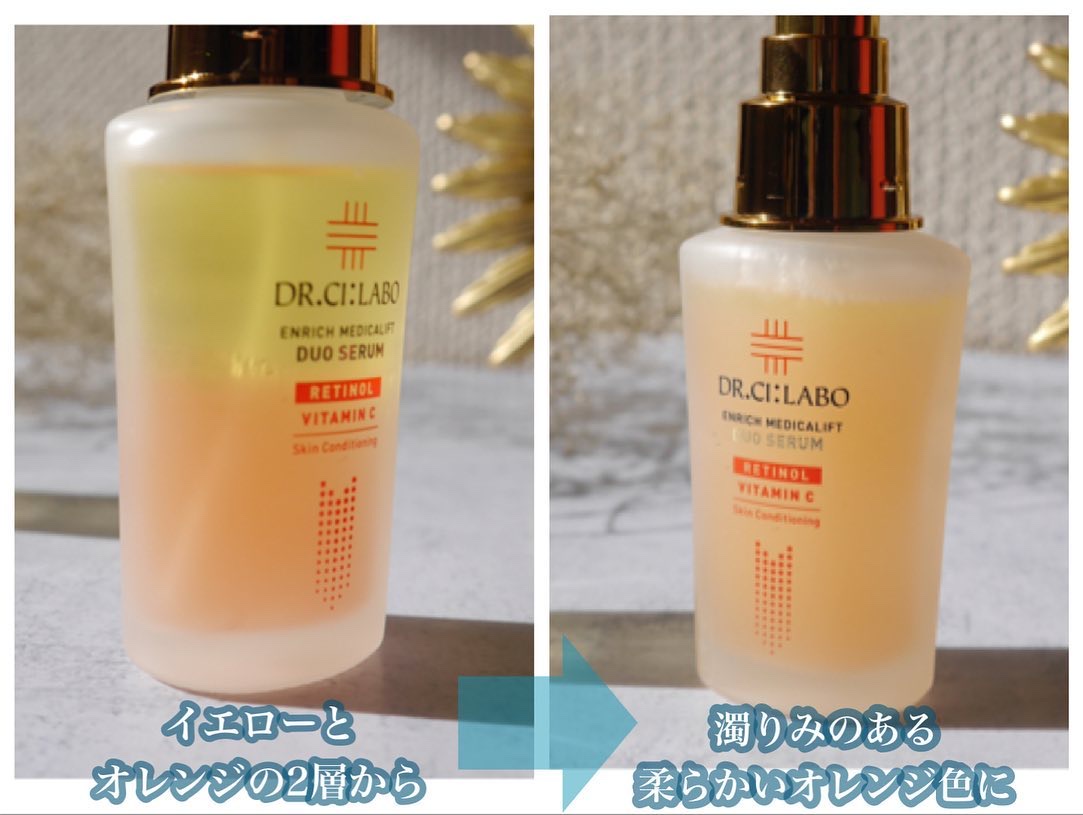 純粋レチノール*1×ビタミンC*2配合✨ \黄色とオレンジ色のセラム/オイル層とエッセンス層を、使う直前に2秒間シェイク🫨 肌の角層からハリ・弾力のある肌に導き、肌表面の「うるおい・毛穴*3・キメ・くすみ*3」へアプローチ🙆♀️