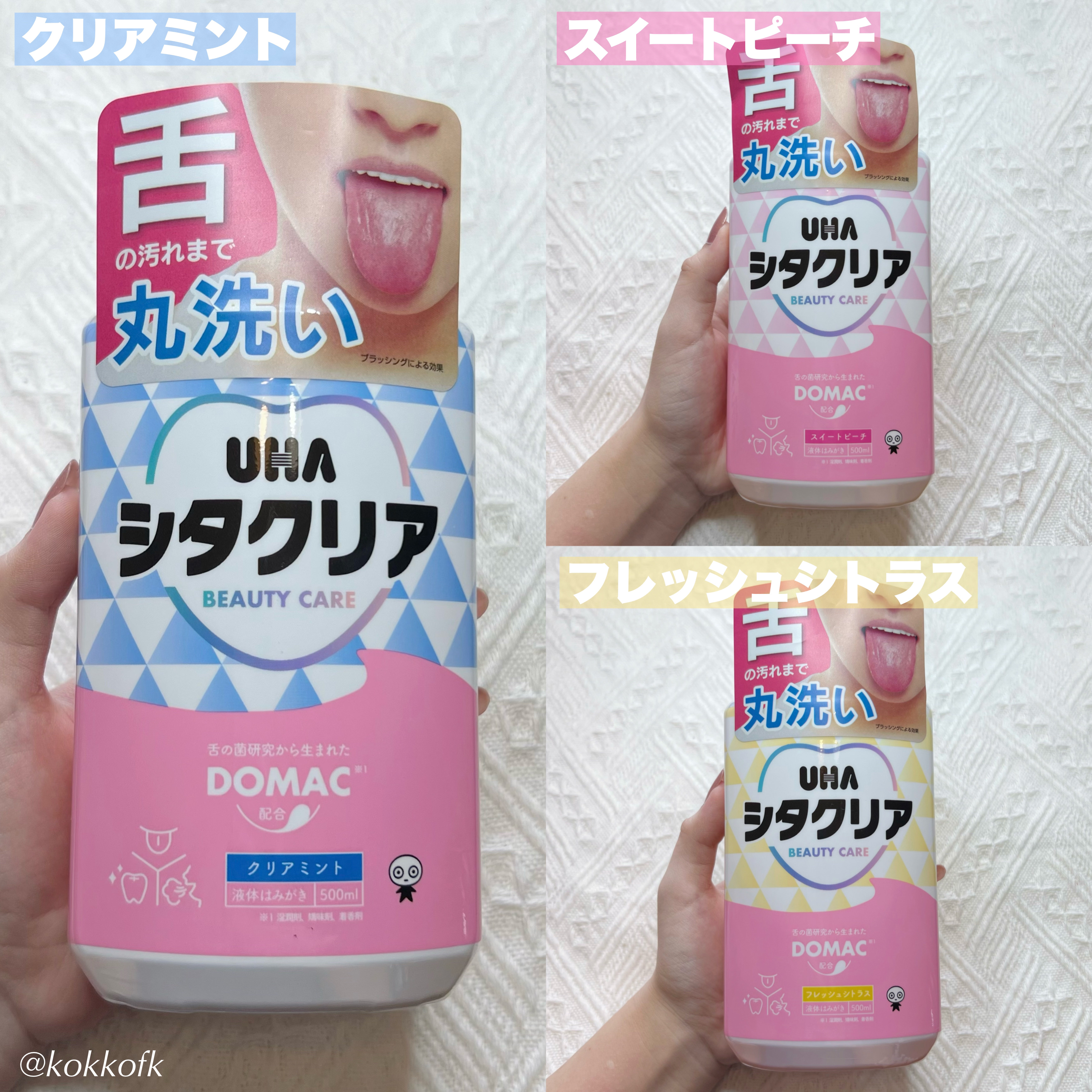 UHA シタクリア 液体はみがき UHA味覚糖から気軽に舌ケアができる 液体歯磨きの登場✨ 舌苔(カビのフィルム)に着目し、 UHA味覚糖と帝京大学医真菌研究センターの 共同研究で開発された アロマ成分複合体 DOMAC(ドゥーマック)成分配合で、 でワンランク上のお口のケアが叶います✨👅 🩵クリアミント 🩷スイートピーチ 💛フレッシュシトラス 液はどれもオレンジがかっていて、 ミントは ピリッと爽やかな香味🌱 スイートピーチは お菓子のように甘〜い🍑 フレッシュシトラスは 甘くて爽やか🍊 お菓子メーカー発の美味しい 液体はみがきで毎日楽しく 口腔ケアしてみてね👅🪥✨