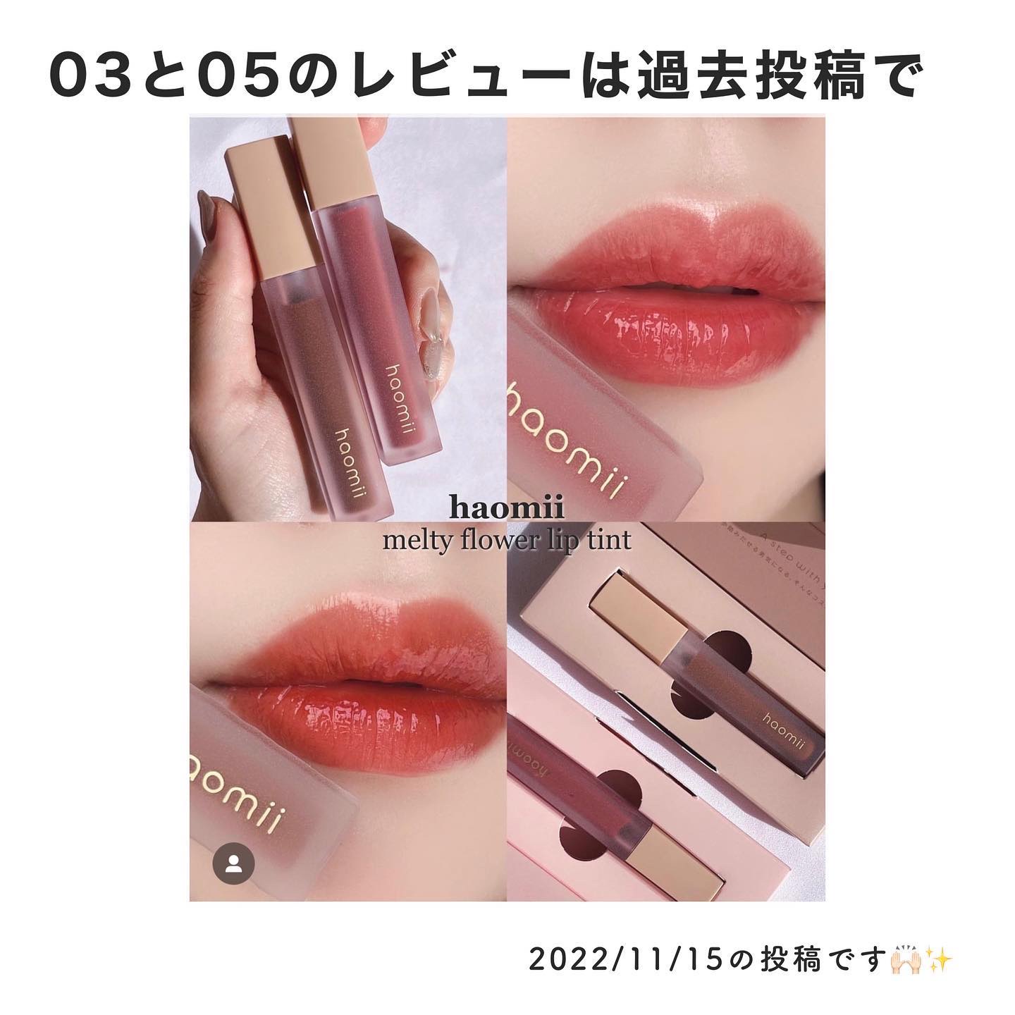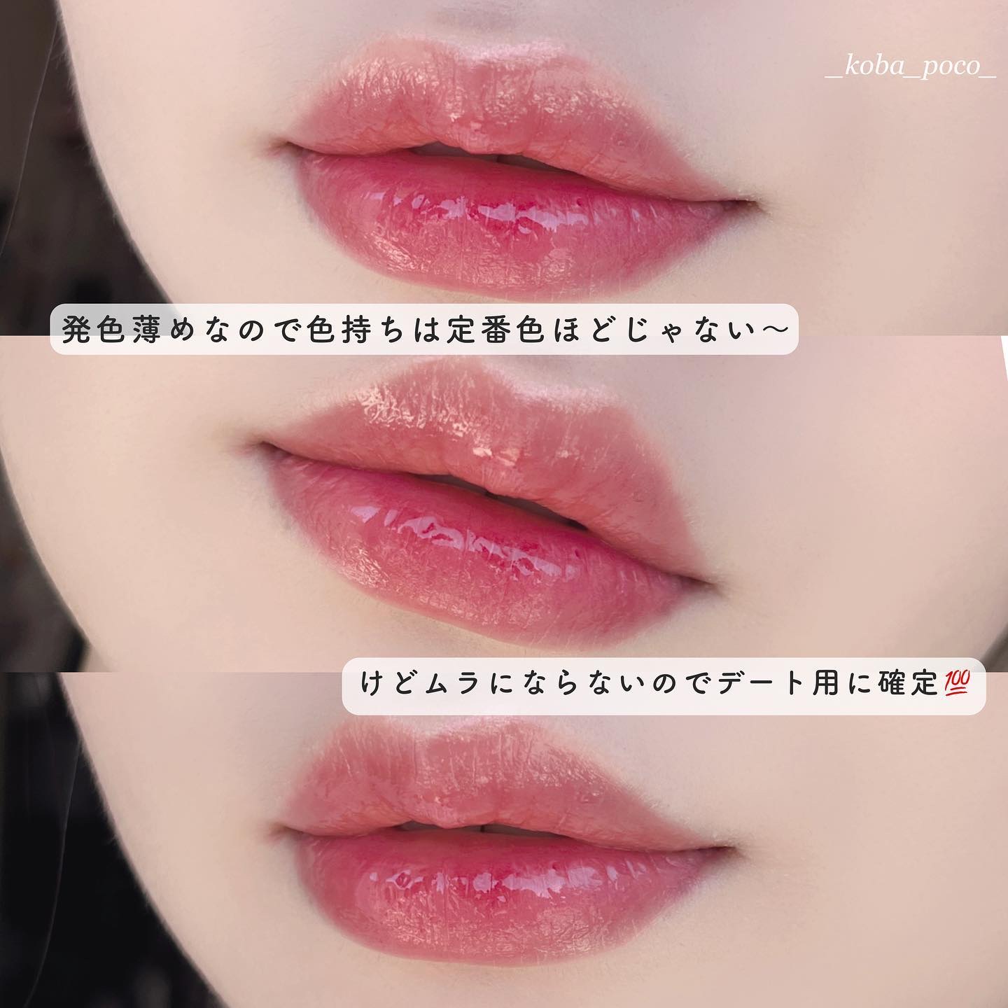 みずみずしい、もも色ピンク🍑 ちゅるちゅる塗れます! ベタつきが気にならなくて最っ高。 ティッシュオフしても ほとんど落ちない… びっくりするほど落ちません! オフすると 色が濃く見えました 時間が経って唇に馴染むと、 ピンク系からオレンジ〜赤系に見えます 正直、出てすぐの色が めちゃくちゃ好きだったので 色が変わってしまうの惜しい🥲 オレンジ系赤系も可愛いけどもっ