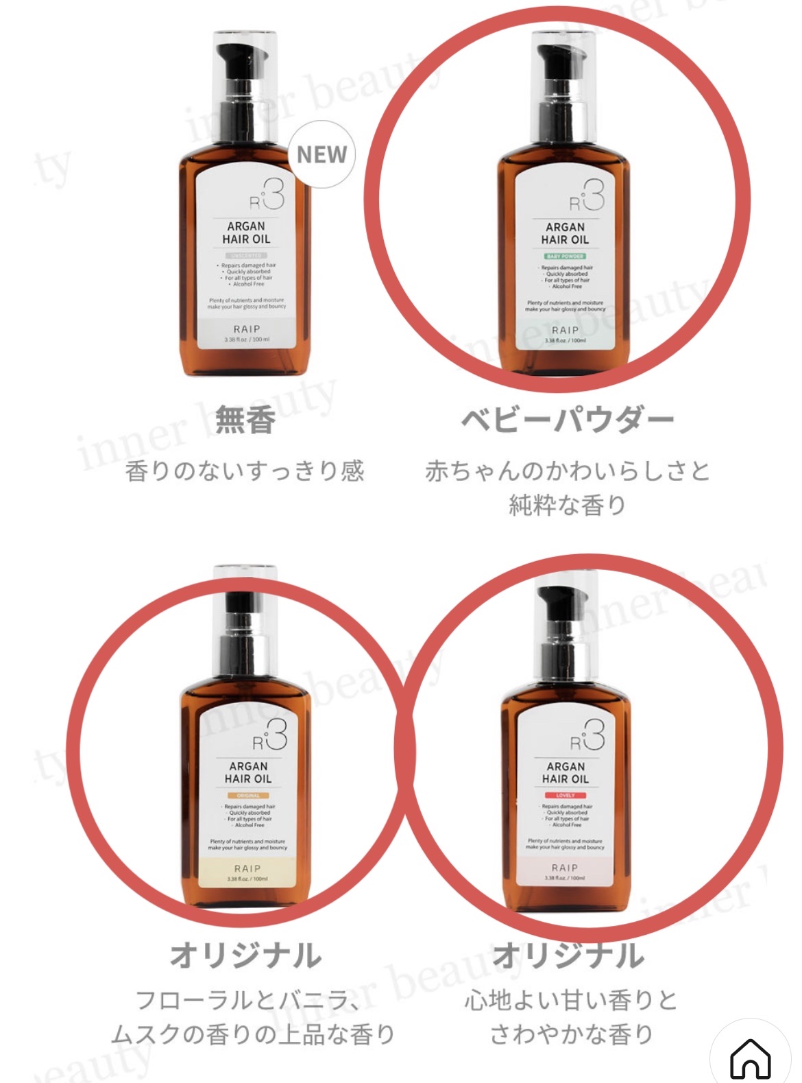 - <BABY POWDER> シクロペンタシロキサン、ジシロキサン、ジメチコン、アルガニアスピノサ核油、ヒポファエラムノイデス油、ツバキ油、ホホバ種子油、アボカド油、ブドウ種子油、オリーブ油、ヒマワリ種子油、パンテノール、酢酸トコフェロール、ブチルフェニルメチルプロパナール、α-イソメチルイオノン、サリチル酸ベンジル、ヘキシルシンナマル、ベンジルアルコール、リモネン、リナロール、クマリン、香料 <ORIGINAL> シクロペンタシロキサン、ジシロキサン、ジメチコン、アルガニアスピノサ核油、ヒポファエラムノイデス果実油、ツバキ種子油、ホホバ種子油、アボカド油、ブドウ種子油、オリーブ果実油、ヒマワリ種子油、パンテノール、酢酸トコフェロール、香料、ヘキシルシンナムアル、シトロネロール、リナロール、ベンジルベンゾエート、アルファー イソメチルアイオノン、ヒドロキシシトロネルアル、リモネン、ゼラニオール <LOVELY> シクロペンタシロキサン、ダイシロキサン、ダイメチコン、アルガンオイル (1200mg)、シーバックソーン( サジー) オイル、ツバキオイル、ホホバオイル、アボカドオイル、ブドウ種子オイル、オリーブオイル、ヒマ ワリ種子オイル、パンテノール、トコフェリルアセテート、香料、リモネン、リナロール、シトロネロール、ベンジルベンゾエート、ゼラニオール <ELEGANCE> シクロペンタシロキサン、ダイシロキサン、ダイメチコン、アルガンオイル (1200mg)、シーバックソーン( サジー) オイル、ツバキオイル、ホホバオイル、アボカドオイル、ブドウ種子オイル、オリーブオイル、ヒマ ワリ種子オイル、パンテノール、トコフェリルアセテート、香料、ブチルフェニルメチルプロピオナル、アルファ-イソメチルアイオノン、ベンジルサリチレ ート、ヘキシルシンナムアル、ベンジルアルコール、リモネン、リナロール、クマリン <OCEAN BLUE> シクロペンタシロキサン、ジシロキサン、ジメチコン、アルガニアスピノサ核油、ヒポファエラムノイデス果実油、ツバキ種子油、ホホバ種子油、アボカド油、ブドウ種子油、オリーブ果実油、ヒマワリ種子油、パンテノール、酢酸トコフェロール、香料、リモネン <ホワイトソープ> シクロペンタシロキサン、ジシロキサン、ジメチコン、アルガニアスピノサ核油、ヒポファエラムノイデス果実油、ツバキ種子油、ホホバ種子油、アボカド油、ブドウ種子油、オリーブ果実油、ヒマワリ種子油、パンテノール、酢酸トコフェロール、香料