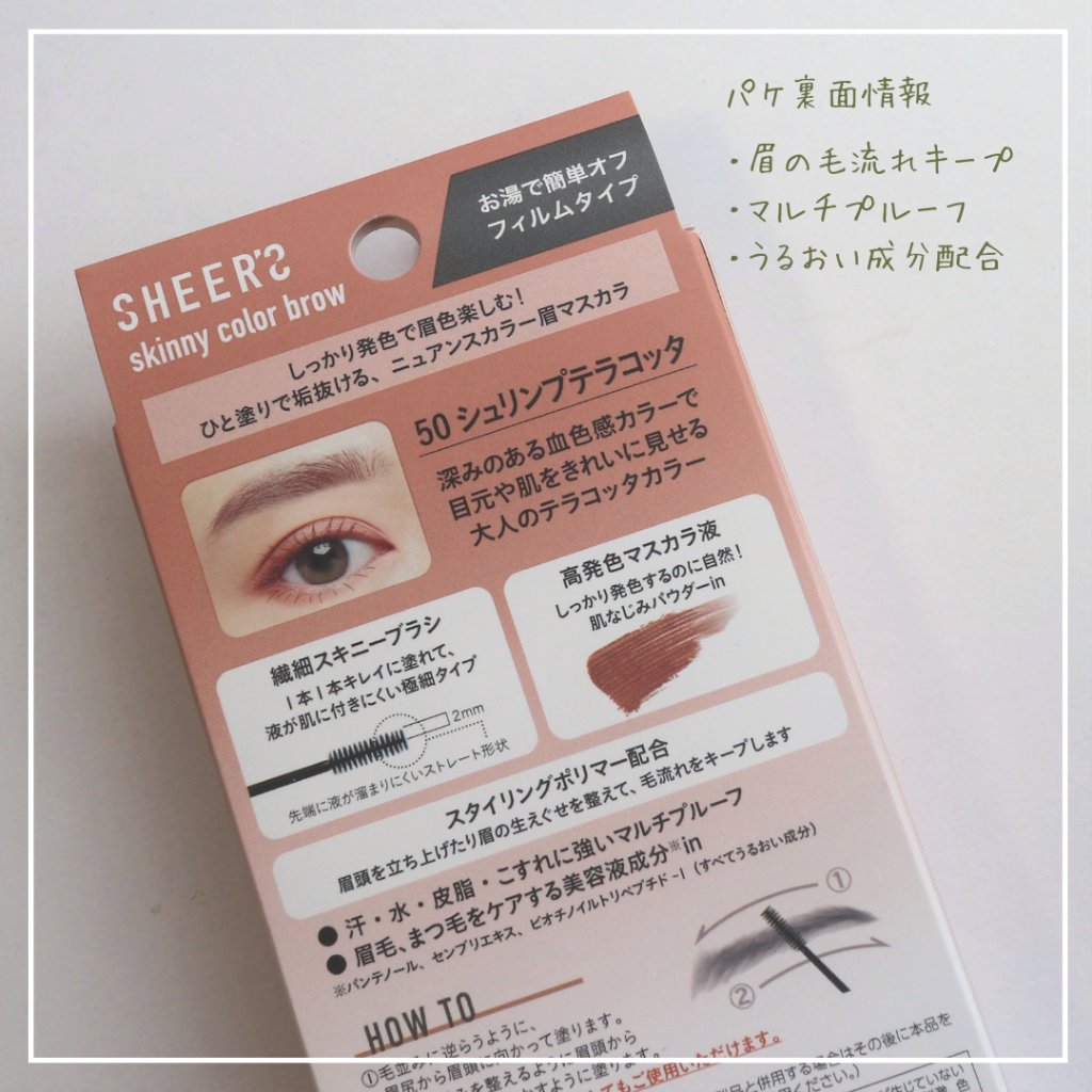 - しっかり発色で眉色楽しむ! ひと塗りで垢抜ける、ニュアンスカラー眉マスカラ 髪の色に合わせなくてもいい。合わせてもいい。 素顔を引き立て雰囲気もメイクする眉カラー。 01 ミルクブラウン:暗髪や濃い眉の方にも黒さを押さえて柔らかく見せるふんわりなじみベージュ メイクをもっとみんなのものに お湯で簡単オフ フィルムタイプ しっかり発色で眉色楽しむ! ひと塗りで垢抜ける、ニュアンスカラー眉マスカラ ・繊細スキニーブラシ 1本1本キレイに塗れて、 液が肌に付きにくい極細タイプ 先端に液が溜まりにくいストレート形状 ・高発色マスカラ液 しっかり発色するのに自然! 肌なじみパウダーin ・スタイリングポリマー配合 眉頭を立ち上げたり眉の生えぐせを整えて、毛流れをキープします ● 汗・水・皮脂・こすれに強いマルチプルーフ ● 眉毛、まつ毛をケアする美容液成分※in ※パンテノール、センブリエキス、ビオチノイルトリペプチド-1(すべてうるおい成分)