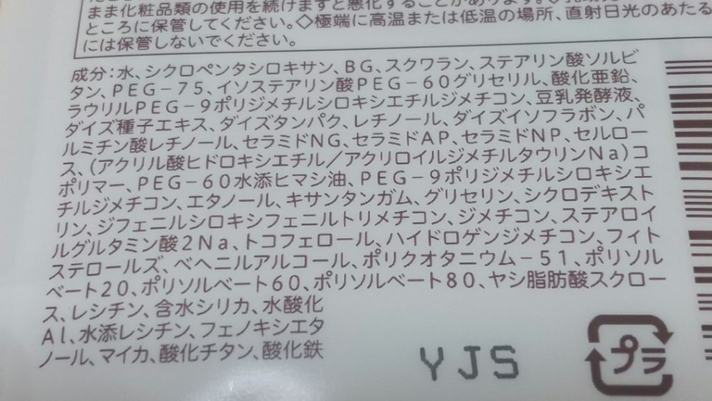 - 水、 シクロペンタシロキサン、 BG、 スクワラン、 ステアリン酸ソルビタン、 PEG-75、 イソステアリン酸PEG-60グリセリル、 酸化亜鉛、 ラウリルPEG-9ポリジメチルシロキシエチルジメチコン、 豆乳発酵液、 ダイズ種子エキス、 ダイズタンパク、 レチノール、 ダイズイソフラボン、 パルミチン酸レチノール、 セラミドNG、 セラミドAP、 セラミドNP、 セルロース、 (アクリル酸ヒドロキシエチル/アクリロイルジメチルタウリンNa)コポリマー、 PEG-60水添ヒマシ油、 PEG-9ポリジメチルシロキシエチルジメチコン、 エタノール、 キサンタンガム、 グリセリン、 シクロデキストリン、 ジフェニルシロキシフェニルトリメチコン、 ジメチコン、 ステアロイルグルタミン酸2Na、 トコフェロール、 ハイドロゲンジメチコン、 フィトステロールズ、 ベヘニルアルコール、 ポリクオタニウム-51、 ポリソルベート20、 ポリソルベート60、 ポリソルベート80、 ヤシ脂肪酸スクロース、 レシチン、 含水シリカ、 水酸化Al、 水添レシチン、 フェノキシエタノール、 マイカ、 酸化チタン、 酸化鉄 ※商品の改良や表示方法の変更などにより、実際の成分と一部異なる場合があります。実際の成分は商品の表示をご覧ください。