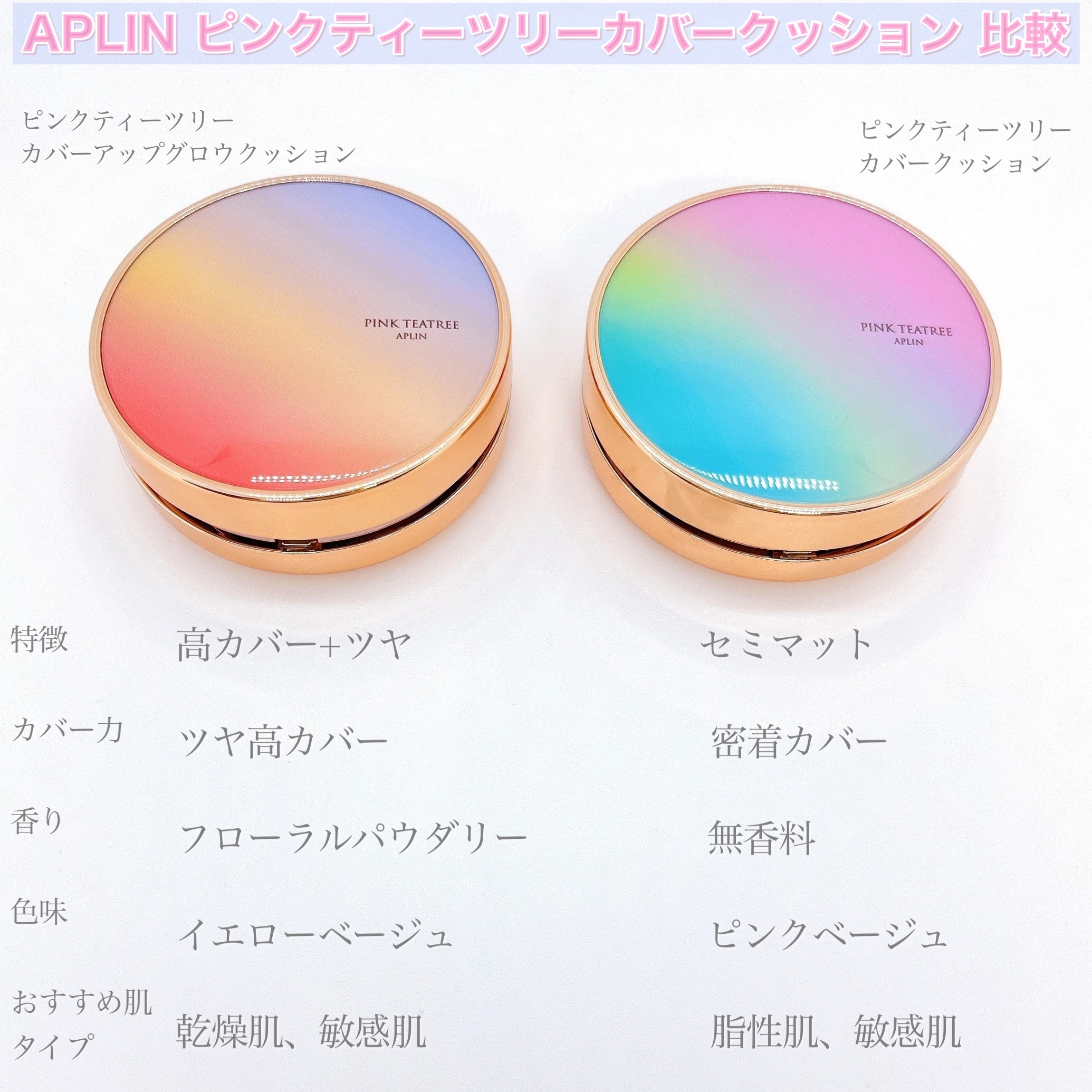 APLIN ピンクティーツリーカバークッション 21号ライトベージュ 2,490円(税込) 少量でよく伸びてハイカバー! 赤みやくすみをしっかりカバ一できるのに、厚塗り感のないなめらかな仕上がり♡ ハイカバーなのにナチュラルなツヤ感とサラッとしつつ、乾燥崩れしにくい仕上がりに感動します!!
