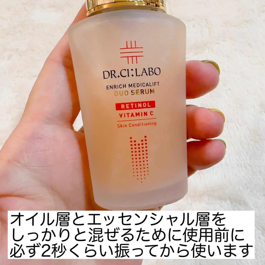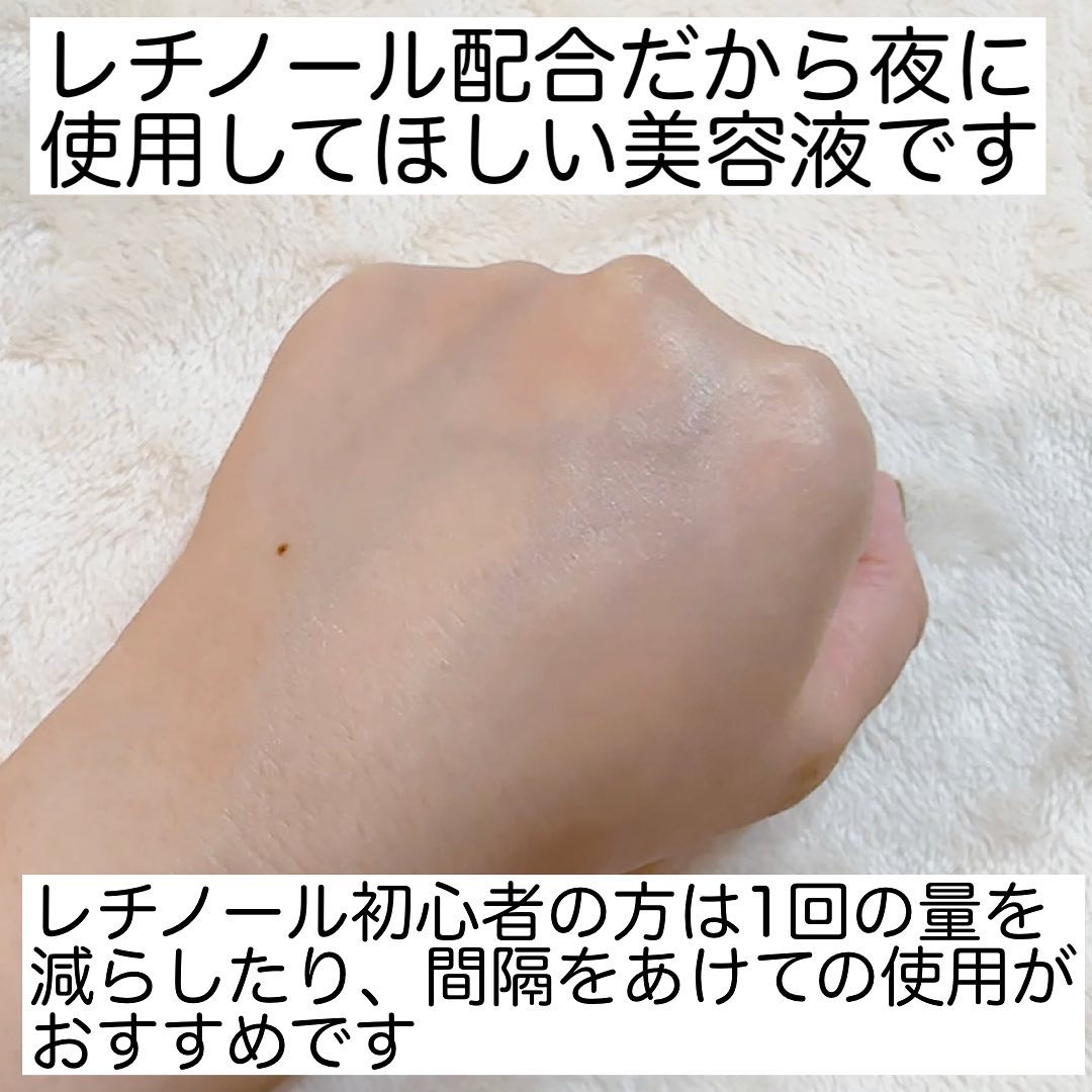 2層式になっていて2秒間シェイクして使う新感覚美容液です🧴 純粋レチノール*1(ハリ・弾力)×高浸透ビタミンC(APPS)*2(うるおい・毛穴・キメ・くすみ) 肌表面がうるおって毛穴が目立ちにくくなるところと、キメが整って肌の内側*3からのハリを実感できるところが大好きです🤍