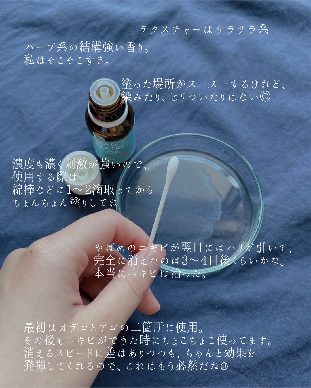 - マジックティーツリーオイルは、乾燥や皮脂による肌悩みをスポットケアし、整える商品です。ブラン代表の整肌成分である4‐テルピネオールで肌トラブルの原因の1つである皮脂を素早くケアします。 【このような方におススメ】 ✔乾燥による肌悩みが気になる方 ✔過度な皮脂と油分が気になる方 ✔べたつきのないスキンケアを探されている方 ✔肌荒れを防ぎたい方 ✔年齢性別肌タイプ関係なく使用できる商品を探されている方 【使用方法】 ①洗顔後、コットンに適量を取り、軽くふき取った後馴染ませます。 ②気になる部分の肌をきれいに洗顔後、トナー→クリームの順でお肌を整えます。 ③綿棒に1~2滴落とし、気になる部分に塗ります。 経過を見て朝晩のスキンケアの最後の段階に塗ることを繰り返します。