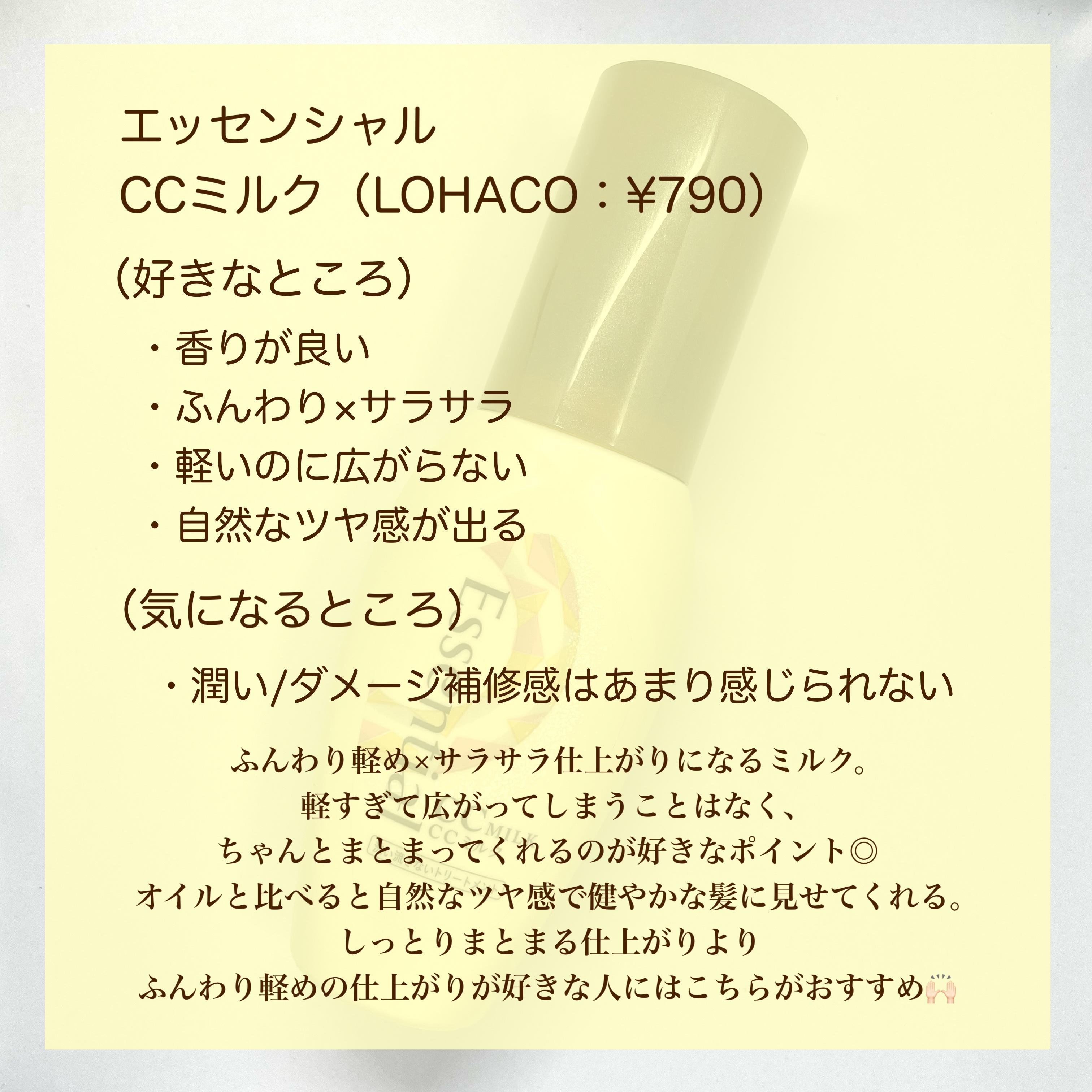 知る人ぞ知る、エッセンシャルの隠れた人気アイテムがこの度リニューアル🎉 「CCミルク、CCオイル」 驚きのコスパに、エッセンシャルやっぱり凄い!!ってなった🙏 髪に塗布して馴染ませるだけでいい! 成分、使用感、仕上がり、価格、これ全て、私は素晴らしいなと思いました🙏