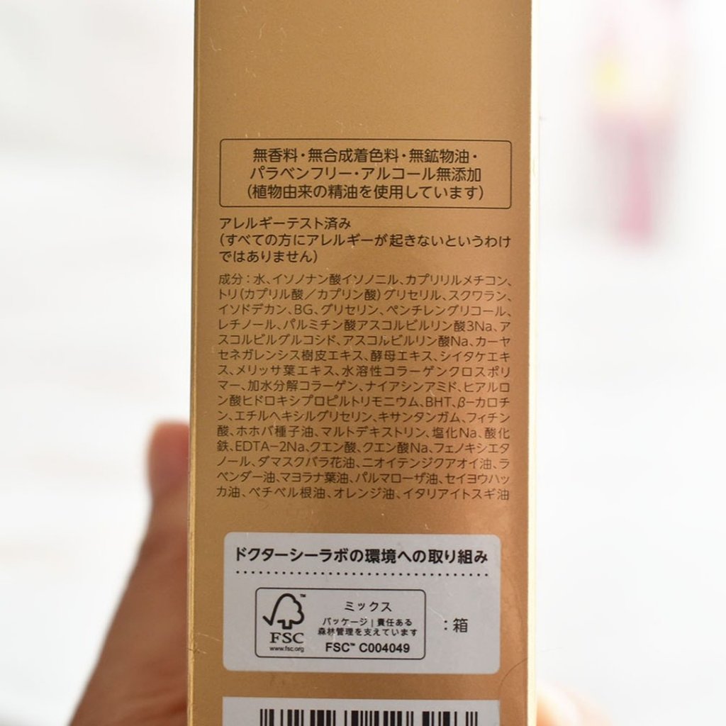 - <26ml> 水、イソノナン酸イソノニル、カプリリルメチコン、トリ(カプリル酸/カプリン酸)グリセリル、スクワラン、イソドデカン、BG、グリセリン、ペンチレングリコール、レチノール、パルミチン酸アスコルビルリン酸3Na、アスコルビルグルコシド、アスコルビルリン酸Na、カーヤセネガレンシス樹皮エキス、酵母エキス、シイタケエキス、メリッサ葉エキス、水溶性コラーゲンクロスポリマー、加水分解コラーゲン、ナイアシンアミド、ヒアルロン酸ヒドロキシプロピルトリモニウム、BHT、β-カロチン、エチルヘキシルグリセリン、キサンタンガム、フィチン酸、ホホバ種子油、マルトデキストリン、塩化Na、酸化鉄、EDTA-2Na、クエン酸、クエン酸Na、フェノキシエタノール、ダマスクバラ花油、ニオイテンジクアオイ油、ラベンダー油、マヨラナ葉油、パルマローザ油、セイヨウハッカ油、ベチベル根油、オレンジ油、イタリアイトスギ油