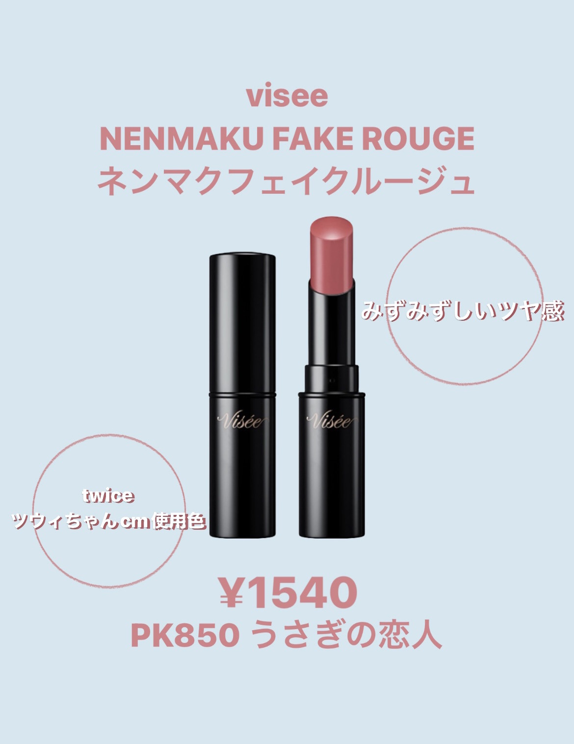 ネンマクフェイクルージュはするすると軽い塗り心地でなめらかに唇へフィットし、みずみずしくツヤ感があり、美しい発色が8時間持続します! カップ☕️やマスク😷にも色移りしにくいです! 唇に塗り、60秒待ってからティシュオフして完成です! PK850うさぎの恋人コーラルピンク このカラーはツウィちゃんがcmで使用していたカラーです! イエベ春🌷PK850 / OR250 / BR350 イエベ秋🍂OR250 / BR350 / RO650 / PK850 ブルベ夏☀️PK851 /OR250 / BR350 / R0650 ブルベ冬⛄RD450 / BR350 / RO650 / PK850
