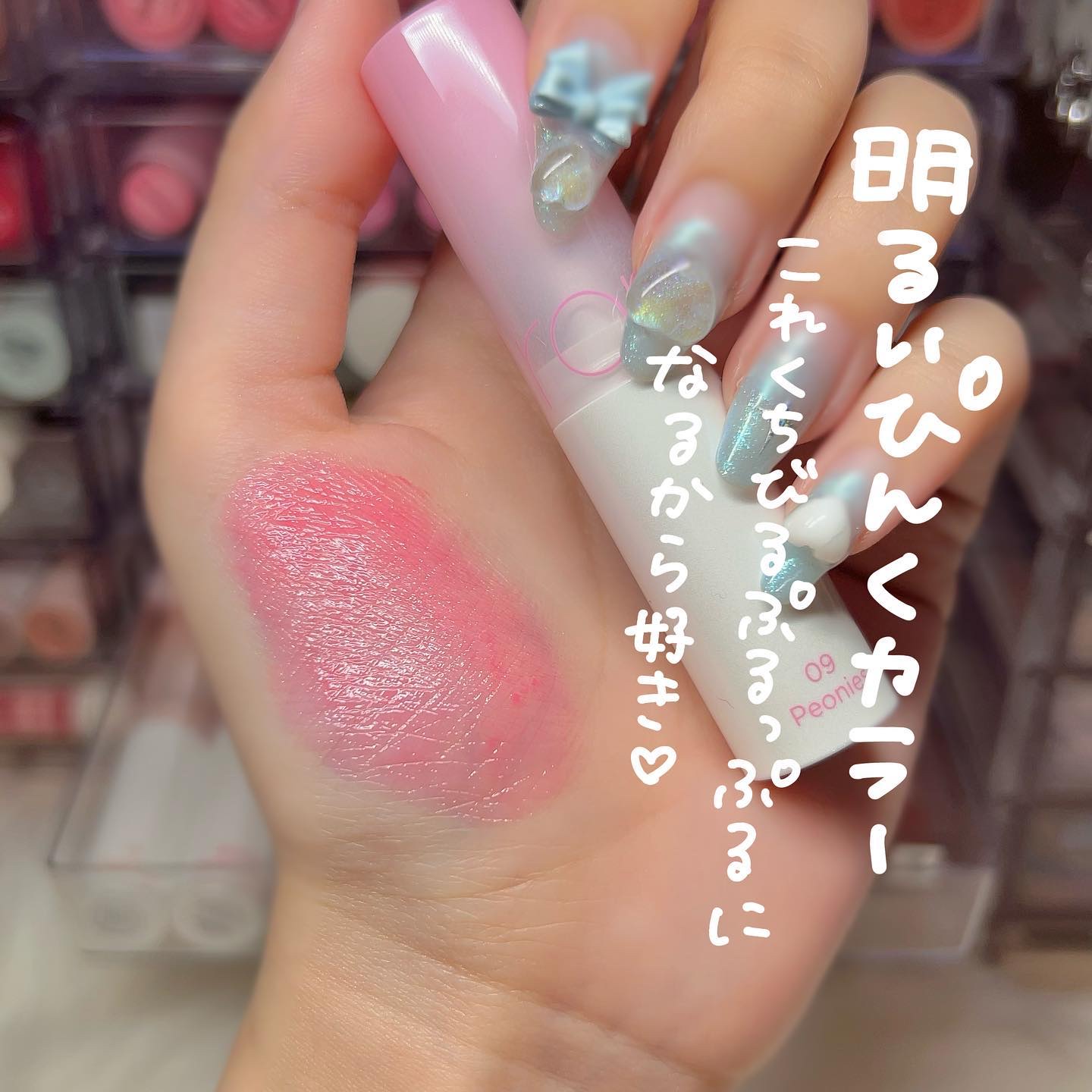 - もちっとした水膜で弾けそうなツヤリップ 1.軽い塗り心地のなめらかで透明な水爆弾ツヤ 2.塗った瞬間から唇を鮮やかに彩る多彩なカラーバーム 3.植物性保湿オイルでしっとりもっちり保湿バーム