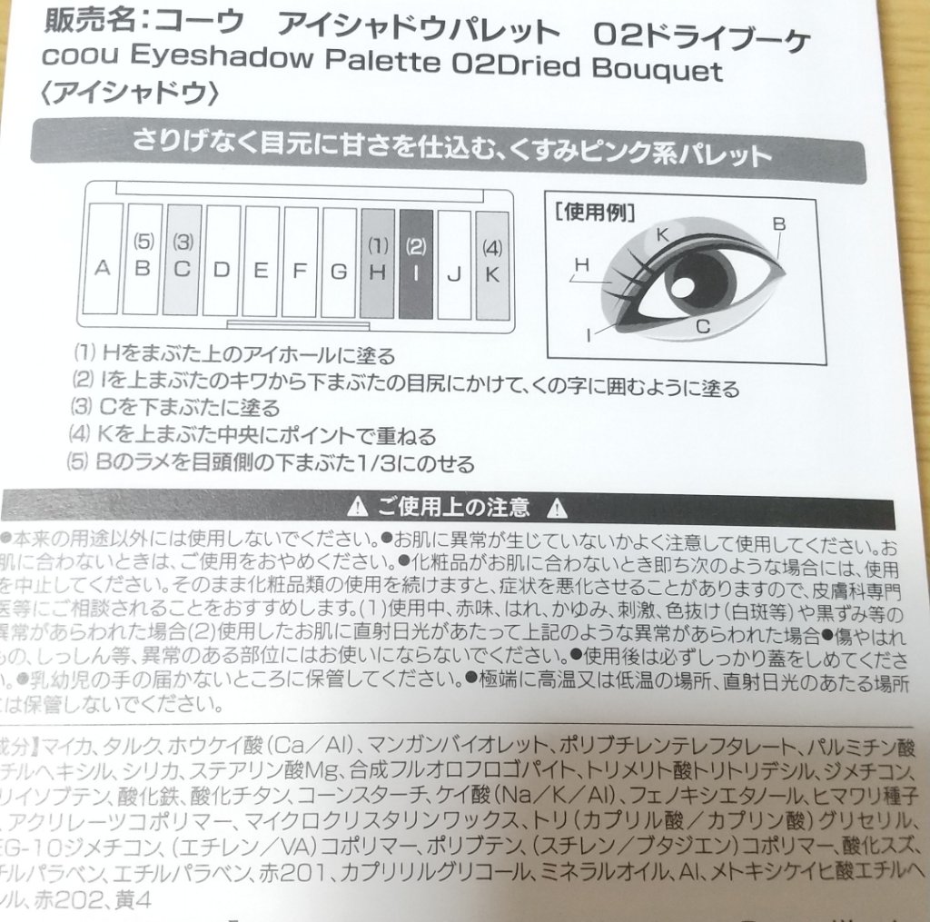 - <02 ドライブーケ> マイカ、タルク、ホウケイ酸(Ca/Al)、マンガンバイオレット、ポリブチレンテレフタレート、パルミチン酸エチルヘキシル、シリカ、ステアリン酸Mg、合成フルオロフロゴパイト、トリメリト酸トリトリデシル、ジメチコン、ポリイソブテン、酸化鉄、酸化チタン、コーンスターチ、ケイ酸(Na/K/Al)、フェノキシエタノール、ヒマワリ種子油、アクリレーツコポリマー、マイクロクリスタリンワックス、トリ(カプリル酸/カプリン酸)グリセリル、PEG-10ジメチコン、(エチレン/VA)コポリマー、ポリブテン、(スチレン/ブタジエン)コポリマー、酸化スズ、メチルパラベン、エチルパラベン、赤201、カプリリルグリコール、ミネラルオイル、Al、メトキシケイヒ酸エチルヘキシル、赤202、黄4 <03 ミュートサンセット> マイカ、タルク、ホウケイ酸(Ca/Al)、ポリブチレンテレフタレート、シリカ、パルミチン酸エチルヘキシル、マンガンバイオレット、トリメリト酸トリトリデシル、ステアリン酸Mg、合成フルオロフロゴパイト、酸化チタン、ポリイソブテン、酸化鉄、ジメチコン、ケイ酸(Na/K/Al)、フェノキシエタノール、コーンスターチ、ヒマワリ種子油、マイクロクリスタリンワックス、トリ(カプリル酸/カプリン酸)グリセリル、アクリレーツコポリマー、PEG-10ジメチコン、ポリブテン、(エチレン/VA)コポリマー、(スチレン/ブタジエン)コポリマー、酸化スズ、メチルパラベン、エチルパラベン、ミネラルオイル、カプリリルグリコール、Al、メトキシケイヒ酸エチルヘキシル、赤201、赤202 <04 ライクピスタチオ> マイカ、タルク、シリカ、合成フルオロフロゴパイト、ホウケイ酸(Ca/Al)、酸化鉄、ステアリン酸Mg、トリメリト酸トリトリデシル、パルミチン酸エチルヘキシル、マンガンバイオレット、ジメチコン、ケイ酸(Na/K/Al)、酸化チタン、PEG-10ジメチコン、コーンスターチ、フェノキシエタノール、ポリブテン、メチルパラベン、エチルパラベン、青1、ミネラルオイル、酸化スズ、赤201