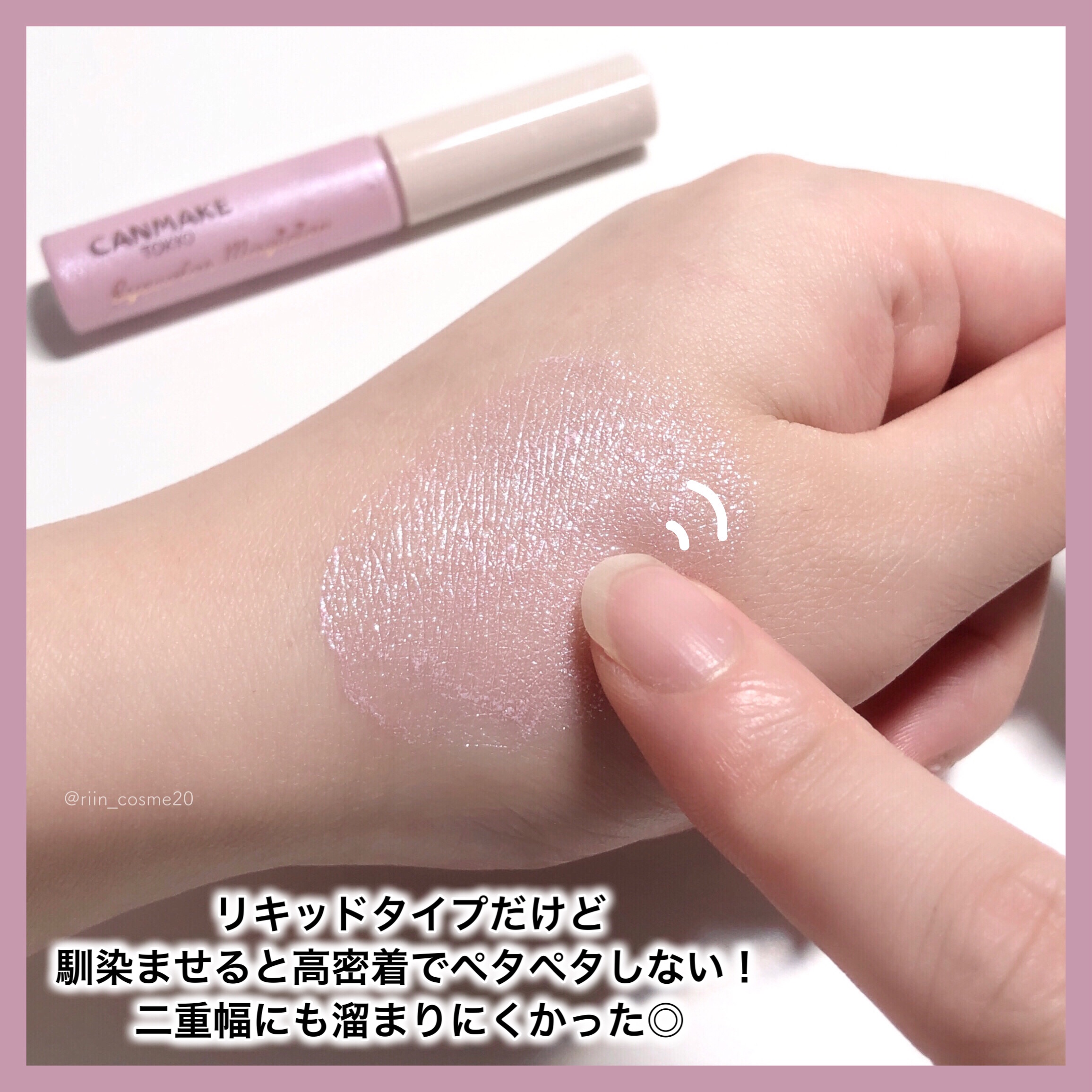 - リッチな輝きが長時間続く サラサラ仕上げのリキッドアイシャドウ 塗り心地はみずみずしくなめらかなのに、伸ばしていくうちにサラサラに変わる 魔法みたいなリキッドアイシャドウ♡ 速乾だからヨレにくく、ふたえのラインにたまりにくい! リキッドアイシャドウならではの輝きが長時間続きます。