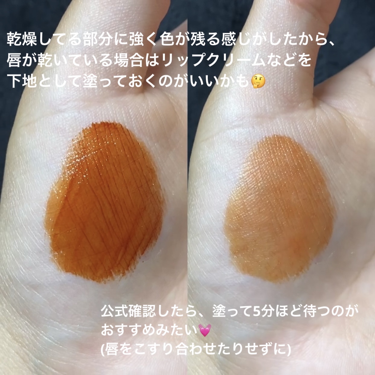- ツヤ膜でLIPカラーを閉じ込める 塗ってから「5分」でかわいい唇完成♥ツヤがあふれ出るオイルinウォーターティント 水に対して約2倍のオイル成分を配合した「オイルinウォーター処方」 時間経過でツヤ膜がじゅわ~っとあふれ出し、 まるでグロスを重ねたような仕上がりに。みずみずしいツヤ感が持続します。 塗布後、時間経過(※)で色が定着して食べても飲んでも血色長持ち。 (※定着には個人差があります。弊社5分推奨) 高密着で唇に溶け込むように色づきます。 コップやペットボトルへの色移りがしにくくなります。