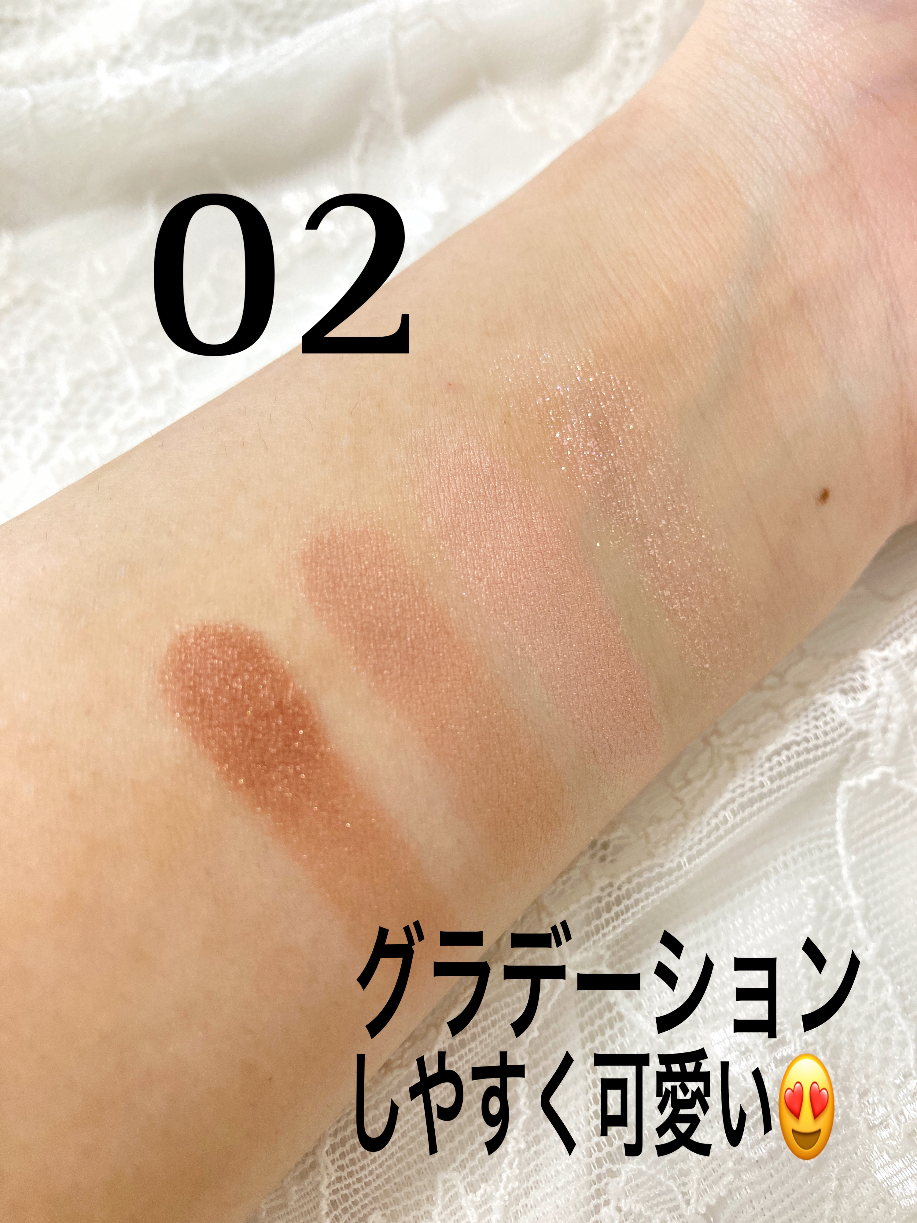 - ラメ・パール・マット3質感の4色アイシャドウ。 肌馴染みの良いベージュを基調としたカラー。ラメ・パール・マットの3質感を重ねて、自然にまぶたを強調し奥行のある大きな目元へ。 しっとり溶け込むような柔らかなパウダーなので、スルスル伸びてまぶたにピタッと密着。保湿成分(スクワラン・ホホバ種子油)配合。