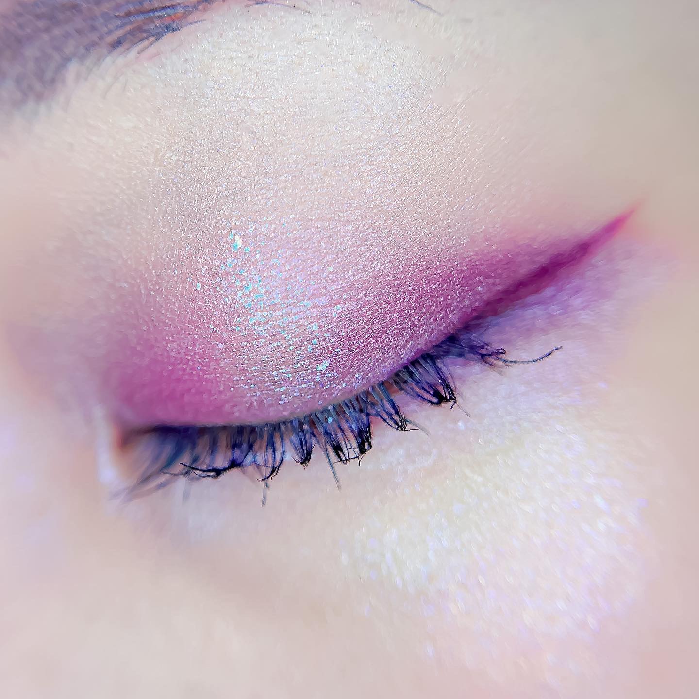 ベースに右上、目頭から黒目上に真ん中、黒目〜目尻に右下を、左上を目頭にくの字に塗ってもらいました✨ ピンクサクラよりもクールな感じで、目で見た色より私の肌では紫っぽく発色しました😍 上2つはラメはぎっしりでときめく💓 ブラウンメイクがとても苦手だけれどこれならブラウンメイク出来そう👌(かなり紫寄りですが) くすみ感は強いので苦手な方は厳しいかも…(特に真ん中) クールな印象になるので大人顔さん向けor大人顔になりたい方向けのイメージです✨