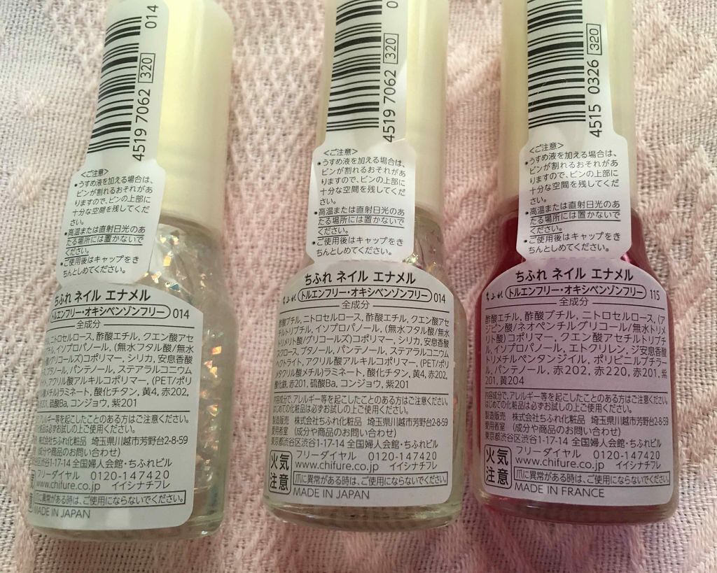 - <002 透明ラメ> 着色成分 (PET/ポリメタクリル酸メチル)ラミネート 適量 〃 ホウケイ酸(Ca/Al) 適量 〃 酸化チタン 適量 〃 グンジョウ 適量 〃 黄4 適量 〃 赤202 適量 〃 酸化鉄 適量 〃 コンジョウ 適量 〃 酸化スズ 適量 〃 紫201 適量 皮膜形成成分 ニトロセルロース 14.09% 〃 (無水フタル酸/無水トリメリト酸/グリコールズ)コポリマー 5.75% 〃 (アジピン酸/ネオペンチルグリコール/無水トリメリト酸)コポリマー 適量 保湿成分 パンテノール 適量 油性エモリエント成分 ジ安息香酸DPG 適量 可塑剤 クエン酸アセチルトリブチル 7.36% 分散剤 シリカ 2.46% 表面処理剤 水酸化Al 適量 〃 トリエトキシカプリリルシラン 適量 〃 メチコン 適量 増粘剤 ステアラルコニウムベントナイト 適量 溶剤 酢酸エチル 12.32% 〃 イソプロパノール 6.04% 〃 ブタノール 1.71% 基剤 酢酸ブチル 全量を100%とする <003 シルバー系ラメ> 着色成分 PET 適量 〃 (PET/ポリメタクリル酸メチル)ラミネート 適量 〃 ポリウレタン-11 適量 〃 Al 適量 〃 酸化チタン 適量 〃 黄4 適量 〃 赤202 適量 〃 酸化鉄 適量 〃 コンジョウ 適量 〃 紫201 適量 皮膜形成成分 ニトロセルロース 13.33% 〃 (無水フタル酸/無水トリメリト酸/グリコールズ)コポリマー 5.44% 〃 (アジピン酸/ネオペンチルグリコール/無水トリメリト酸)コポリマー 適量 保湿成分 パンテノール 適量 油性エモリエント成分 ジ安息香酸DPG 適量 可塑剤 クエン酸アセチルトリブチル 6.97% 分散剤 安息香酸スクロース 4.00% 〃 シリカ 2.33% 退色防止剤 メトキシケイヒ酸エチルヘキシル 1.00% 成分の酸化防止剤 BHT 適量 増粘剤 ステアラルコニウムベントナイト 適量 表面処理剤 水酸化Al 適量 〃 メチコン 適量 〃 トリエトキシカプリリルシラン 適量 溶剤 酢酸エチル 11.66% 〃 イソプロパノール 5.71% 〃 ブタノール 1.61% 基剤 酢酸ブチル 全量を100%とする <004 ゴールド系ラメ> 着色成分 (PET/Al)ラミネート 適量 〃 PET 適量 〃 (PET/ポリメタクリル酸メチル)ラミネート 適量 〃 黄4 適量 〃 ポリウレタン-11 適量 〃 赤202 適量 〃 Al 適量 〃 酸化チタン 適量 〃 酸化鉄 適量 〃 コンジョウ 適量 〃 紫201 適量 皮膜形成成分 ニトロセルロース 13.53% 〃 (無水フタル酸/無水トリメリト酸/グリコールズ)コポリマー 5.52% 〃 (アジピン酸/ネオペンチルグリコール/無水トリメリト酸)コポリマー 適量 保湿成分 パンテノール 適量 油性エモリエント成分 ジ安息香酸DPG 適量 可塑剤 クエン酸アセチルトリブチル 7.07% 分散剤 安息香酸スクロース 4.00% 〃 シリカ 2.37% 退色防止剤 メトキシケイヒ酸エチルヘキシル 1.00% 成分の酸化防止剤 BHT 適量 増粘剤 ステアラルコニウムベントナイト 適量 表面処理剤 水酸化Al 適量 〃 メチコン 適量 〃 トリエトキシカプリリルシラン 適量 溶剤 酢酸エチル 11.84% 〃 イソプロパノール 5.80% 〃 ブタノール 1.64% 基剤 酢酸ブチル 全量を100%とする <007 ホワイト系> 着色成分 酸化チタン 適量 〃 黄4 適量 〃 赤202 適量 〃 酸化鉄 適量 〃 赤201 適量 〃 硫酸Ba 適量 〃 コンジョウ 適量 皮膜形成成分 ニトロセルロース 12.92% 〃 (無水フタル酸/無水トリメリト酸/グリコールズ)コポリマー 6.99% 〃 (アジピン酸/フマル酸/フタル酸/トリシクロデカンジメタノール)コポリマー 1.16% 〃 アクリル酸アルキルコポリマー 適量 保湿成分 パンテノール 適量 可塑剤 クエン酸アセチルトリブチル 7.80% 〃 クエン酸 0.02% 増粘剤 ステアラルコニウムヘクトライト 1.34% 粘度調整剤 ジメチコン 適量 〃 ジ(C12-15)パレス-2リン酸 適量 溶剤 酢酸エチル 20.13% 〃 イソプロパノール 5.61% 基剤 酢酸ブチル 全量を100%とする <014 透明ラメ> 着色成分 (PET/ポリメタクリル酸メチル)ラミネート 適量 〃 酸化チタン 適量 〃 黄4 適量 〃 赤202 適量 〃 酸化鉄 適量 〃 赤201 適量 〃 硫酸Ba 適量 〃 コンジョウ 適量 〃 紫201 適量 皮膜形成成分 ニトロセルロース 13.98% 〃 (無水フタル酸/無水トリメリト酸/グリコールズ)コポリマー 5.71% 〃 アクリル酸アルキルコポリマー 適量 保湿成分 パンテノール 適量 可塑剤 クエン酸アセチルトリブチル 7.30% 分散剤 シリカ 2.44% 〃 安息香酸スクロース 2.00% 増粘剤 ステアラルコニウムヘクトライト 適量 溶剤 酢酸エチル 12.22% 〃 イソプロパノール 5.99% 〃 ブタノール 1.69% 基剤 酢酸ブチル 全量を100%とする <015 透明ラメ> 着色成分 (PET/ポリメタクリル酸メチル)ラミネート 適量 〃 酸化チタン 適量 〃 黄4 適量 〃 赤202 適量 〃 酸化鉄 適量 〃 赤201 適量 〃 硫酸Ba 適量 〃 コンジョウ 適量 〃 紫201 適量 皮膜形成成分 ニトロセルロース 13.98% 〃 (無水フタル酸/無水トリメリト酸/グリコールズ)コポリマー 5.71% 〃 アクリル酸アルキルコポリマー 適量 保湿成分 パンテノール 適量 可塑剤 クエン酸アセチルトリブチル 7.30% 分散剤 シリカ 2.44% 〃 安息香酸スクロース 2.00% 増粘剤 ステアラルコニウムヘクトライト 適量 溶剤 酢酸エチル 12.22% 〃 イソプロパノール 5.99% 〃 ブタノール 1.69% 基剤 酢酸ブチル 全量を100%とする <016 カラフルラメ> 酢酸ブチル, ニトロセルロース, 酢酸エチル, クエン酸ア