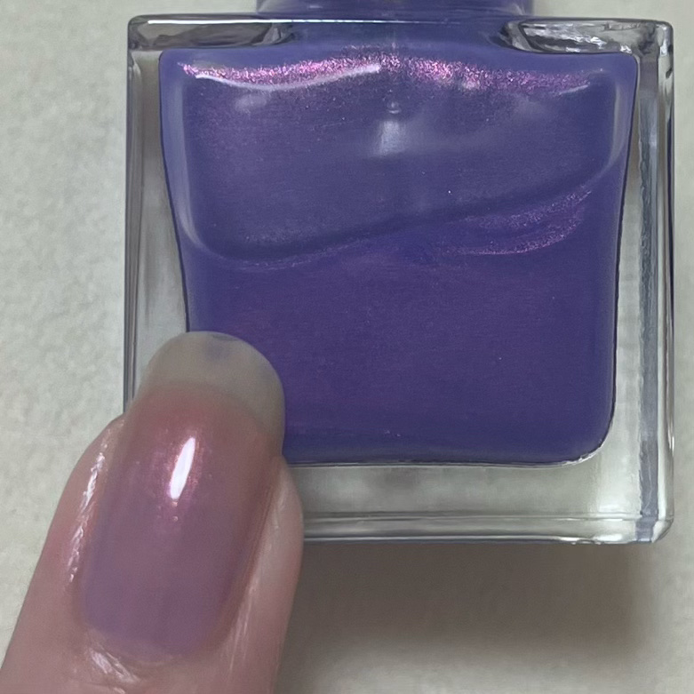 コゼットジョリの押し花ネイルです。人差し指と小指は桜そそを2度塗りで、若干の透け感あり。中指は三度塗りしましたら少しパープルよりなにりました。三度塗りすると、はぎたおやかの一度塗りと色の雰囲気が似てるかな?と思いました。親指と薬指はしゃくやく...