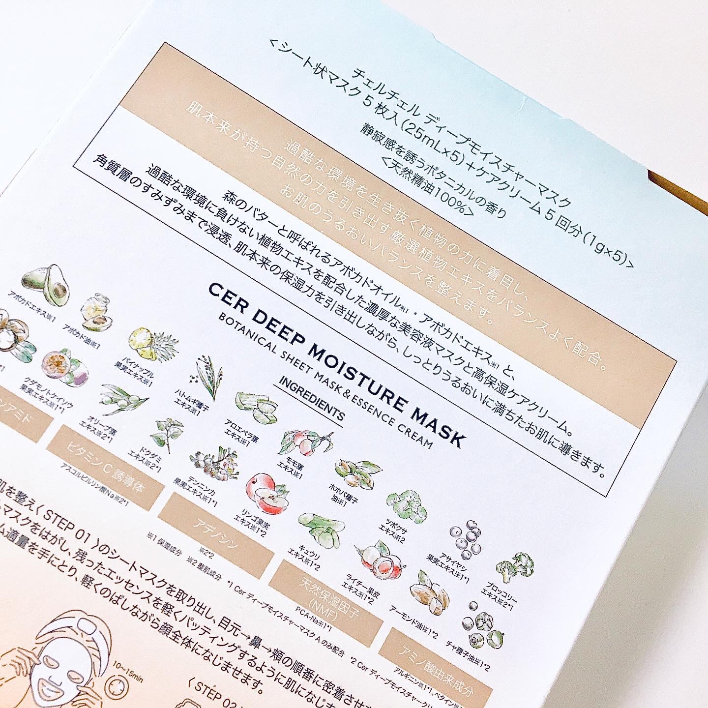- Cer ディープモイスチャーマスク A 水、BG、グリセリン、1,2-ヘキサンジオール、ヒアルロン酸Na、アボカドエキス、アボカド油、パイナップル果実エキス、クダモノトケイソウ果実エキス、アサイヤシ果実エキス、テンニンカ果実エキス、モモ葉エキス、アロエベラ葉エキス、オリーブ葉エキス、ブロッコリーエキス、ハトムギ種子エキス、ツボクサエキス、ドクダミエキス、ホホバ種子油、ナイアシンアミド、アスコルビルリン酸Na、酢酸トコフェロール、ピリドキシンHCl、パントテン酸Ca、グリコシルトレハロース、ベタイン、シア脂、PCA-Na、ビスPEG-18メチルエーテルジメチルシラン、オクテニルコハク酸デンプンNa、マルトデキストリン、シリカ、オリーブ油脂肪酸セテアリル、オリーブ油脂肪酸ソルビタン、セスキオレイン酸ソルビタン、加水分解水添デンプン、ジメチコン、キサンタンガム、カルボマー、アルギニン、PEG-60水添ヒマシ油、フェノキシエタノール、EDTA-2Na、クスノキ樹皮油、オレンジ果皮油、イランイラン花油、ライム油、ジャスミン油、エンピツビャクシン油 Cer ディープモイスチャークリーム A 水、アロエベラ葉エキス、トリ(カプリル酸/カプリン酸)グリセリル、ペンチレングリコール、BG、スクワレン、ポリソルベート80、ヒアルロン酸Na、アボカドエキス、アボカド油、パイナップル果実エキス、ライチー果皮エキス、モモ葉エキス、ハトムギ種子エキス、ツボクサエキス、リンゴ果実エキス、キュウリエキス、ホホバ種子油、アーモンド油、チャ種子油、1,2-ヘキサンジオール、ベタイン、アラントイン、アデノシン、パンテノール、酢酸トコフェロール、パルミトイルペンタペプチド-4、(C13,14)イソパラフィン、トリステアリン酸ソルビタン、ポリアクリル酸Na、カプリル酸グリセリル、ジメチコン、ラウレス-7、セテアリルアルコール、EDTA-2Na、クスノキ樹皮油、オレンジ果皮油、イランイラン花油、ライム油、ジャスミン油、エンピツビャクシン油