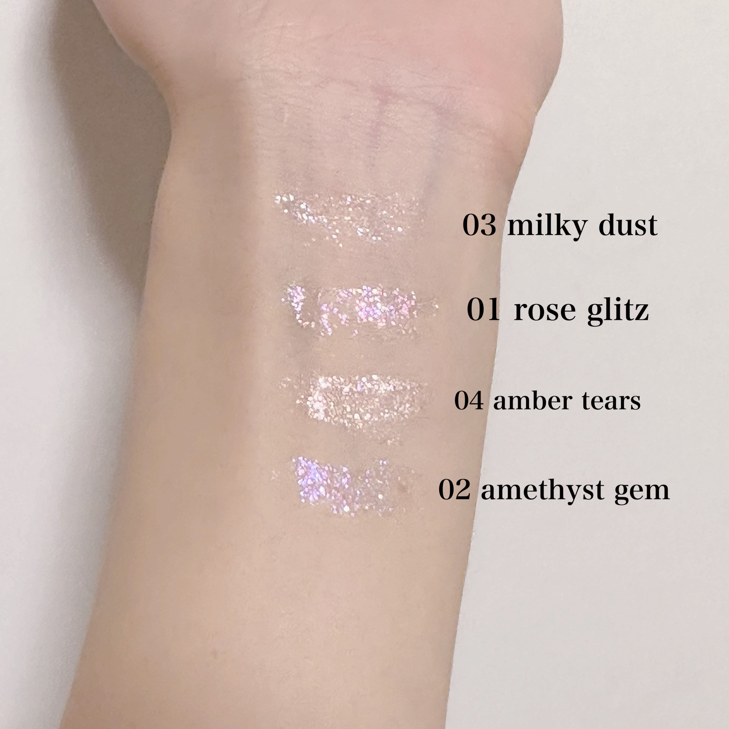 - <01 rose glitz> 水、ポリブチレンテレフタレート、ポリメタクリル酸メチル、BG、PEG-32、PEG-6、ホウケイ酸(Ca/Na)、ホウケイ酸(Ca/Al)、グリセリン、アボカドエキス、トコフェロール、ラベンダー花エキス、ローズマリー葉エキス、PVP、t-ブタノール、(アクリル酸ヒドロキシエチル/アクリロイルジメチルタウリンNa)コポリマー、(アクリロイルジメチルタウリンアンモニウム/VP)コポリマー、イソステアリン酸ソルビタン、エチルヘキシルグリセリン、シリカ、スクワラン、ポリソルベート60、合成フルオロフロゴパイト、酸化スズ、フェノキシエタノール、メチルパラベン、香料、酸化チタン、酸化鉄 <02 amethyst gem> 水、ポリブチレンテレフタレート、ポリメタクリル酸メチル、BG、ホウケイ酸(Ca/Na)、PEG-32、PEG-6、ホウケイ酸(Ca/Al)、グリセリン、アボカドエキス、トコフェロール、ラベンダー花エキス、ローズマリー葉エキス、PVP、t-ブタノール、(アクリル酸ヒドロキシエチル/アクリロイルジメチルタウリンNa)コポリマー、(アクリロイルジメチルタウリンアンモニウム/VP)コポリマー、イソステアリン酸ソルビタン、エチルヘキシルグリセリン、シリカ、スクワラン、タルク、ポリソルベート60、合成フルオロフロゴパイト、酸化スズ、フェノキシエタノール、メチルパラベン、香料、グンジョウ、酸化チタン、酸化鉄 <03 milky dust> 水、ポリブチレンテレフタレート、ポリメタクリル酸メチル、BG、PEG-32、PEG-6、ホウケイ酸(Ca/Na)、グリセリン、アボカドエキス、トコフェロール、ラベンダー花エキス、ローズマリー葉エキス、PVP、t-ブタノール、(アクリル酸ヒドロキシエチル/アクリロイルジメチルタウリンNa)コポリマー、(アクリロイルジメチルタウリンアンモニウム/VP)コポリマー、イソステアリン酸ソルビタン、エチルヘキシルグリセリン、スクワラン、ポリソルベート60、酸化スズ、フェノキシエタノール、メチルパラベン、香料、酸化チタン <04 amber tears> 水、ホウケイ酸(Ca/Na)、PET、BG、PEG-32、PEG-6、グリセリン、アボカドエキス、トコフェロール、ラベンダー花エキス、ローズマリー葉エキス、PVP、t-ブタノール、(アクリル酸ヒドロキシエチル/アクリロイルジメチルタウリンNa)コポリマー、(アクリロイルジメチルタウリンアンモニウム/VP)コポリマー、イソステアリン酸ソルビタン、エチルヘキシルグリセリン、シリカ、スクワラン、ホウケイ酸(Ca/Al)、ポリウレタン-11、ポリソルベート60、合成フルオロフロゴパイト、酸化スズ、フェノキシエタノール、メチルパラベン、香料、Al、マイカ、酸化チタン、酸化鉄