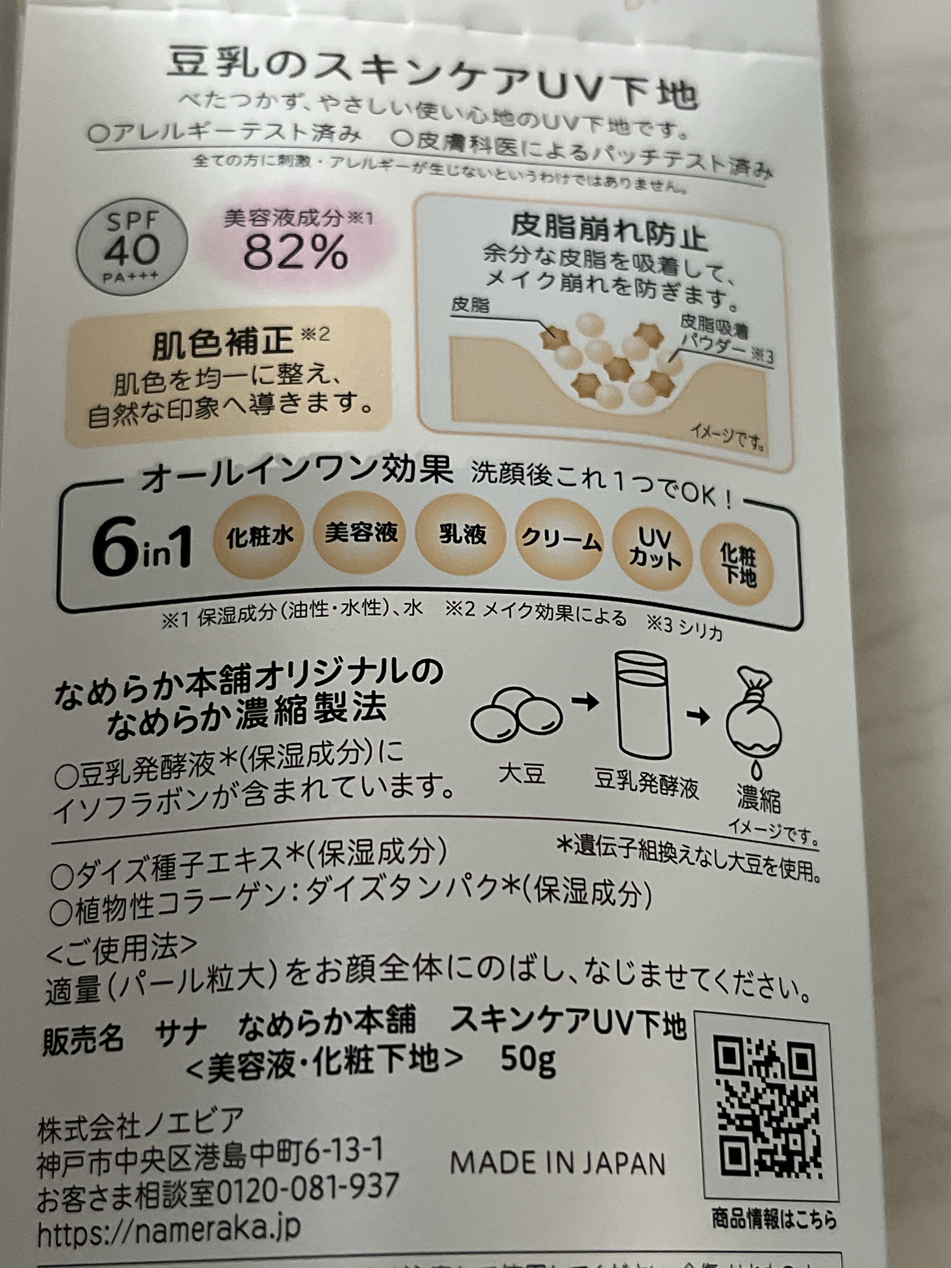 - <スキンケアUV下地> 豆乳のスキンケアUV下地。低刺激&ノンケミカル(紫外線吸収剤不使用)。肌色補正(メイク効果による)&皮脂崩れ防止。化粧水・美容液・乳液・クリーム・UVカット・化粧下地の1本6役。SPF40・PA+++。