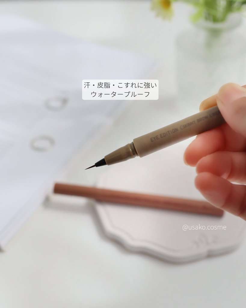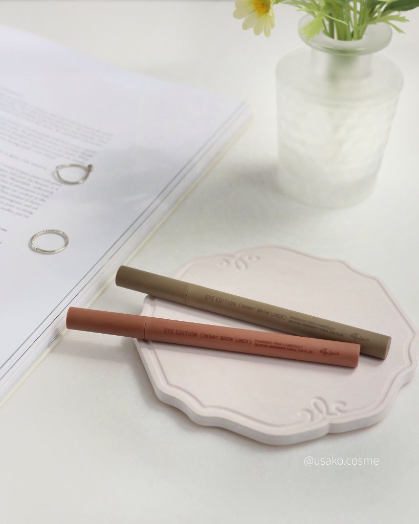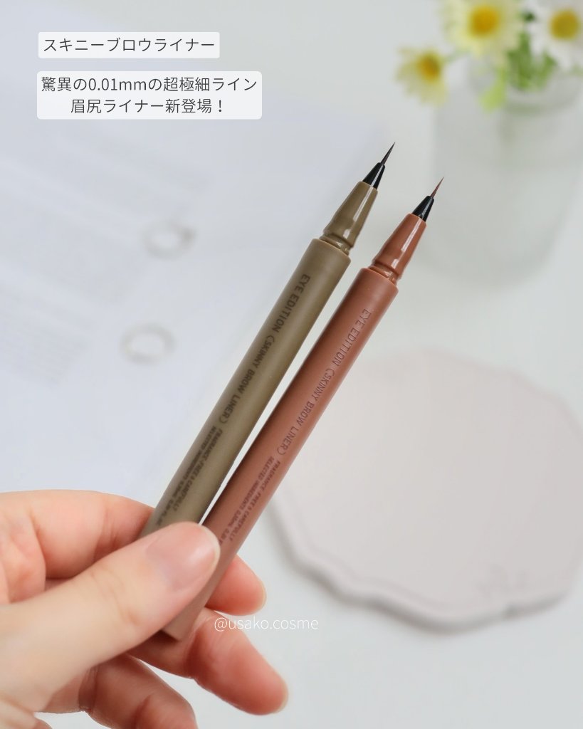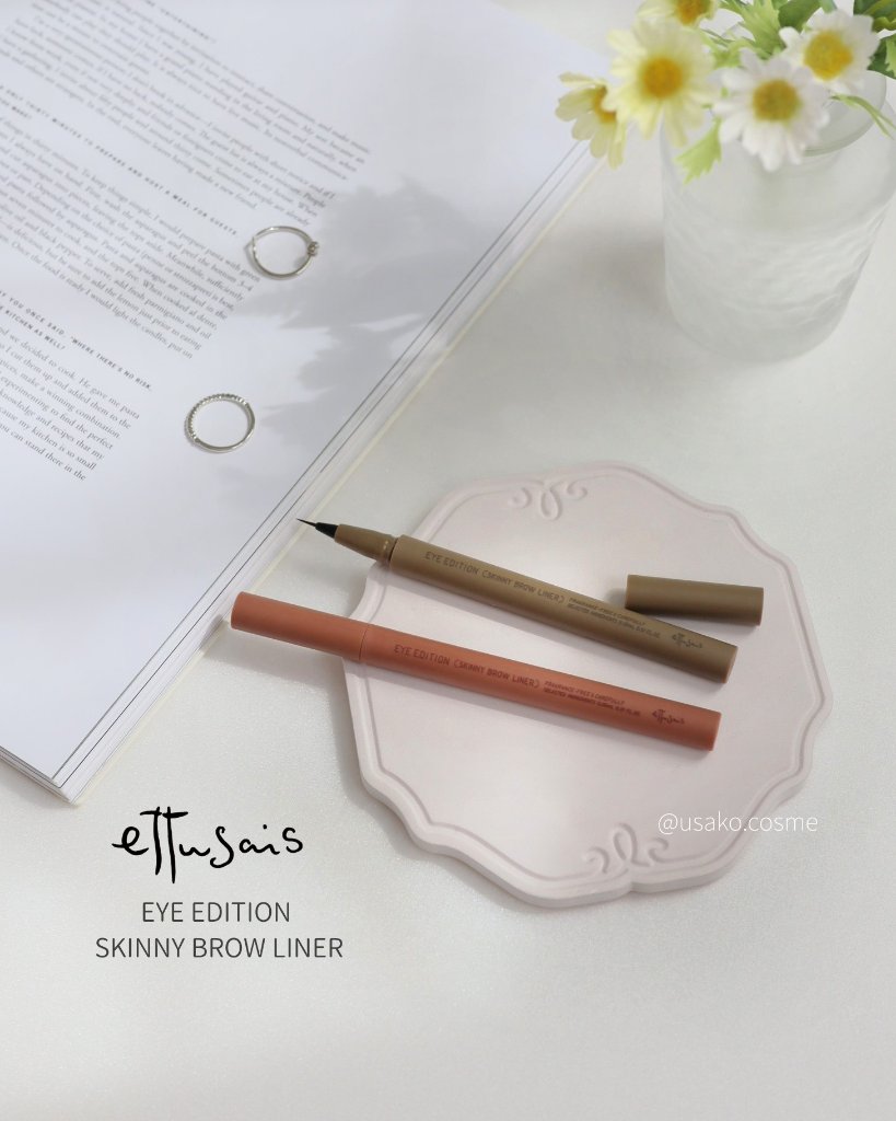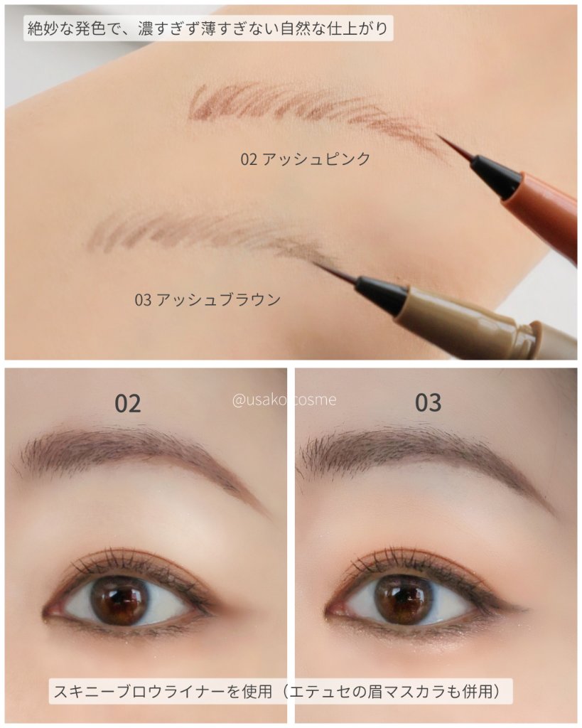 エテュセのスキニーアイブロウライナーから新色のナチュラルブラウンが出たよ♡ 0.01mmの超極細ラインで毛流れに沿って1本1本描き足すように描いていくと自眉のようにリアルな眉が完成👍 濃すぎず薄すぎない絶妙な発色でとっても自然な仕上がり✨