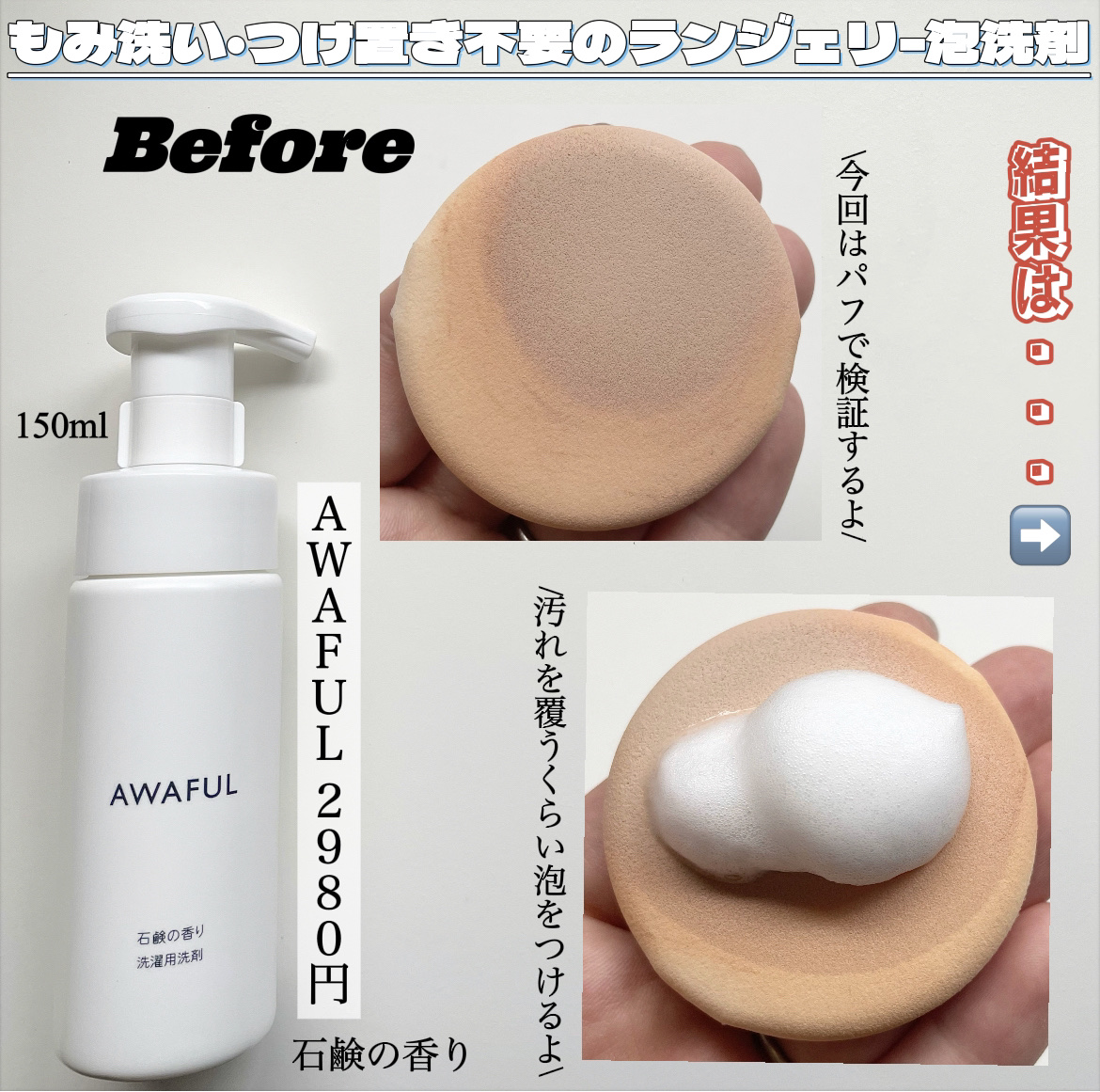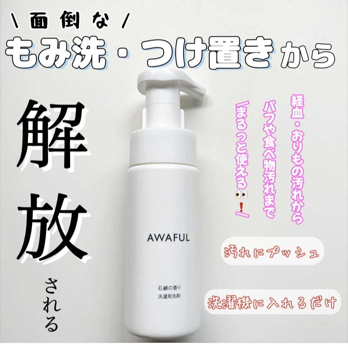 鎌倉ライフさまからいただきました。AWAFULランジェリー洗剤もみ洗い、つけ置き不要✊🏻🌟こすらず洗えるランジェリー洗剤。経血やおりもの、ファンデーション汚れや食べ物汚れにも使えます。使い方は汚れた部分に泡をだしてそのまま洗濯機に入れるだけと...