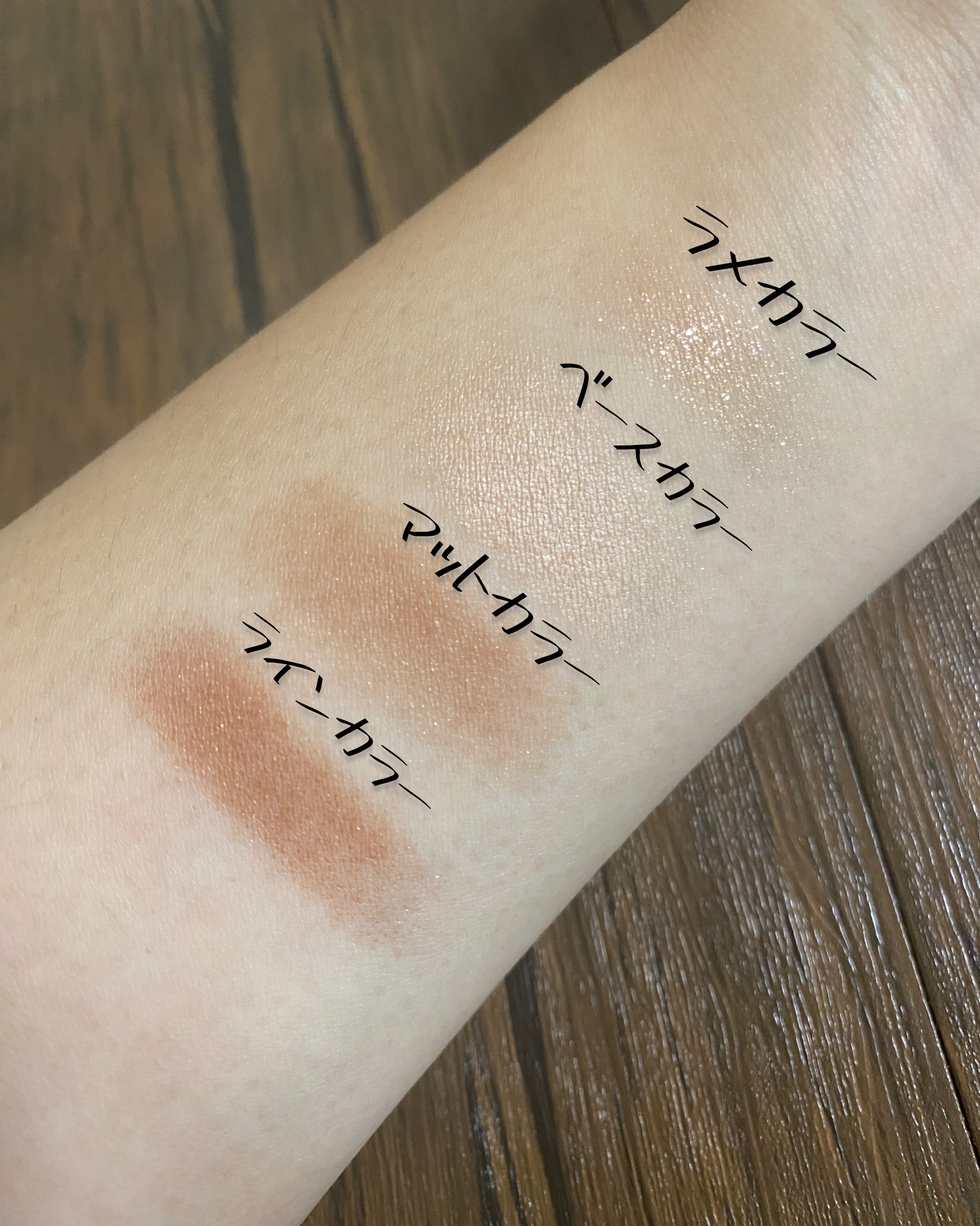 - ラメ・パール・マット3質感の4色アイシャドウ。 肌馴染みの良いベージュを基調としたカラー。ラメ・パール・マットの3質感を重ねて、自然にまぶたを強調し奥行のある大きな目元へ。 しっとり溶け込むような柔らかなパウダーなので、スルスル伸びてまぶたにピタッと密着。保湿成分(スクワラン・ホホバ種子油)配合。