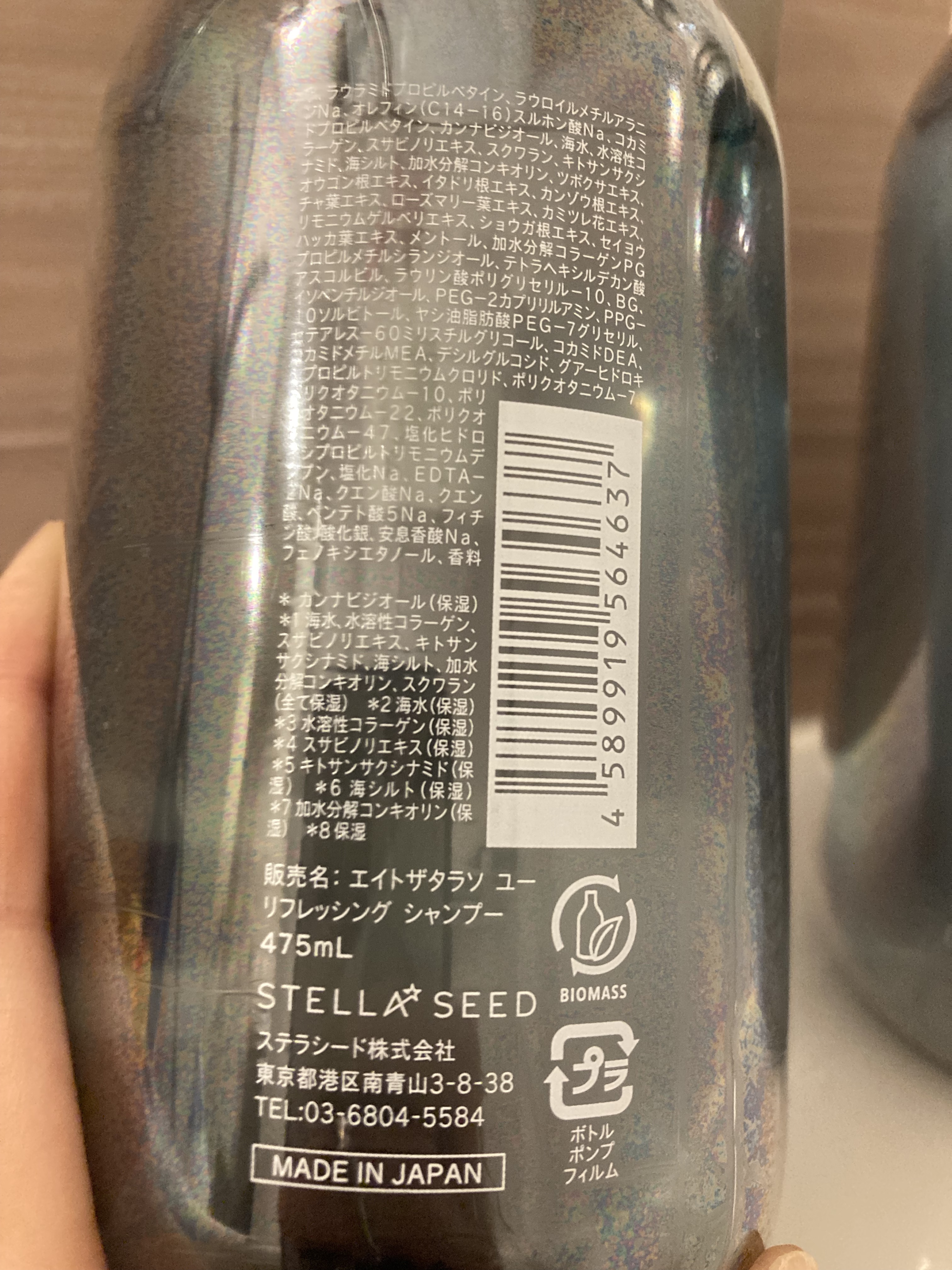 - <シャンプー> 水、ラウラミドプロピルベタイン、ラウロイルメチルアラニンNa、オレフィン(C14-16)スルホン酸Na、コカミドプロピルベタイン、カンナビジオール、海水、水溶性コラーゲン、スサビノリエキス、スクワラン、キトサンサクシナミド、海シルト、加水分解コンキオリン、ツボクサエキス、オウゴン根エキス、イタドリ根エキス、カンゾウ根エキス、チャ葉エキス、ローズマリー葉エキス、カミツレ花エキス、リモニウムゲルベリエキス、ショウガ根エキス、セイヨウハッカ葉エキス、メントール、加水分解コラーゲンPGプロピルメチルシランジオール、テトラヘキシルデカン酸アスコルビル、ラウリン酸ポリグリセリル-10、BG、イソペンチルジオール、PEG-2カプリリルアミン、PPG-10ソルビトール、ヤシ油脂肪酸PEG-7グリセリル、セテアレス-60ミリスチルグリコール、コカミドDEA、コカミドメチルMEA、デシルグルコシド、グアーヒドロキシプロピルトリモニウムクロリド、ポリクオタニウム-7、ポリクオタニウム-10、ポリクオタニウム-22、ポリクオタニウム-47、塩化ヒドロキシプロピルトリモニウムデンプン、塩化Na、EDTA-2Na、クエン酸Na、クエン酸、ペンテト酸5Na、フィチン酸、酸化銀、安息香酸Na、フェノキシエタノール、香料 <ヘアトリートメント> 水、ステアリルアルコール、ベヘントリモニウムクロリド、ジメチコン、セタノール、シクロペンタシロキサン、カンナビジオール、海水、水溶性コラーゲン、スサビノリエキス、スクワラン、キトサンサクシナミド、海シルト、加水分解コンキオリン、ツボクサエキス、オウゴン根エキス、イタドリ根エキス、カンゾウ根エキス、チャ葉エキス、ローズマリー葉エキス、カミツレ花エキス、リモニウムゲルベリエキス、加水分解コラーゲンPGプロピルメチルシランジオール、テトラヘキシルデカン酸アスコルビル、コメヌカスフィンゴ糖脂質、スフィンゴ糖脂質、シロキクラゲ多糖体、クオタニウム-33、ポリクオタニウム-92、BG、グリセリン、トコフェロール、ヒドロキシエチルセルロース、ベヘナミドプロピルジメチルアミン、アルギニン、ジメチコノール、ペンチレングリコール、セテアリルグルコシド、DPG、セテアレス−7、セテス-15、セテアレス−25、グアーヒドロキシプロピルトリモニウムクロリド、プロパンジオール、塩化ヒドロキシプロピルトリモニウムデンプン、乳酸、乳酸Na、イソプロパノール、アモジメチコン、ビスセテアリルアモジメチコン、アミノプロピルジメチコン、ジココジモニウムクロリド、セテアリルアルコール、フェノキシエタノール、香料 <シャンプー詰め替え> 水、ラウラミドプロピルベタイン、ラウロイルメチルアラニンNa、オレフィン(C14-16)スルホン酸Na、コカミドプロピルベタイン、カンナビジオール、海水、水溶性コラーゲン、スサビノリエキス、スクワラン、キトサンサクシナミド、海シルト、加水分解コンキオリン、ツボクサエキス、オウゴン根エキス、イタドリ根エキス、カンゾウ根エキス、チャ葉エキス、ローズマリー葉エキス、カミツレ花エキス、リモニウムゲルベリエキス、ショウガ根エキス、セイヨウハッカ葉エキス、メントール、加水分解コラーゲンPGプロピルメチルシランジオール、テトラヘキシルデカン酸アスコルビル、ラウリン酸ポリグリセリル-10、BG、イソペンチルジオール、PEG-2カプリリルアミン、PPG-10ソルビトール、ヤシ油脂肪酸PEG-7グリセリル、セテアレス-60ミリスチルグリコール、コカミドDEA、コカミドメチルMEA、デシルグルコシド、グアーヒドロキシプロピルトリモニウムクロリド、ポリクオタニウム-7、ポリクオタニウム-10、ポリクオタニウム-22、ポリクオタニウム-47、塩化ヒドロキシプロピルトリモニウムデンプン、塩化Na、EDTA-2Na、クエン酸Na、クエン酸、ペンテト酸5Na、フィチン酸、酸化銀、安息香酸Na、フェノキシエタノール、香料 <ヘアトリートメント詰め替え> 水、ステアリルアルコール、ベヘントリモニウムクロリド、ジメチコン、セタノール、シクロペンタシロキサン、カンナビジオール、海水、水溶性コラーゲン、スサビノリエキス、スクワラン、キトサンサクシナミド、海シルト、加水分解コンキオリン、ツボクサエキス、オウゴン根エキス、イタドリ根エキス、カンゾウ根エキス、チャ葉エキス、ローズマリー葉エキス、カミツレ花エキス、リモニウムゲルベリエキス、加水分解コラーゲンPGプロピルメチルシランジオール、テトラヘキシルデカン酸アスコルビル、コメヌカスフィンゴ糖脂質、スフィンゴ糖脂質、シロキクラゲ多糖体、クオタニウム-33、ポリクオタニウム-92、BG、グリセリン、トコフェロール、ヒドロキシエチルセルロース、ベヘナミドプロピルジメチルアミン、アルギニン、ジメチコノール、ペンチレングリコール、セテアリルグルコシド、DPG、セテアレス−7、セテス-15、セテアレス−25、グアーヒドロキシプロピルトリモニウムクロリド、プロパンジオール、塩化ヒ