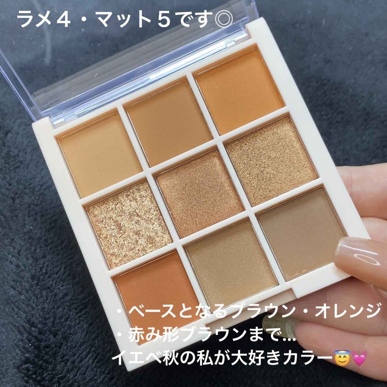 - ひとつでマット・シアーマット・パール・グリッター・ラメの多彩な質感とカラーバリエーションが楽しめる9色アイシャドウパレット。微細粒子で肌にぴったりフィットして馴染み、発色の良さが続きます。