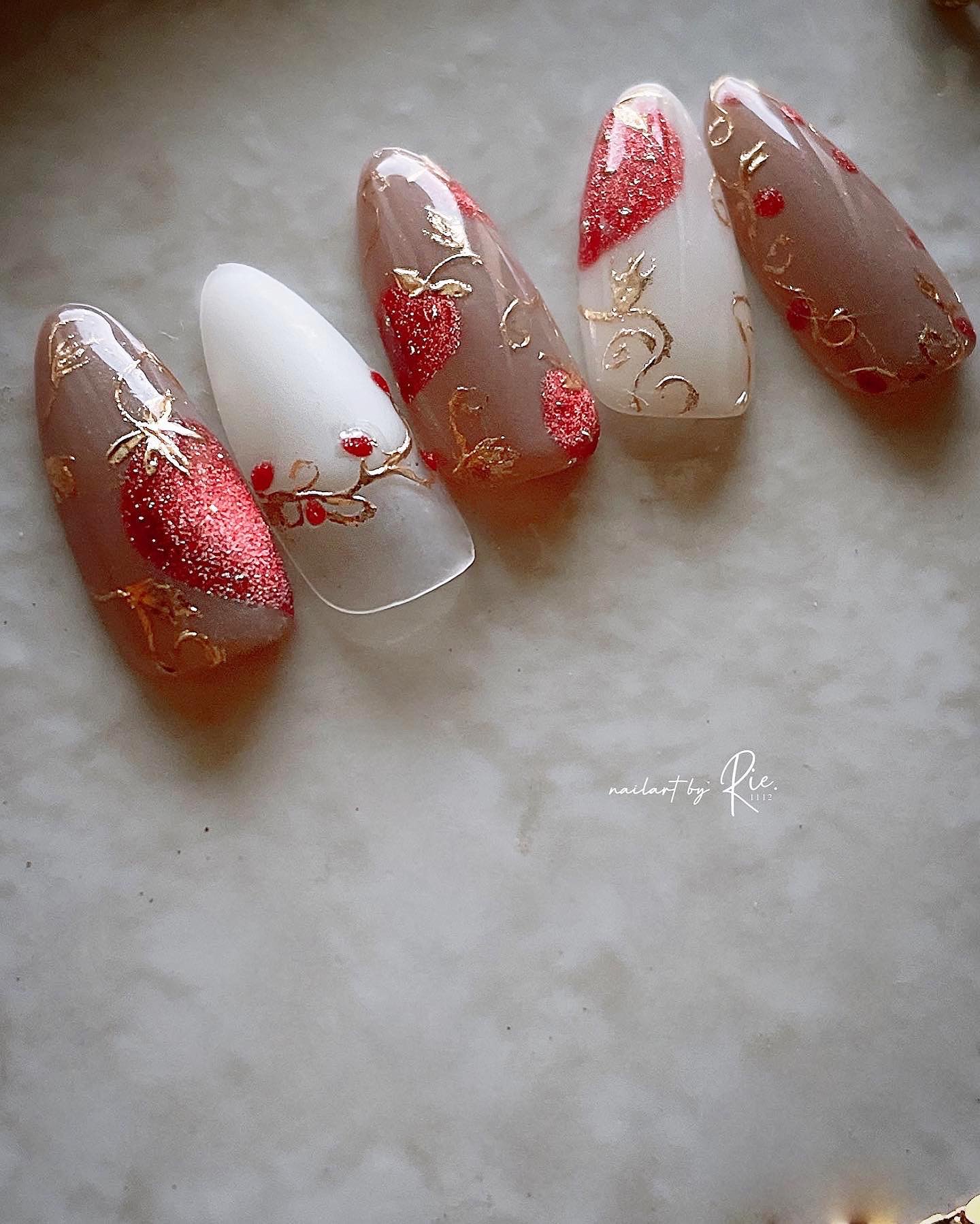 いちごはマグネットジェルでキラキラに、ゴールドのアイシングミラーを合わせました✨ ベースに使った、くすみピンク?グレージュ?ちゅるんとヌーディーなカラーがなんとも可愛くて推しです😌 マグネットがたくさん出ていて最近人気だけど、カラージェルもとっても塗りやすくて、ちゅるんと可愛いカラーが揃っています。くすみ系がお好きなかたにおすすめ♡