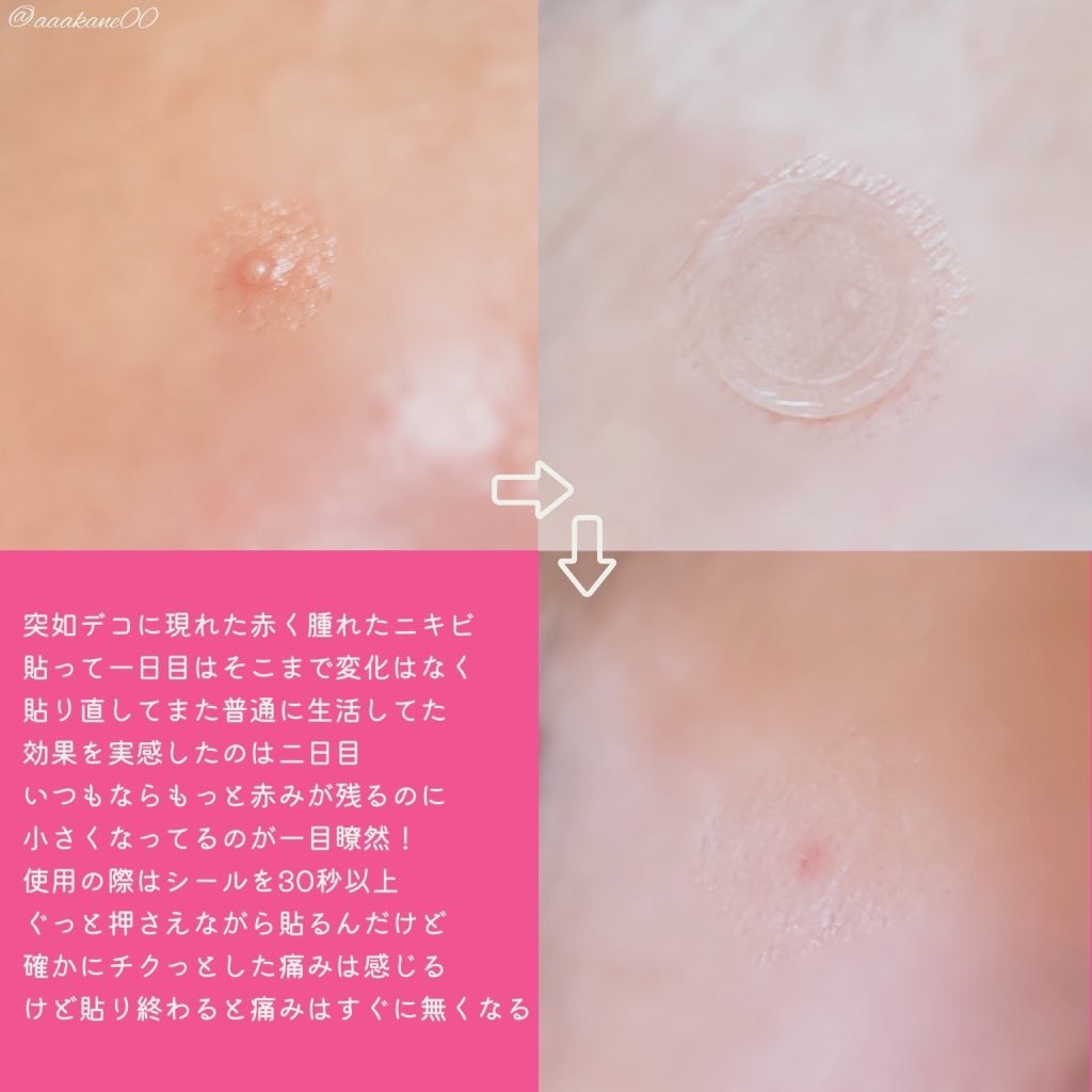 肌に溶け込み浸透される169個均一な "特許マイクロニードル"で有効成分を 肌の奥まで伝達✨皮膚浸透成功率80%以上! 剥がれにくい密着力のハイドロコロイド素材 →寝相が悪い私でも朝まで残ってました✌️ 使い方は簡単で 貼りたい部分の水分を拭き取り 台紙からパッチを外してシールを取る トラブル部分にニードルを貼って30秒抑えるだけ! 少しチクっとした感じがありますが 痛くないです!おでこにできたニキビに貼って 翌朝見てみると少し大きさがマシになってるように 思いました✨パッチが大きめで貼りやすいです! 肌低刺激テスト済み トラブル肌使用適合テスト済み