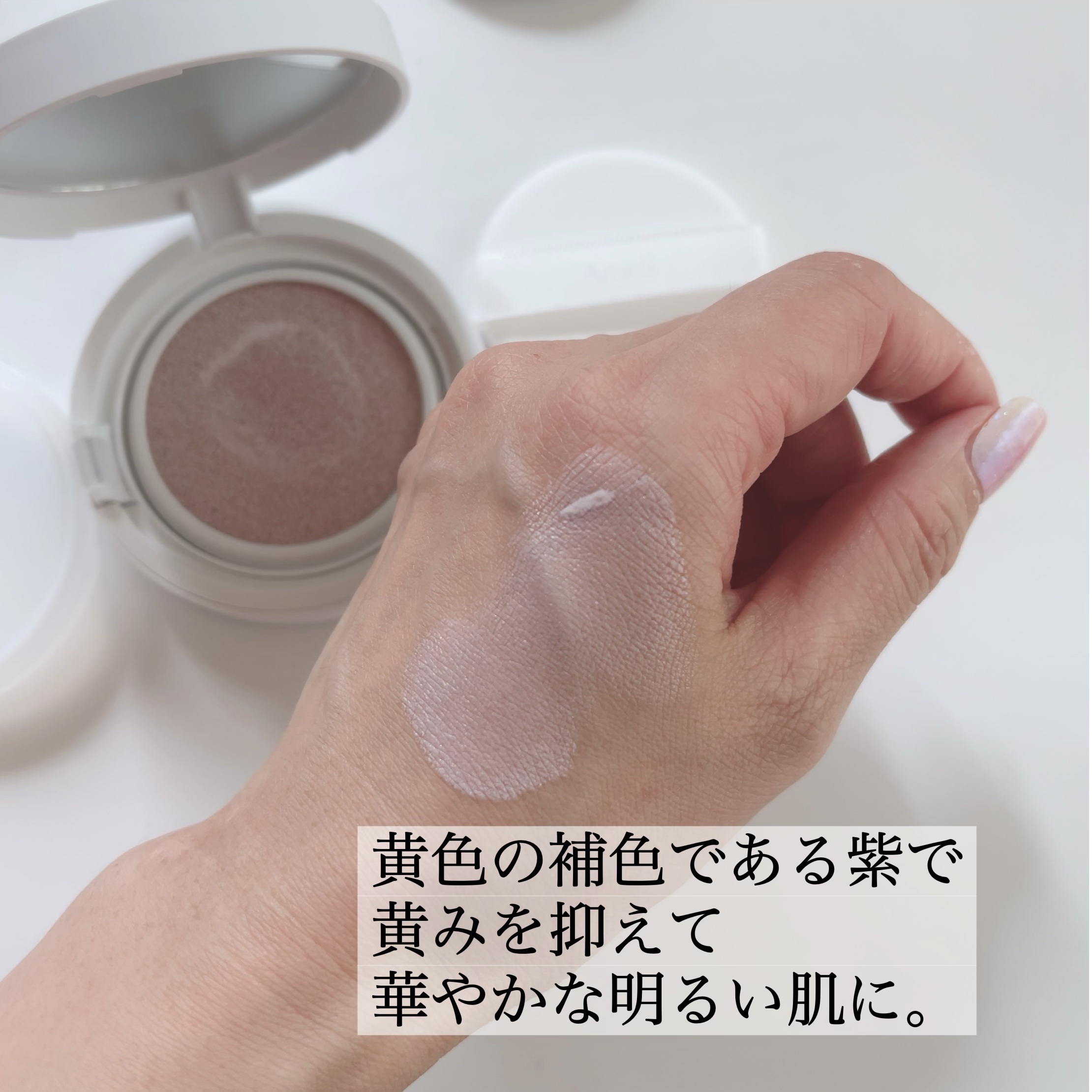紫色で黄ぐすみを補正して透明感のある華やかな肌へ🌿 水分感のあるみずみずしいテクスチャー カバー力はひかえめでセミマット仕上がり SPF50+ PA +++ 日やけ止め効果が高いのも◎