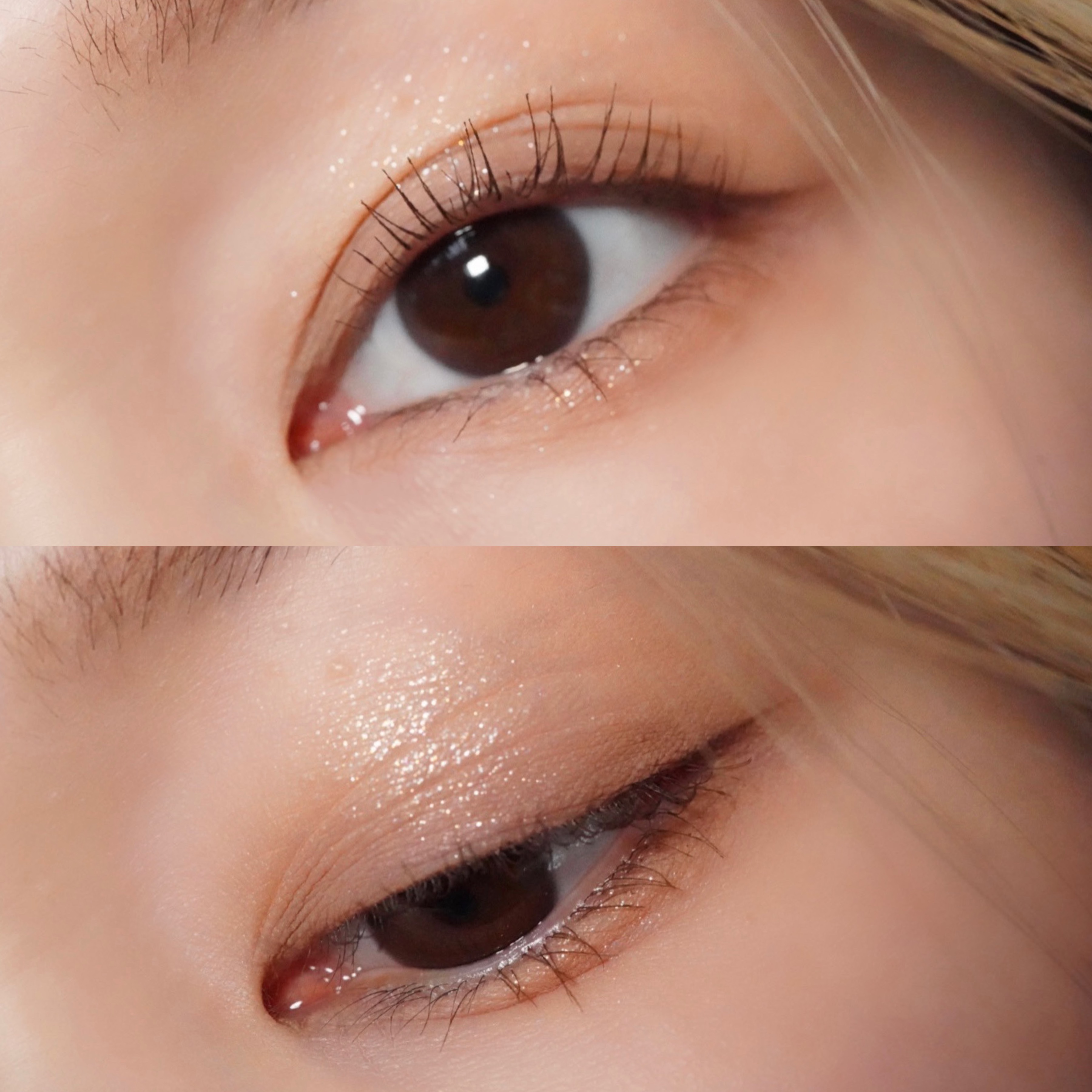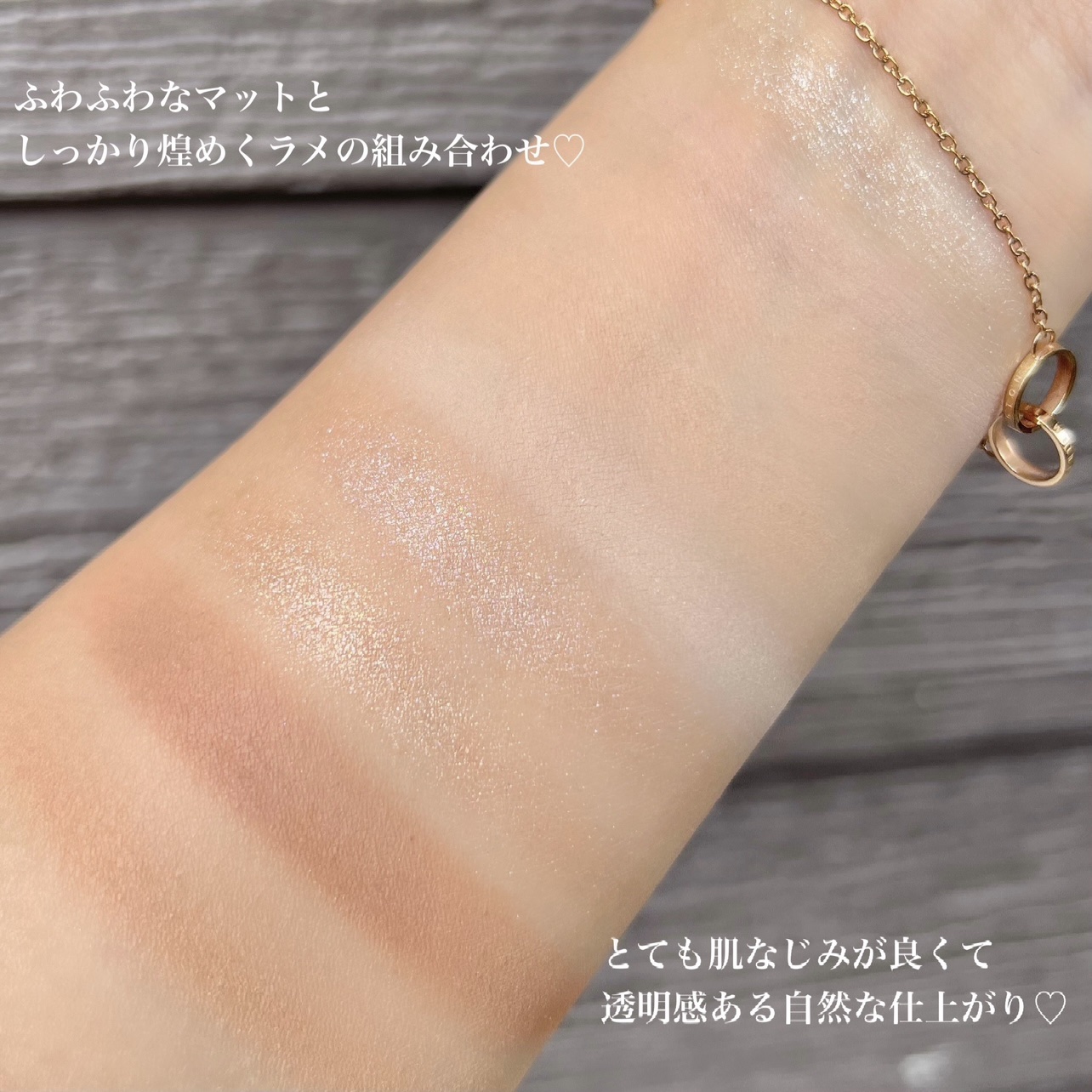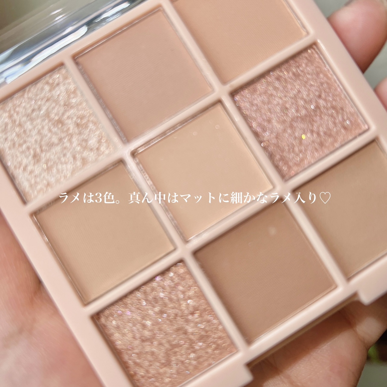 よくパレットのなかで明るいカラーをベースにまぶたに広く塗ることが多いのですが、パール感のあるカラーを避ける🙆♀️! パール感たっぷりの明るいカラーは涙袋に使うぐらい光を集めてぷっくり見せてくれるので、まぶたに広く使うと腫れぼったく見えがち😓 目元を明るくみせてくれたり、次に使うアイシャドウをぼかしやすくしてくれるけど、すっ飛ばしてメインのカラーを塗っちゃう✊🏻❤️🔥 涙袋にはたっぷり塗ってぷっくり見せる🙆♀️💕 シルキースフレアイズのマットタイプはすごく優れているな〜と感じました☺️💗 赤やオレンジなどは、入れすぎると腫れぼったく見えやすいので、見せたいカラーは下まぶた目尻にのせて色をたのしむ♡♡ パール感なしの透けマットだけじゃ物足りない… そう感じさせない華やかなラメが左上に入っているので黒目上と涙袋にのせるとすごく可愛い仕上がりに😍! 厄介な左右差のお陰でマットアイシャドウが好きになりました😌💕