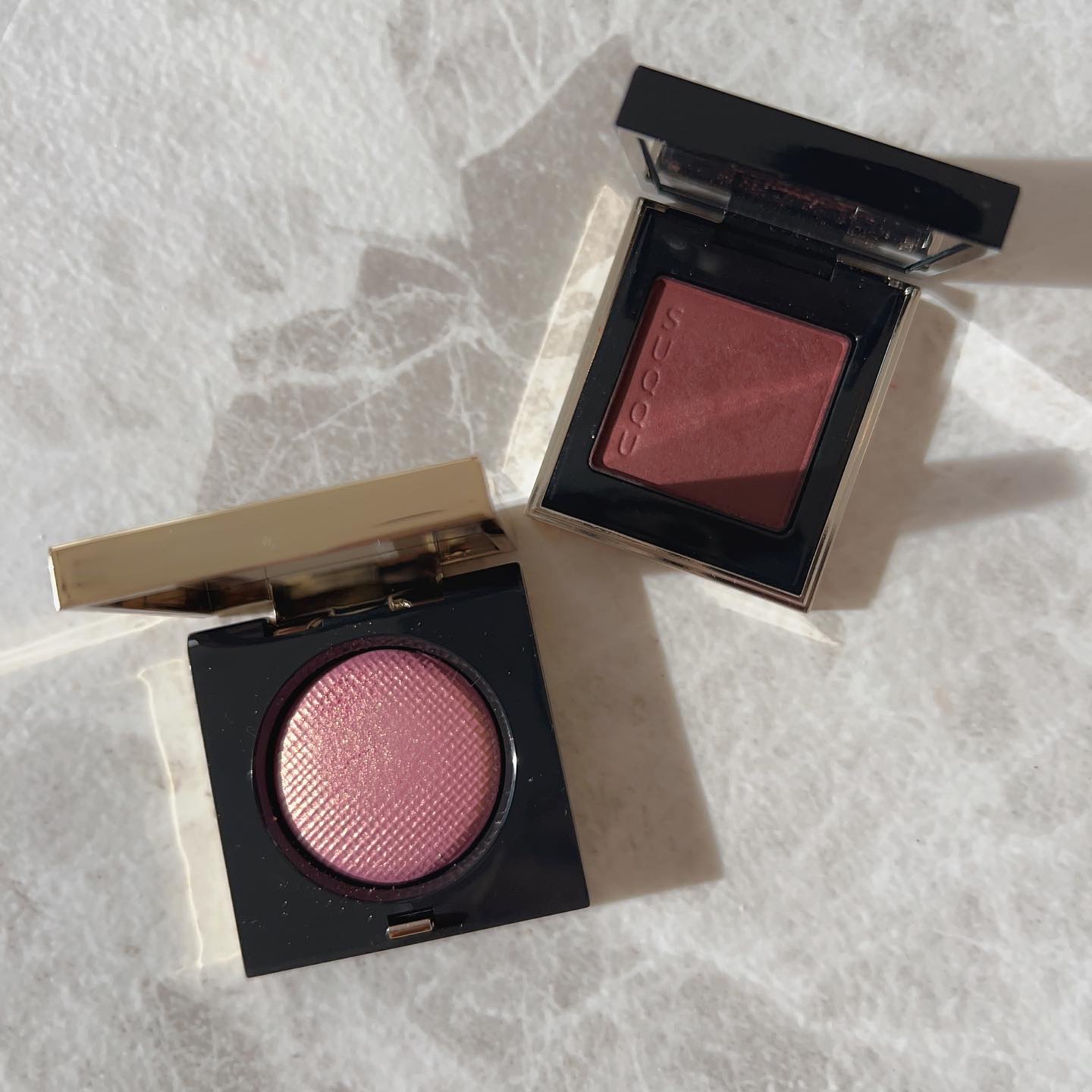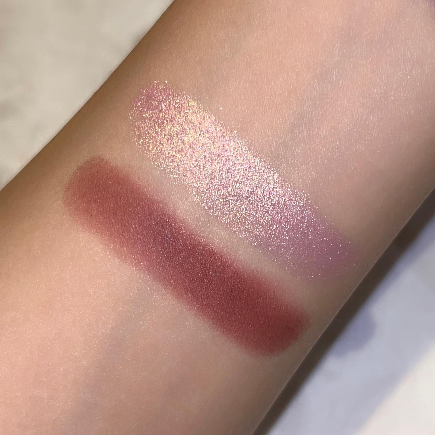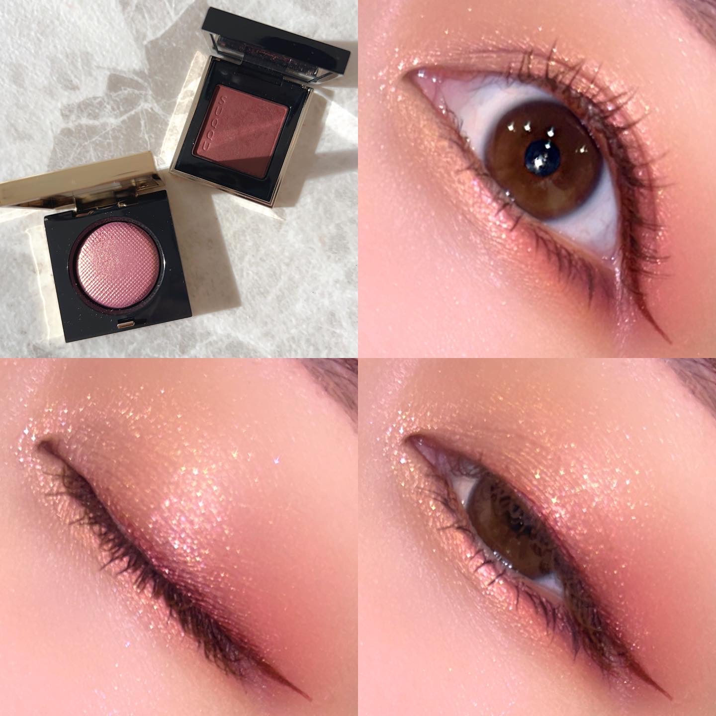 今回の新色は"まぶたに濡れたような光沢を放つ艶、光を操る立体感をプラスしリュクスなまなざしを叶えてくれる"というプリズムフォーミュラ。 確かにいつもとはちょっと違う…良いですこれ🫶❤️ ヌメッと面で光るようなツヤ感✨ テクスチャーは刻印ありタイプ、ツヤはクリームタイプに近いと思います🥰 要は刻印ありとクリームの良いとこ取りですね! ゴールドと柔らかいレッドの組み合わせ。アプレスキーとエレクトリックチェリーの中間のような色合い🤔 ゴールドとピーチカラー。今回の3色の中では一番黄みが強い。 青みがかったローズが可愛い。ぱっと見はわからないけど左上にみんな大好き青ラメが…!!