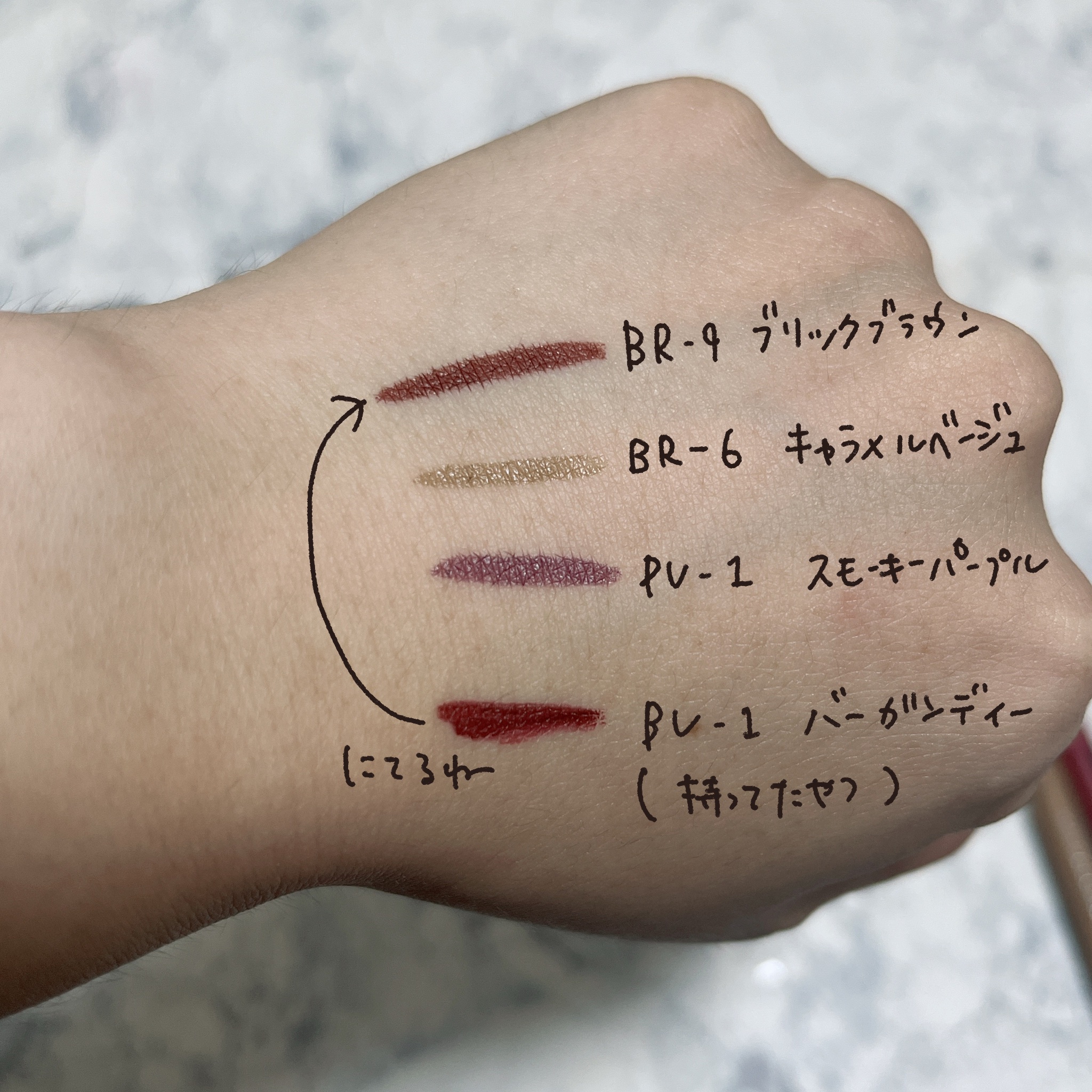 - <BR-1 やわらかな目元に ナチュラルブラウン> 水、アクリレーツコポリマーアンモニウム、BG、1,2-ヘキサンジオール、ベヘネス-30、フェノキシエタノール、ヒドロキシアセトフェノン、カプリリルグリコール、(チタン/酸化チタン)焼結物、AMP、ポリグリセリル-3ジシロキサンジメチコン、クエン酸、シメチコン、PG、ベントナイト、キサンタンガム、センチフォリアバラ花エキス、ラベンダー花エキス、ローヤルゼリーエキス、ラウリン酸ソルビタン、パルミチン酸ソルビタン、トリオレイン酸ソルビタン、ヒアルロン酸Na、カミツレ花エキス、トコフェロール、パルミチン酸スクロース、水添パーム油脂肪酸グリセリズ、アボカドエキス、[+/-]、酸化鉄、カーボンブラック <BR-2 絶妙な目ヂカラ ブラウンブラック> 水、アクリレーツコポリマーアンモニウム、BG、1,2-ヘキサンジオール、ベヘネス-30、フェノキシエタノール、ヒドロキシアセトフェノン、カプリリルグリコール、(チタン/酸化チタン)焼結物、AMP、ポリグリセリル-3ジシロキサンジメチコン、クエン酸、シメチコン、PG、ベントナイト、キサンタンガム、センチフォリアバラ花エキス、ラベンダー花エキス、ローヤルゼリーエキス、ラウリン酸ソルビタン、パルミチン酸ソルビタン、トリオレイン酸ソルビタン、ヒアルロン酸Na、カミツレ花エキス、トコフェロール、パルミチン酸スクロース、水添パーム油脂肪酸グリセリズ、アボカドエキス、酸化鉄、カーボンブラック <BR-3 ほんのり甘い ピーチブラウン> 水、アクリレーツコポリマーアンモニウム、BG、1,2-ヘキサンジオール、ベヘネス-30、フェノキシエタノール、ヒドロキシアセトフェノン、カプリリルグリコール、(チタン/酸化チタン)焼結物、AMP、ポリグリセリル-3ジシロキサンジメチコン、クエン酸、シメチコン、PG、ベントナイト、キサンタンガム、センチフォリアバラ花エキス、ラベンダー花エキス、ローヤルゼリーエキス、ラウリン酸ソルビタン、パルミチン酸ソルビタン、トリオレイン酸ソルビタン、ヒアルロン酸Na、カミツレ花エキス、トコフェロール、パルミチン酸スクロース、水添パーム油脂肪酸グリセリズ、アボカドエキス、酸化鉄、赤226、カーボンブラック <BR-4 明るくヘルシー オレンジブラウン> 水、アクリレーツコポリマーアンモニウム、BG、1,2-ヘキサンジオール、フェノキシエタノール、ベヘネス-30、ヒドロキシアセトフェノン、カプリリルグリコール、AMP、ポリグリセリル-3ジシロキサンジメチコン、クエン酸、シメチコン、PG、ベントナイト、キサンタンガム、センチフォリアバラ花エキス、ラベンダー花エキス、ローヤルゼリーエキス、ラウリン酸ソルビタン、パルミチン酸ソルビタン、トリオレイン酸ソルビタン、ヒアルロン酸Na、カミツレ花エキス、トコフェロール、パルミチン酸スクロース、水添パーム油脂肪酸グリセリズ、アボカドエキス、酸化鉄、赤226、カーボンブラック <BR-5 華やかな印象 レッドブラウン> 水、アクリレーツコポリマーアンモニウム、BG、1,2-ヘキサンジオール、ベヘネス-30、フェノキシエタノール、ヒドロキシアセトフェノン、カプリリルグリコール、AMP、ポリグリセリル-3ジシロキサンジメチコン、クエン酸、シメチコン、PG、ベントナイト、ラウリン酸ソルビタン、パルミチン酸ソルビタン、キサンタンガム、センチフォリアバラ花エキス、ラベンダー花エキス、ローヤルゼリーエキス、トリオレイン酸ソルビタン、ヒアルロン酸Na、カミツレ花エキス、トコフェロール、パルミチン酸スクロース、水添パーム油脂肪酸グリセリズ、アボカドエキス、赤226、コンジョウ、カーボンブラック <BU-1 目元に色っぽさ バーガンディー> 水、アクリレーツコポリマーアンモニウム、BG、1,2-ヘキサンジオール、ベヘネス-30、フェノキシエタノール、ヒドロキシアセトフェノン、カプリリルグリコール、AMP、ポリグリセリル-3ジシロキサンジメチコン、クエン酸、シメチコン、PG、ベントナイト、ラウリン酸ソルビタン、パルミチン酸ソルビタン、キサンタンガム、センチフォリアバラ花エキス、ラベンダー花エキス、ローヤルゼリーエキス、トリオレイン酸ソルビタン、ヒアルロン酸Na、カミツレ花エキス、トコフェロール、パルミチン酸スクロース、水添パーム油脂肪酸グリセリズ、アボカドエキス、赤226、コンジョウ、カーボンブラック <NV-2 ポップなスモーキーブルー> 水、アクリレーツコポリマーアンモニウム、BG、1,2-ヘキサンジオール、フェノキシエタノール、ベヘネス-30、ヒドロキシアセトフェノン、カプリリルグリコール、AMP、ポリグリセリル-3ジシロキサンジメチコン、クエン酸、シメチコン、PG、ベントナイト、ラウリン酸ソルビタン、パルミチン酸ソルビタン、キサンタンガム、センチフォリアバラ花エキス、ラベンダー花エキス、ローヤルゼリーエキス、トリオレイン酸ソルビタン、ヒアルロン酸Na、カミツレ花エキス、トコフェロール、パルミチン酸スクロース、