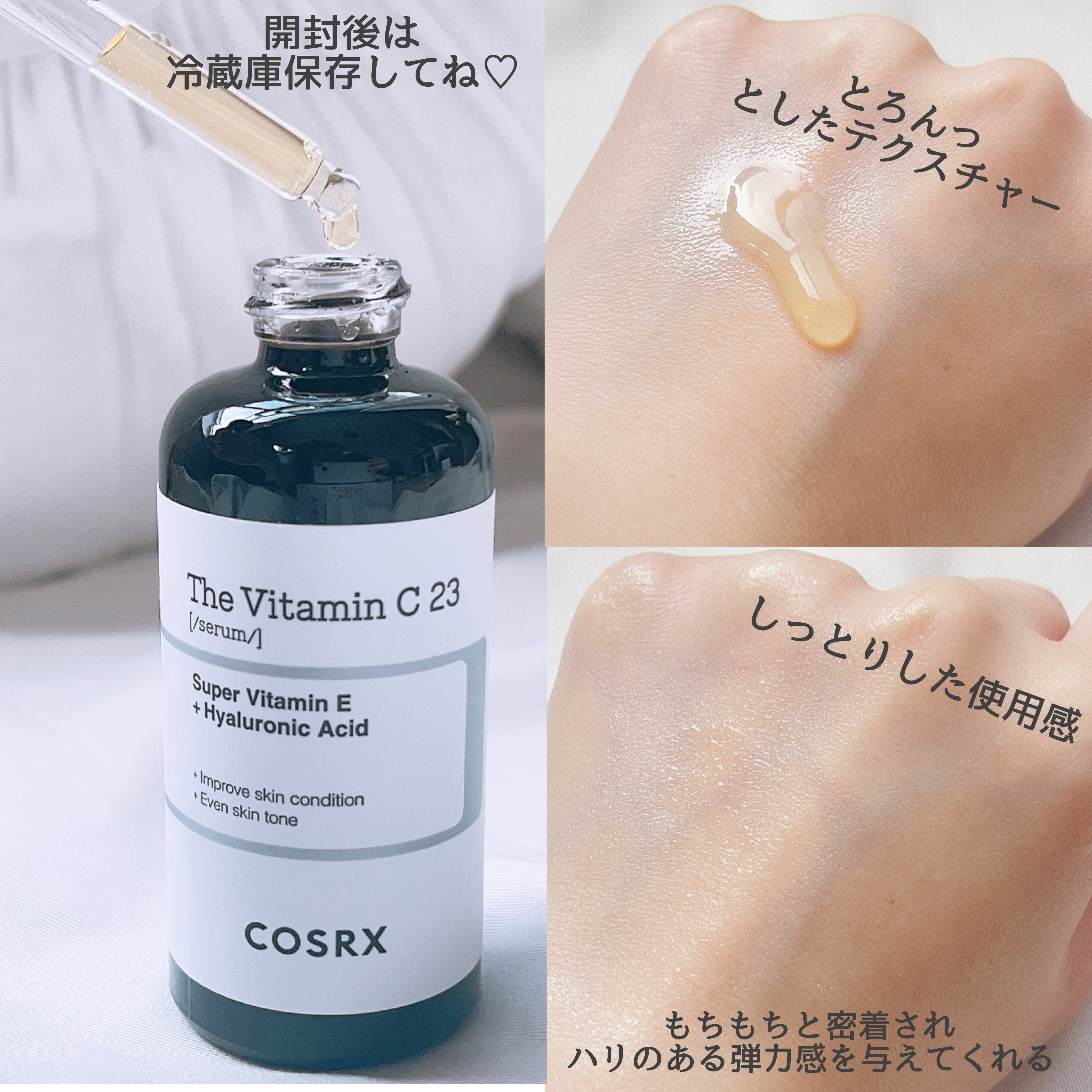 COSRXのRXザ・ビタミンC23セラムはよく聞くビタミン誘導体というものより強力な純粋ビタミンC2が23%も。 毛穴縮小、色素沈着(肌のトーン)改善…数えきれないほど良いことたくさんありました♪ 効果は抜群ですが低刺激なので肌が敏感になっている時でもピリピリしたりはありませんでしたよ。