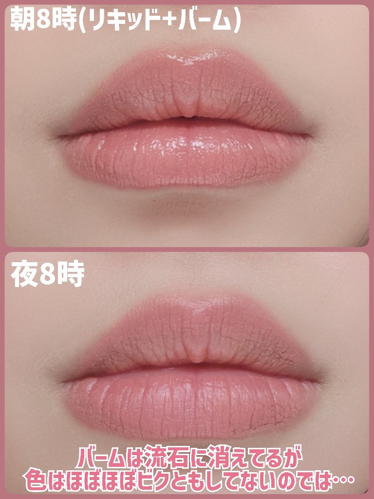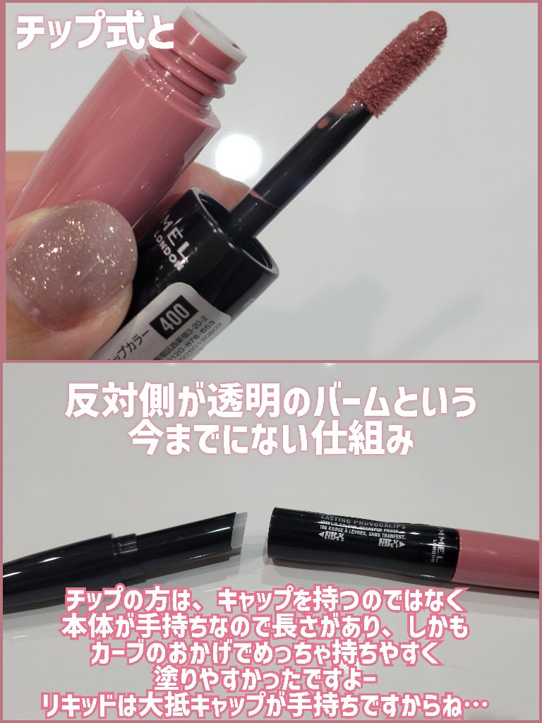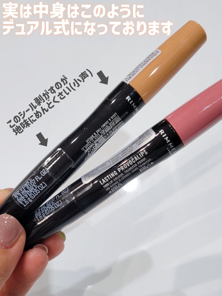 美発色リキッドリップ×バーム状リップコートの2in1。 リキッドリップは発色がよく、単体だとマット、リップコートを塗るとツヤが可愛いです。 発色が良く、落ちにくいリップを探している方におすすめ。