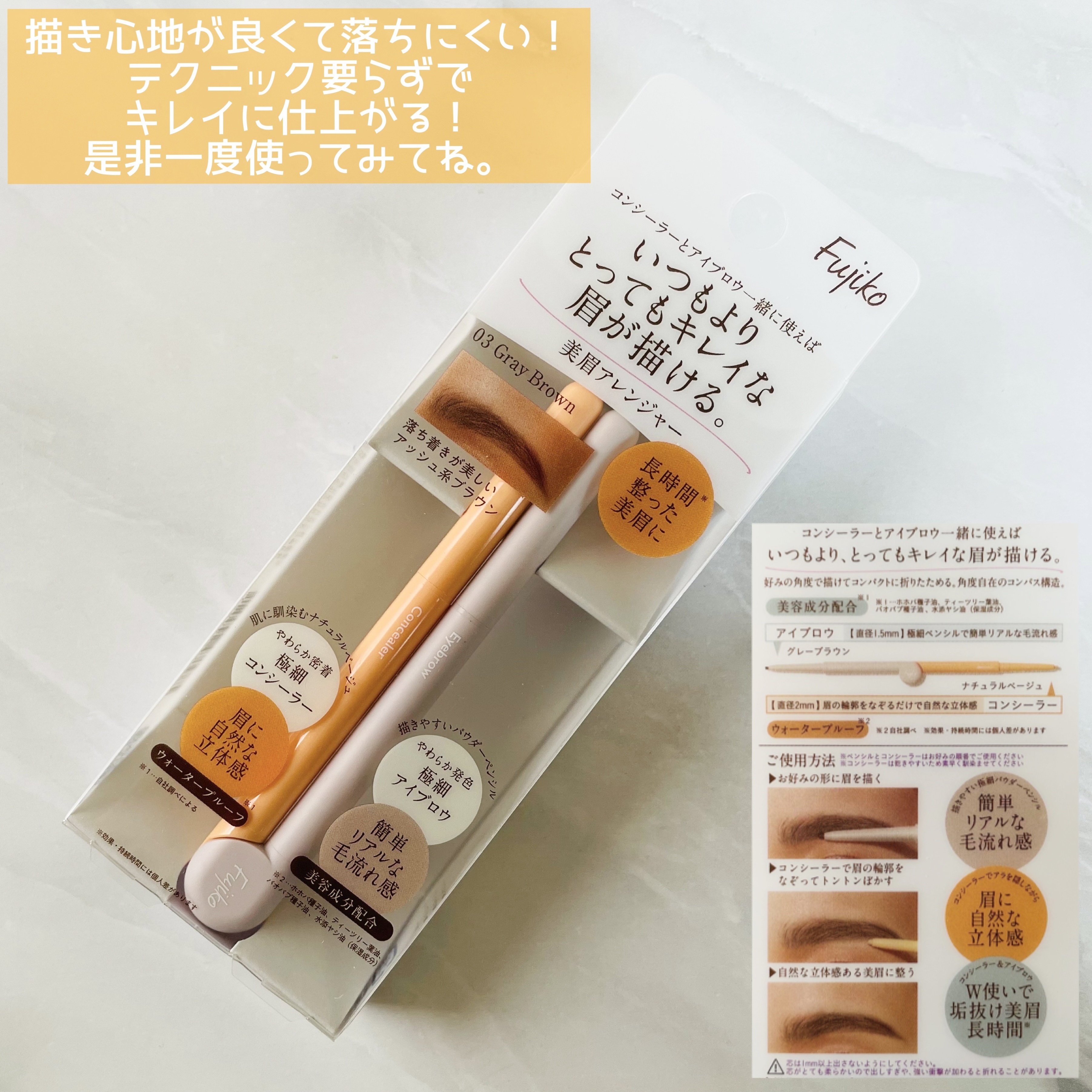 - コンシーラーとアイブロウ一緒に使えば “いつもよりとってもキレイな眉が描ける。” フジコの新作美眉アイテムは、コンシーラーとアイブロウのWエンド! アイブロウとコンシーラーを一緒に使うことで、不思議なほどに簡単に美眉が整います。 ・アイブロウ(直径1.5mm) 描きやすい極細パウダーペンシルで 簡単リアルな毛流れ感。 眉毛思いの美容成分配合※1 ※1…ホホバ種子油、ティーツリー葉油、バオバブ種子油、水添ヤシ油(保湿成分) ・コンシーラー(直径2mm) やわらかに密着する極細コンシーラー。 眉の輪郭をなぞるだけで自然な立体感。 汗・水・皮脂に強いウォータープルーフ※2 ※2…自社調べによる。 ※効果・持続時間には個人差があります 好みの角度で描けてカチカチとコンパクトに折りたためる角度自在のコンパス構造。 まるでコンパスのような特殊形状はフジコらしい遊び心満載。 描きやすい極細コンシーラーと極細アイブロウW使いなら リアルな毛流れ感+自然な立体感でいつもよりとってもキレイな眉に。 \なぞるだけ! 瞬間、驚きの3D美眉/ 【美眉アレンジャーの使い方】 1・お好みの形に眉を描く 2・コンシーラーで眉の輪郭をなぞってトントンぼかす 3・完成!リアルな毛流れ感と自然な立体感ある美眉に整う。 ※ペンシルとコンシーラーはお好みの順番でご使用ください ※コンシーラーは乾きやすいため素早く馴染ませてください