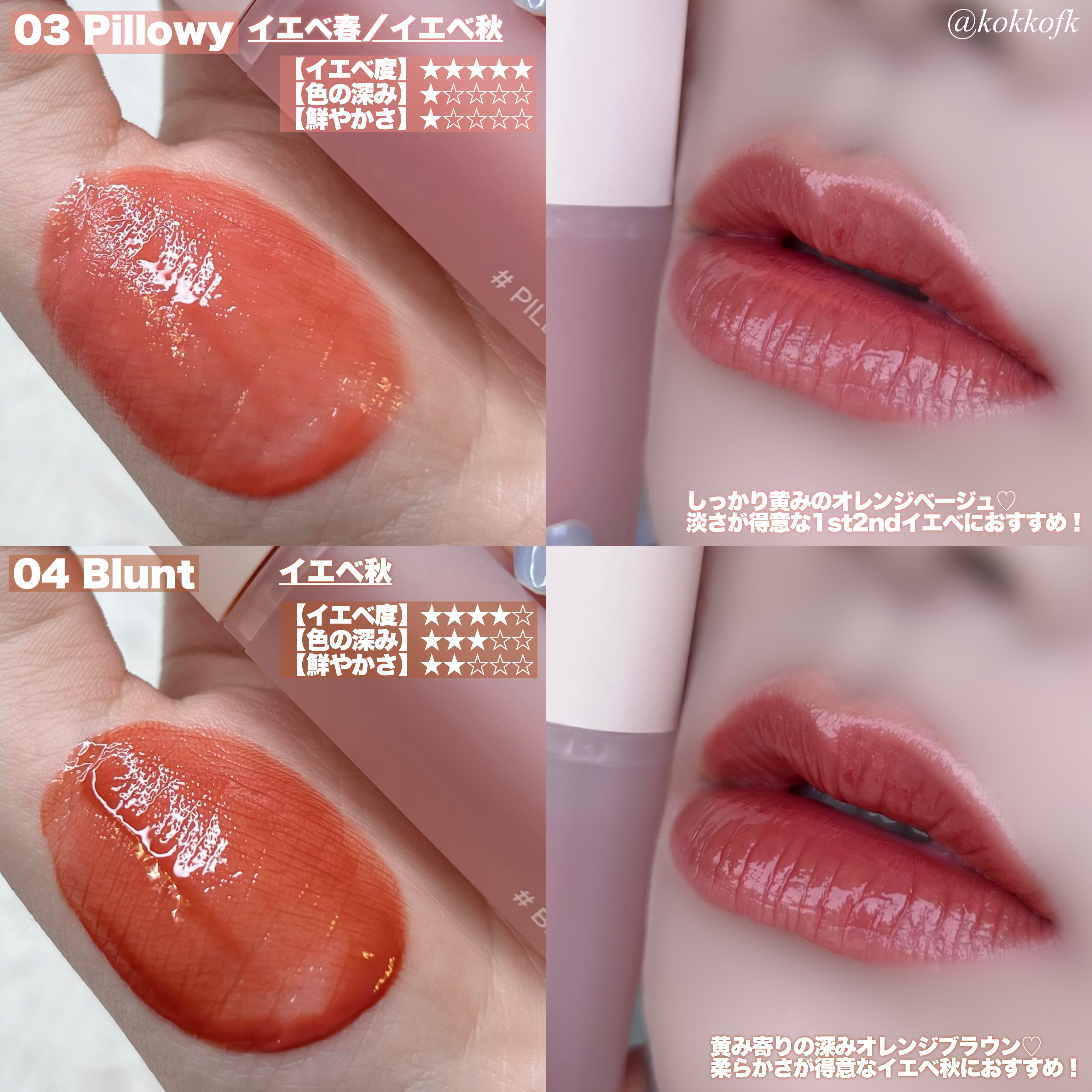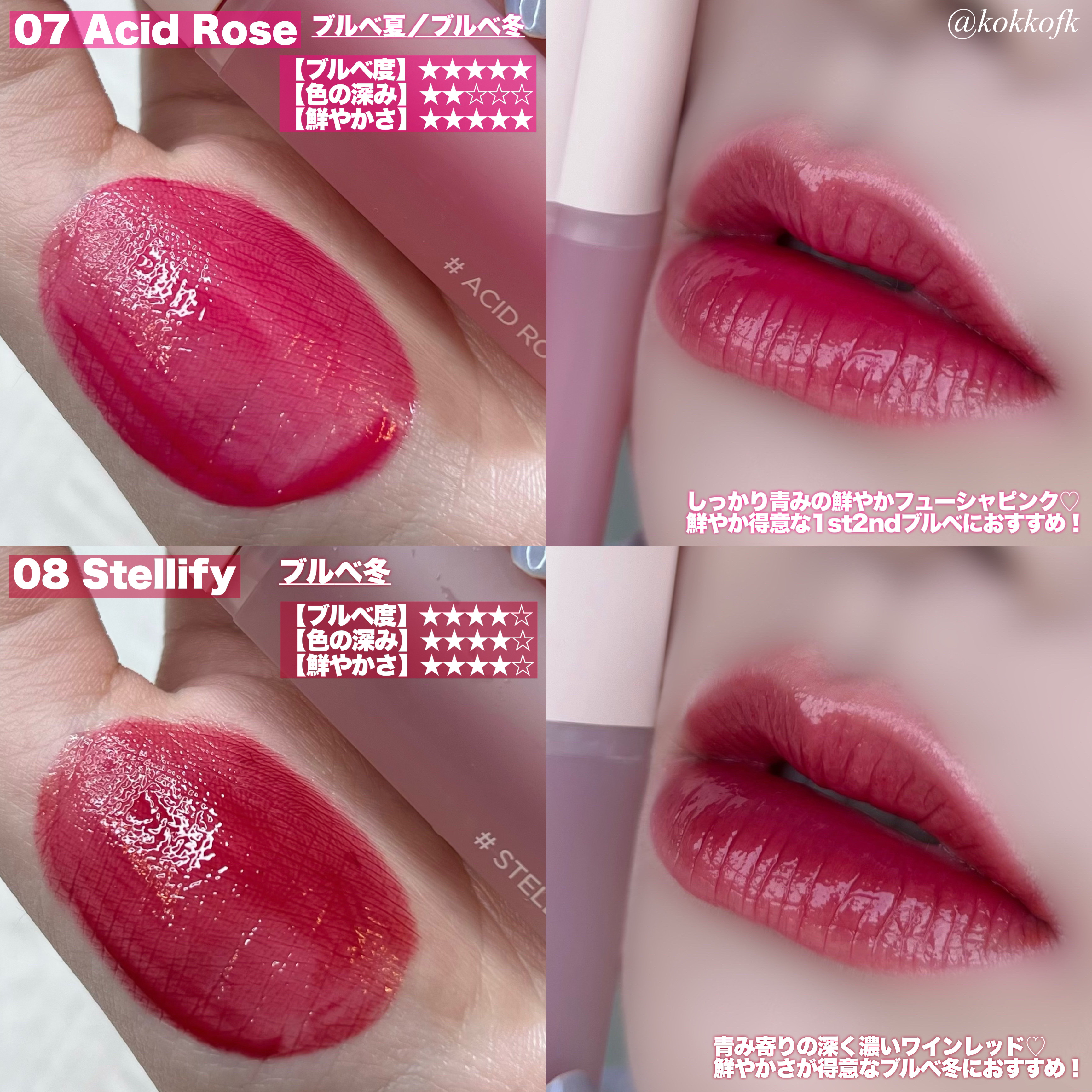 既存のジューシーラスティングティントよりさらに軽いツヤ感が魅力の新作ティント! 色選びの参考にしてね! やや黄みの明るいオレンジコーラル鮮やか得意なイエベ春におすすめ! 黄みの明るくまろやかなオレンジベージュ黄みが得意なイエベ春におすすめ! 青み黄み中間なくすみピンクベージュブルベ夏やイエベ春におすすめ 黄みの深くて鮮やかなオレンジレッド鮮やか得意なイエベ秋におすすめ! 青みの鮮やかで明るいビビッドピンク明るさ得意なブルベ冬やブルベ夏におすすめ! 青みの明るめで柔らかいローズピンクブルベ夏やブルベ冬におすすめ! 青み黄み中間な鮮やかで強いビビッドレッド2ndイエベ春のブルベ冬におすすめ! 青みの強い深くて鮮やかなベリーレッド2nd夏で鮮やか得意なブルベ冬におすすめ!